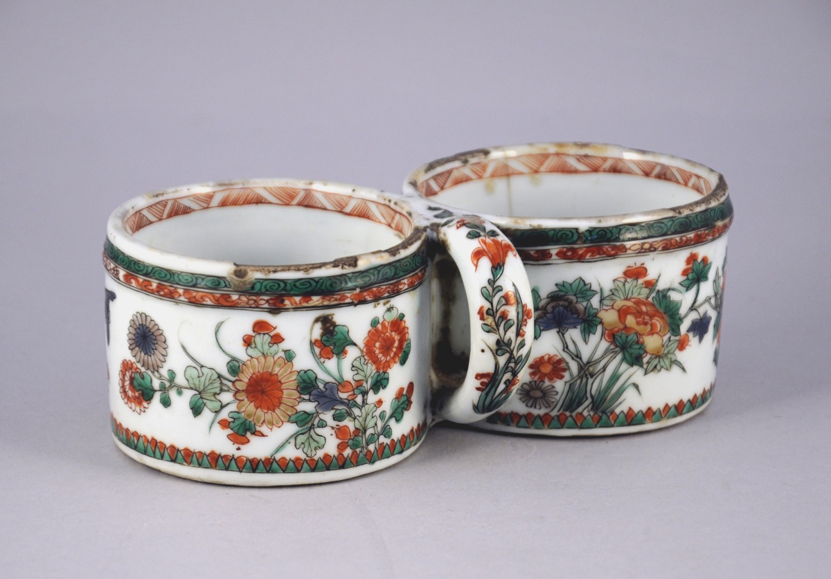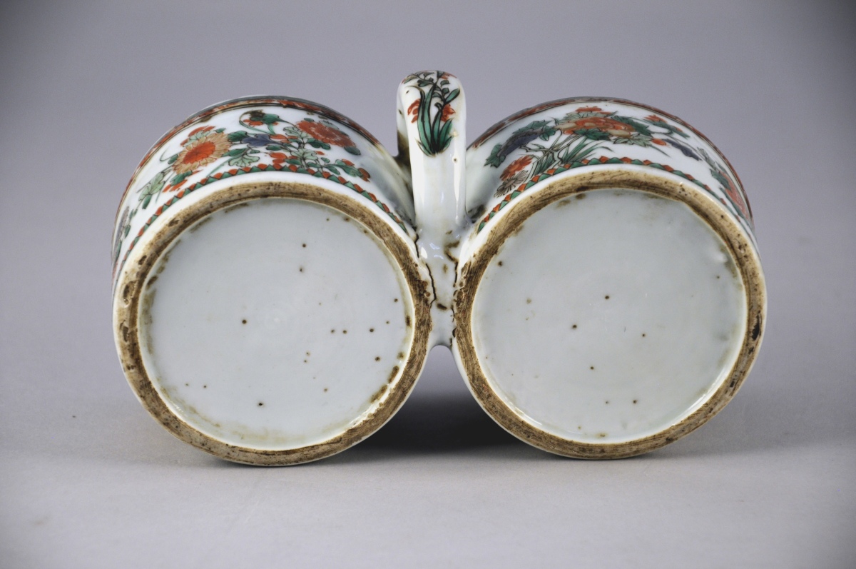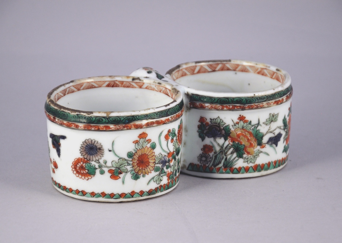 CHINE. PORTE HULIER-VINAIGRIER en porcelaine à décor floral polychrome et or animé d'oiseaux.
