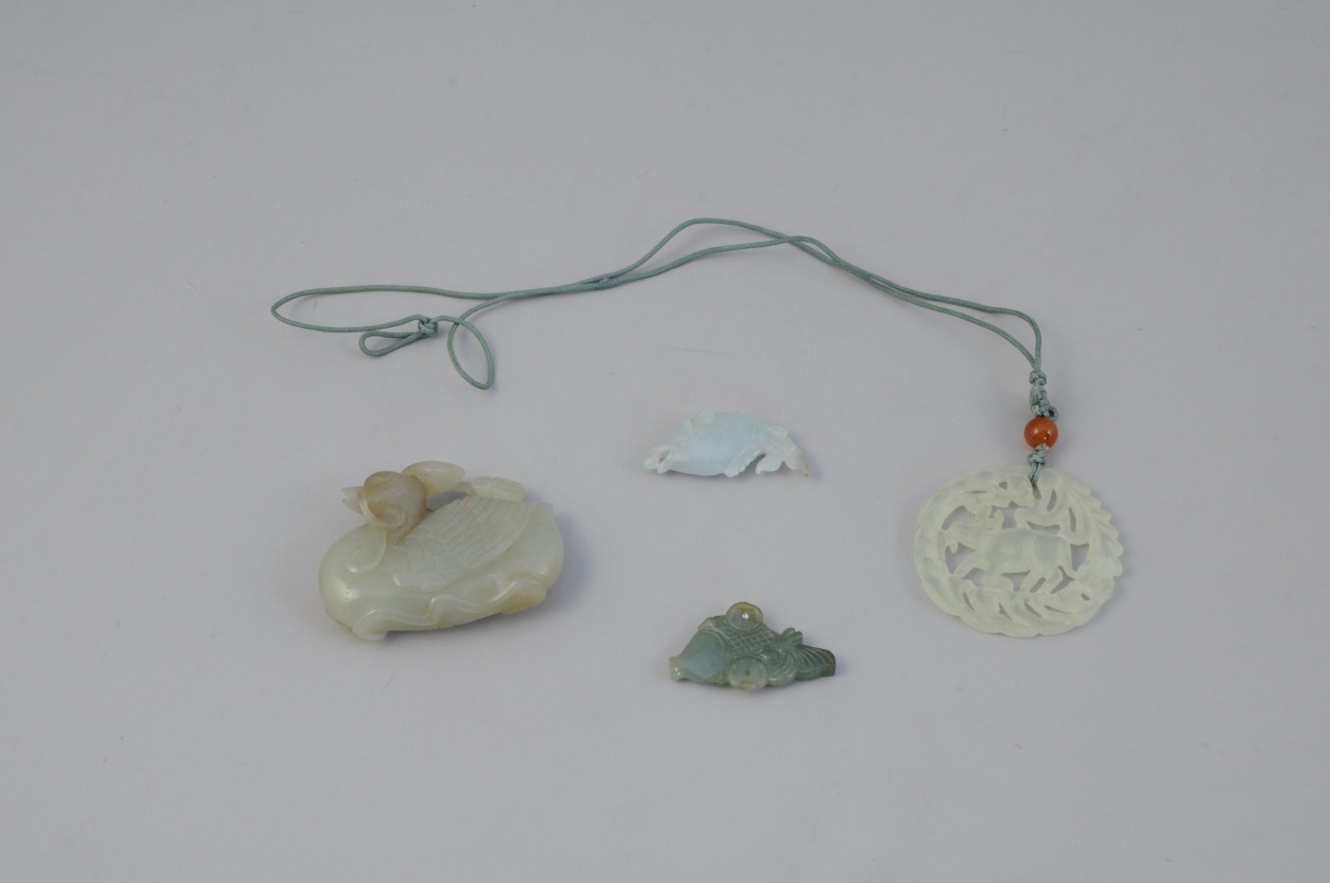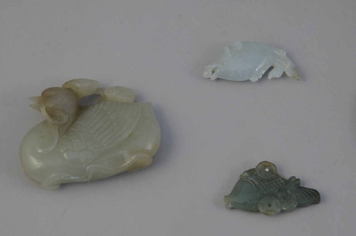 - Canard sculpté tenant en son bec un rameau ajouré en néphrite. Haut. 5, Long. 6,5 cm.