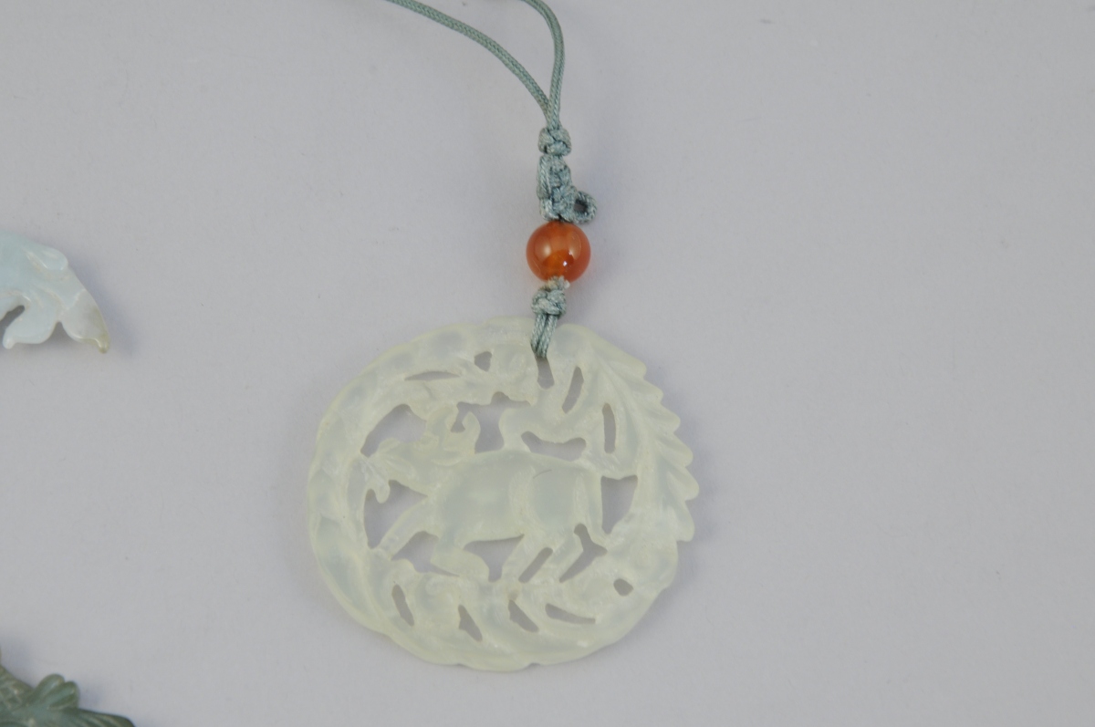 - Pendentif de forme ronde ajouré de rinceaux et d'un taureau en serpentine. Diam. 5cm.