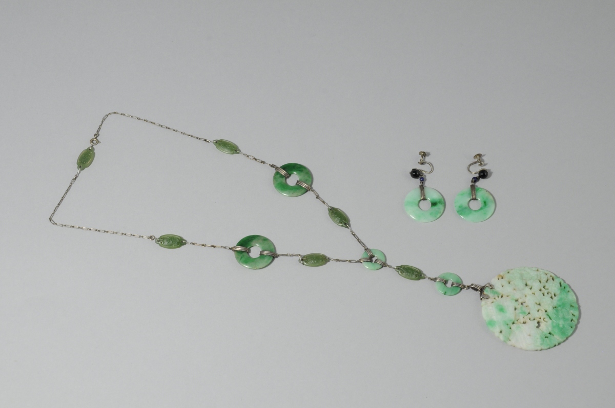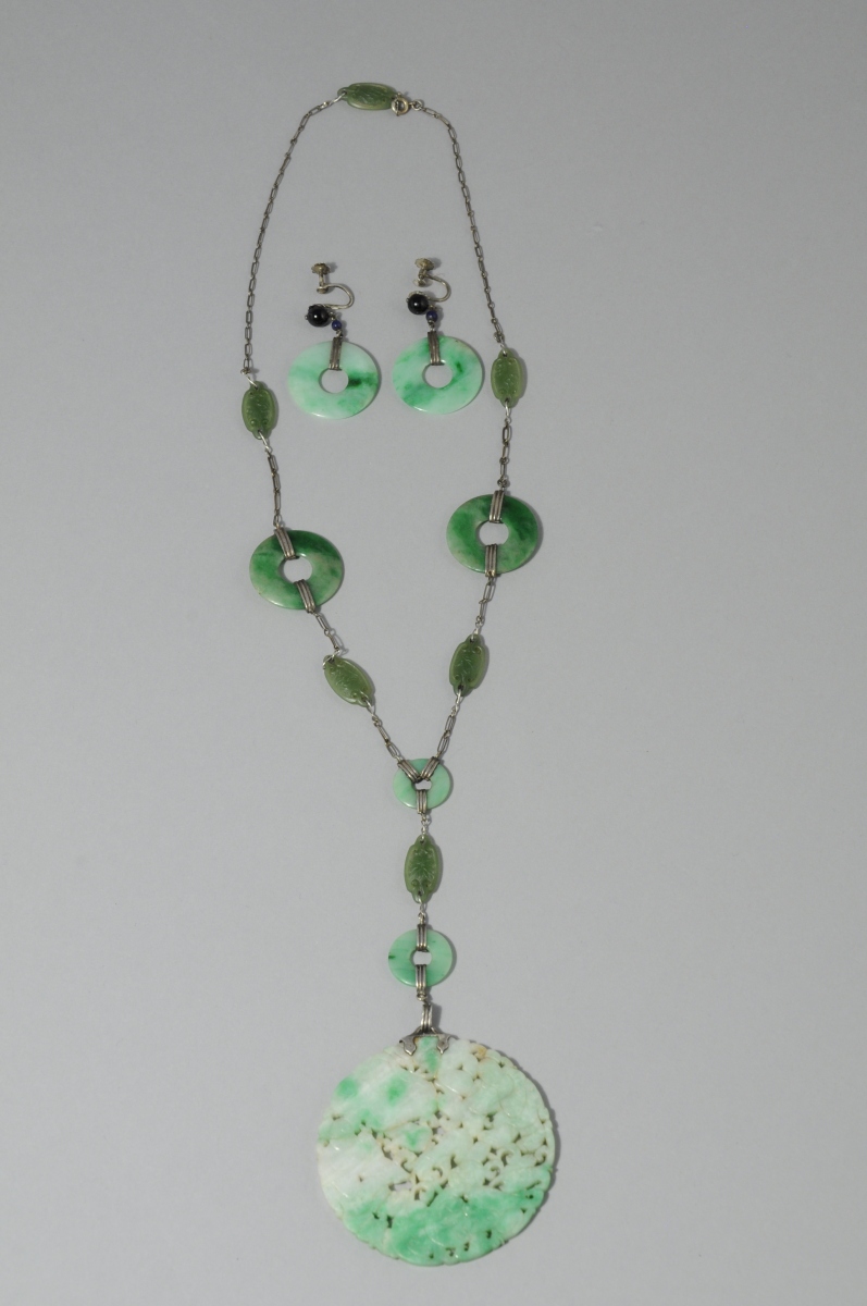 CHINE. PARURE EN JADEITE : PENDENTIF de forme ronde ajouré de motifs feuillagés et de deux personnages et paire de BOUCLES D'OREILLES.