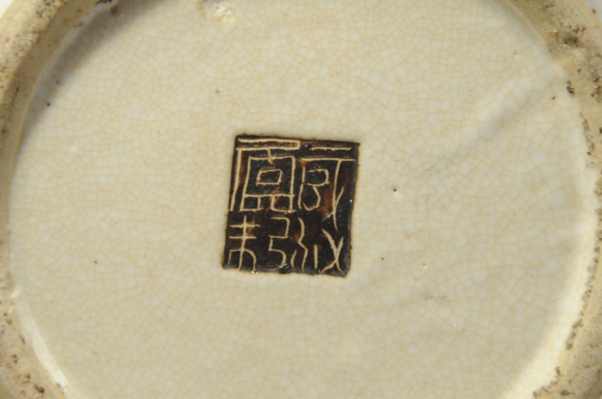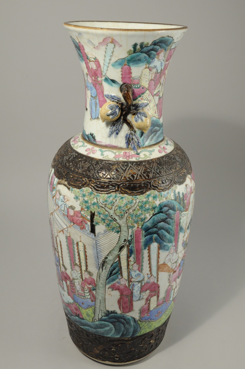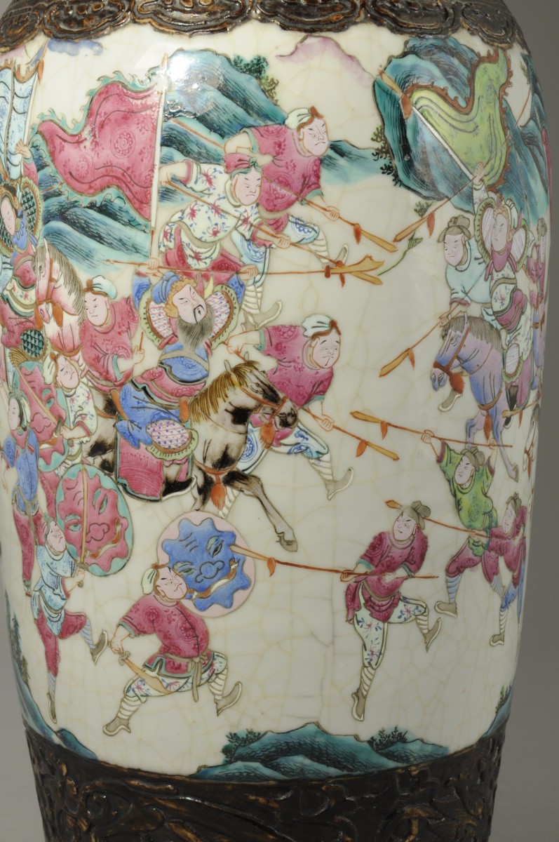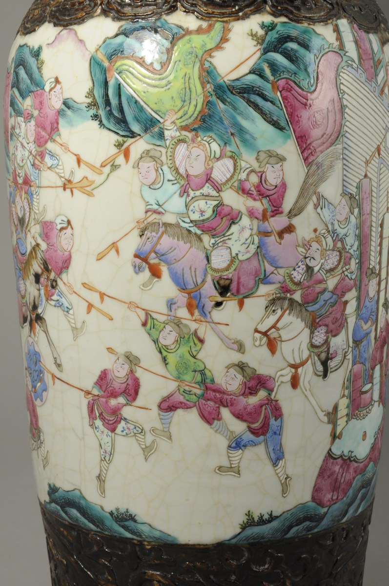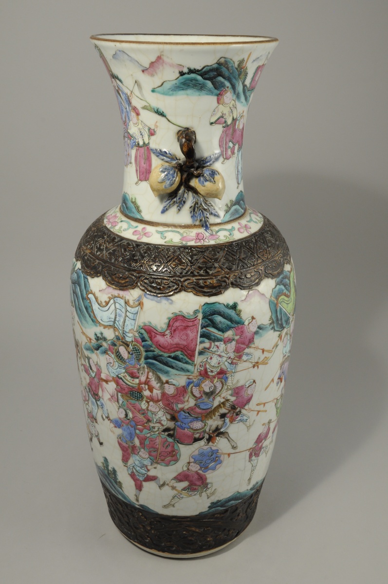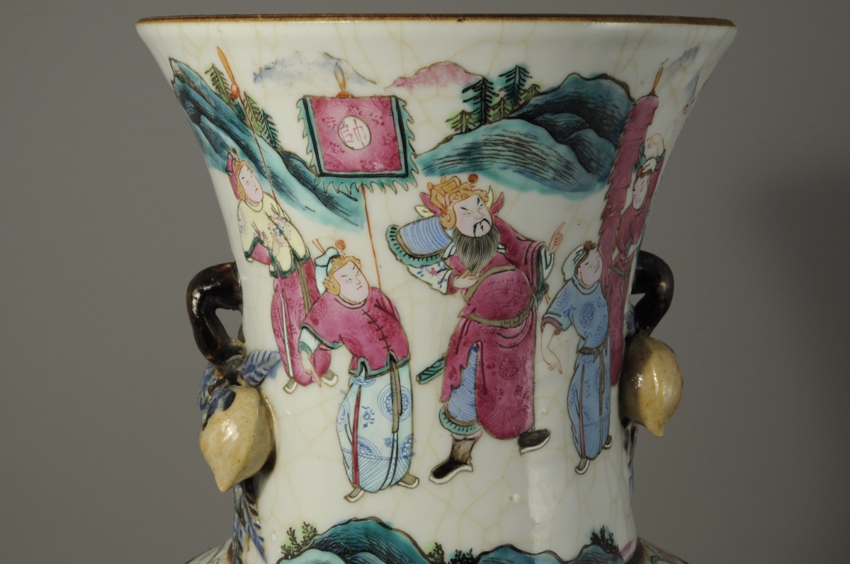 CHINE. Grand VASE ROULEAU en porcelaine à décor polychrome de scènes de combat, encadrées en haut et en bas par deux frises feuillagées brunes. Le col orné de deux personnages sur le trône. Les anses à prise en forme de citron. Signé.