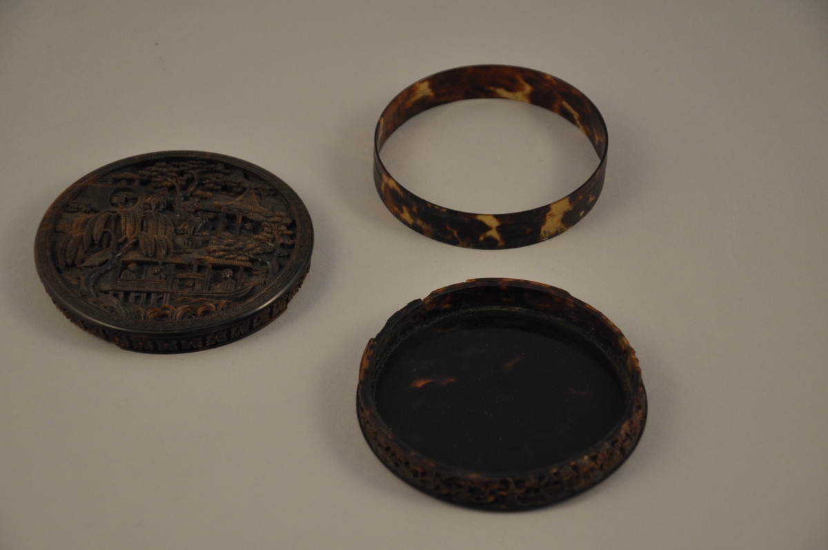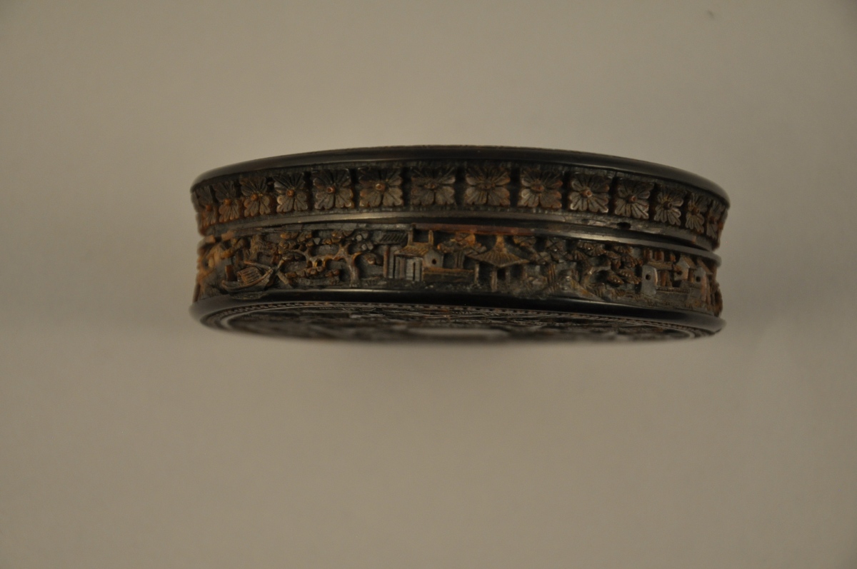CHINE. BOÎTE EN ÉCAILLE de forme circulaire sculptée en bas-relief .