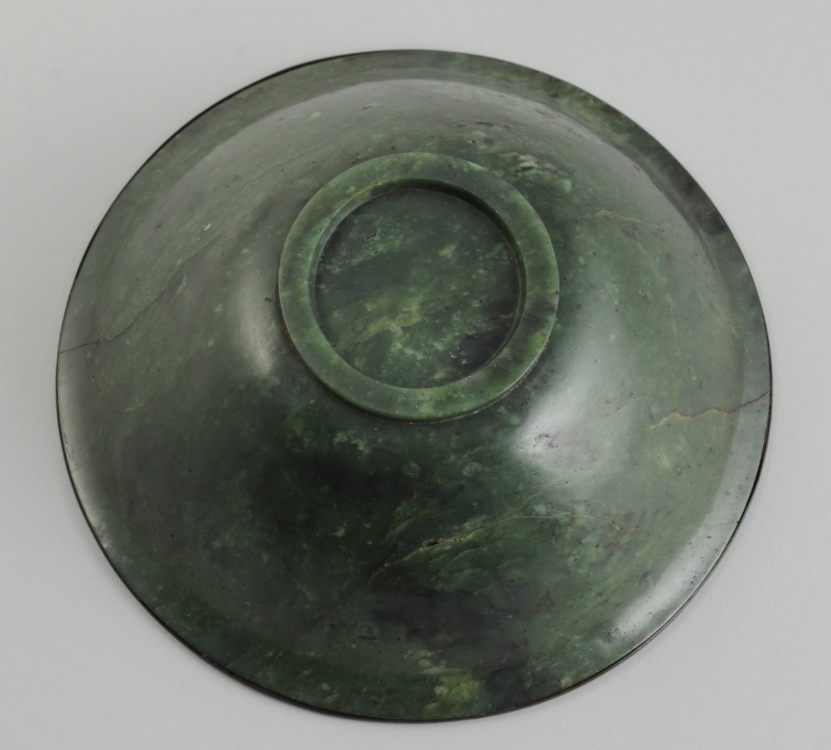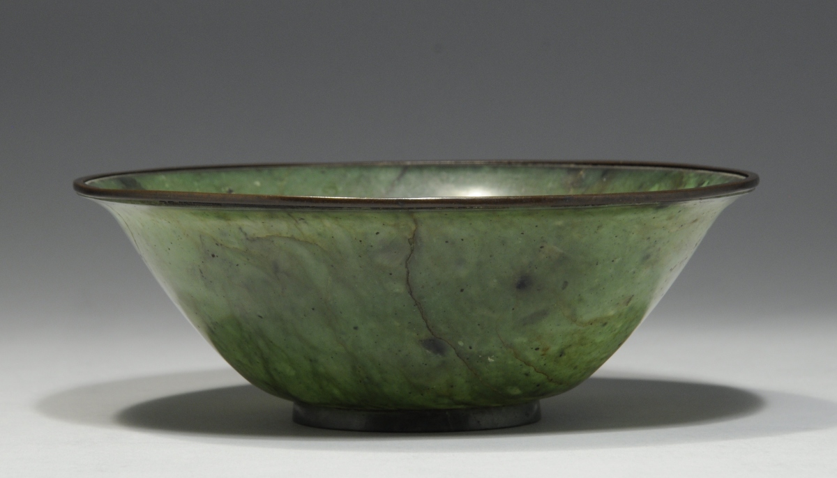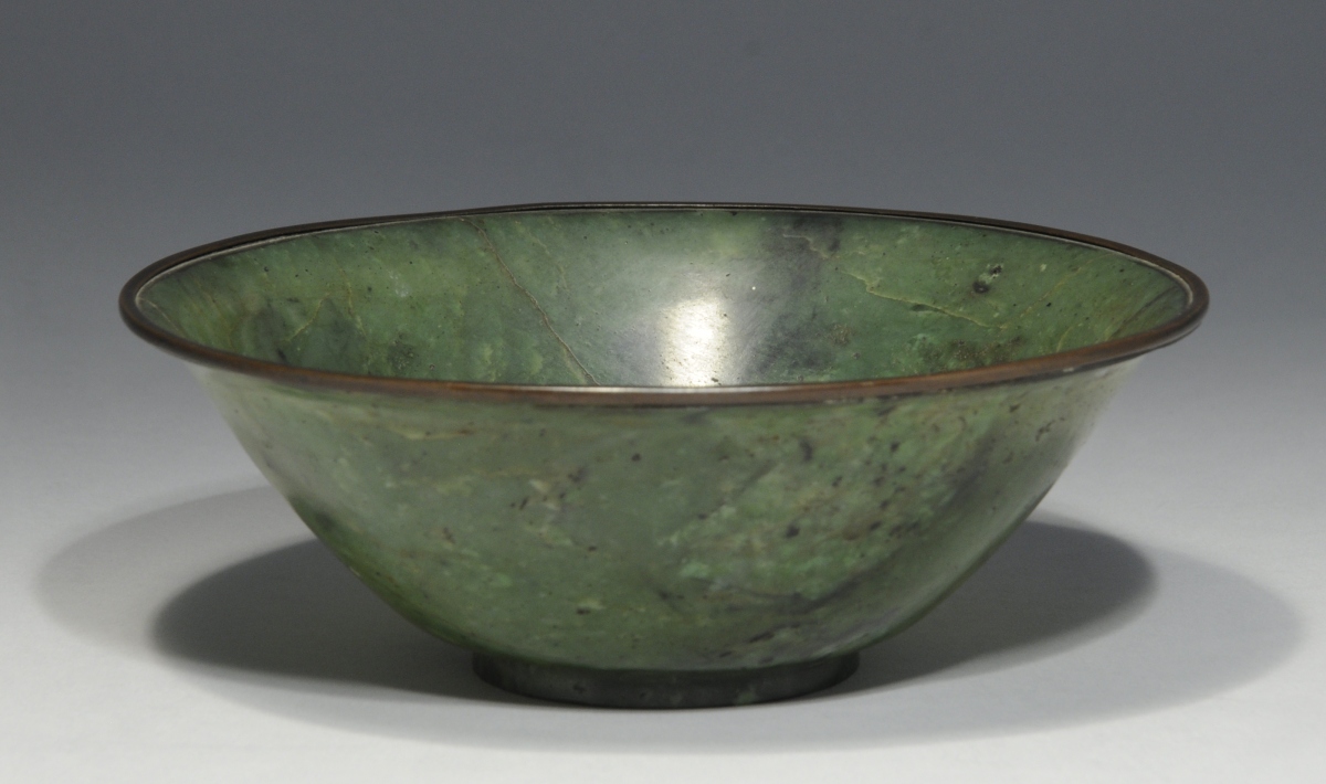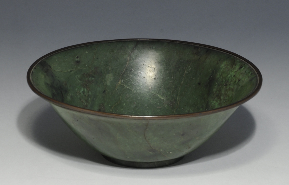 CHINE. BOL à bords évasés en néphrite vert épinard. Le col cerclé de métal.
