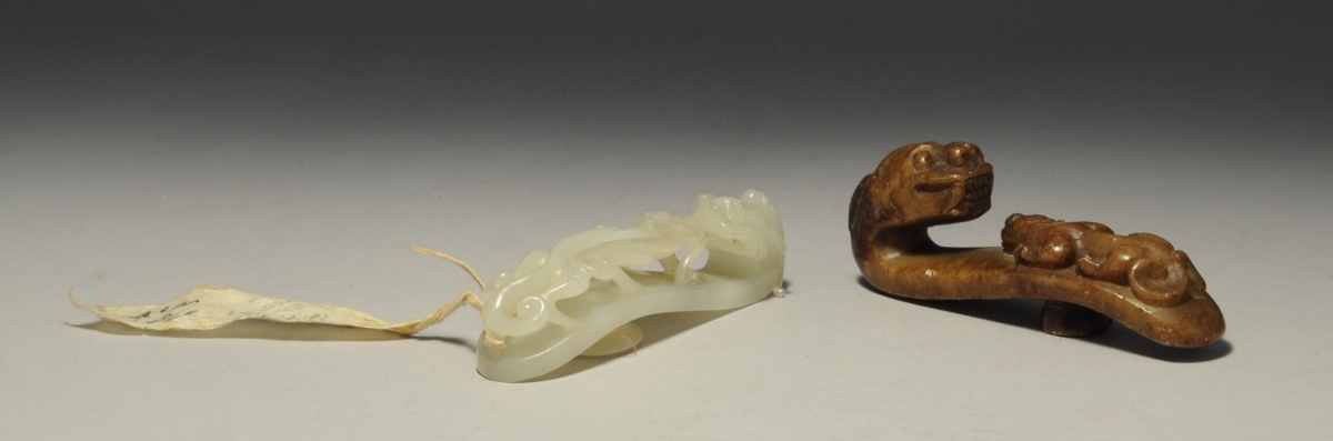 CHINE. FIBULE en néphrite en forme de dragon à décor sculpté en relief et détaché de qilong.