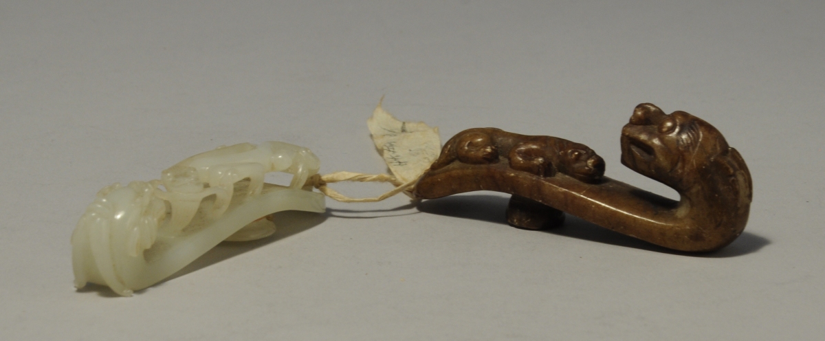 JOINT : CHINE. FIBULE en stéatite en forme de dragon à décor sculpté en relief et détaché de qilong. XIXe. Long. 8,5 cm.