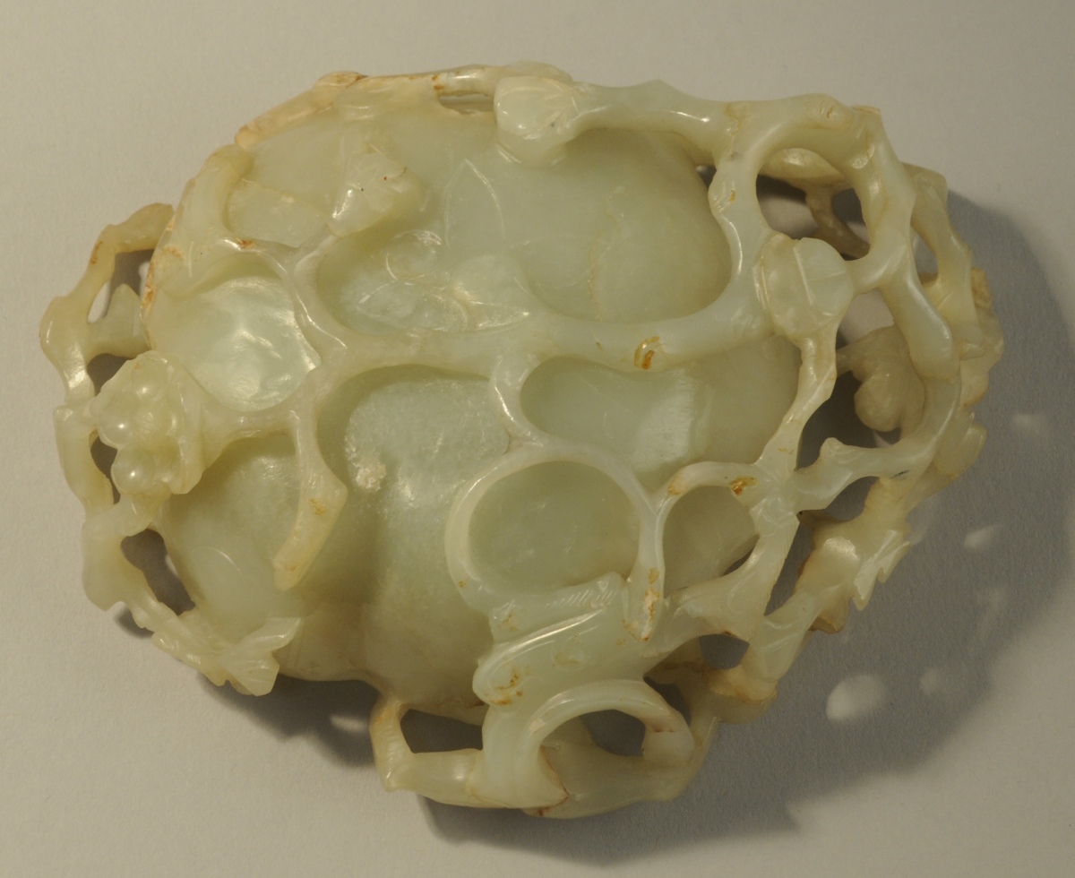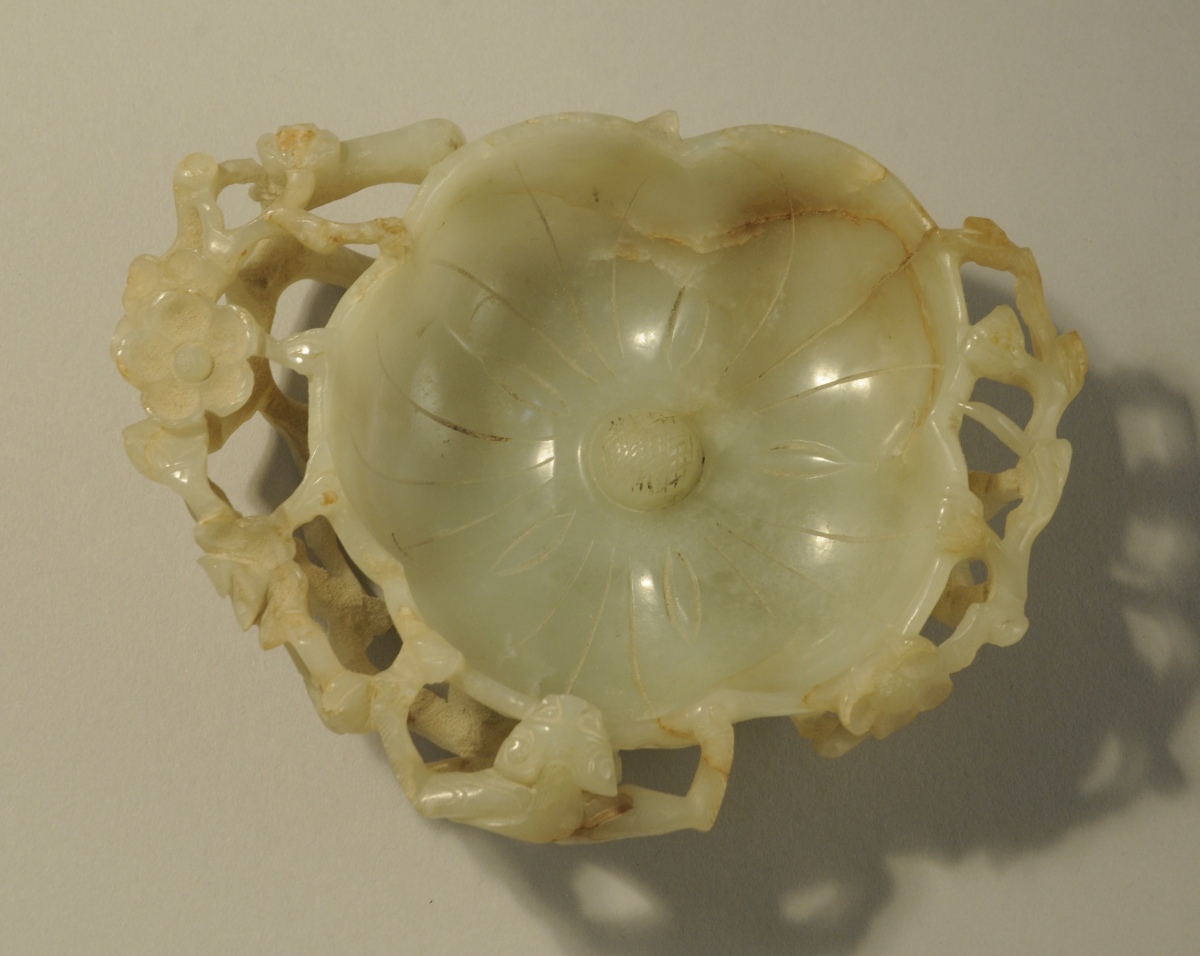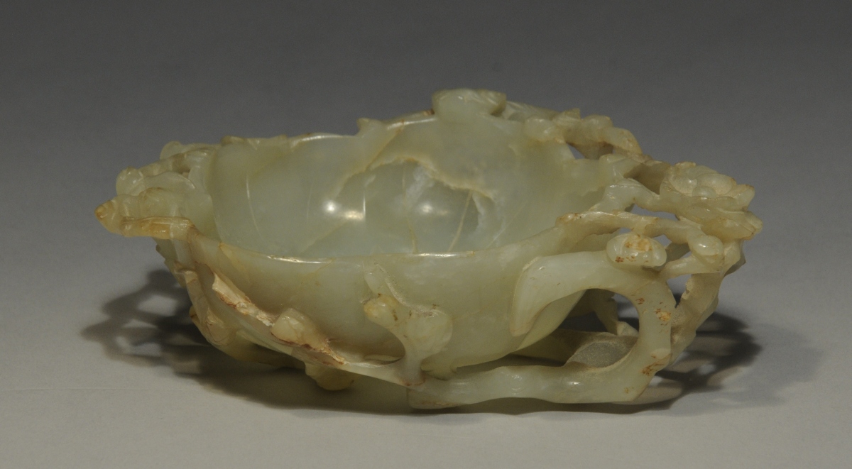 CHINE. LAVE-PINCEAUX en forme de fleur en néphrite à décor sculpté et détaché de branches de prunier fleuries et d'un qilong sur le rebord de la coupe.