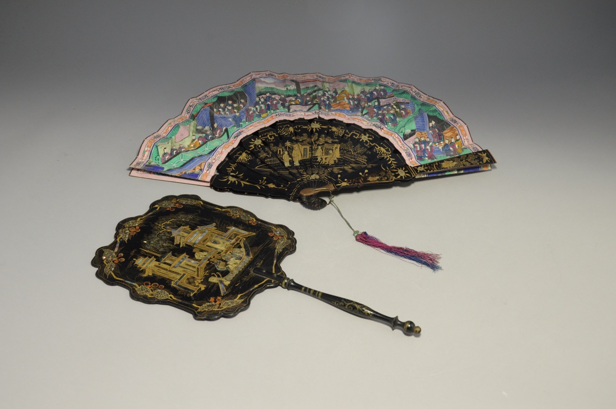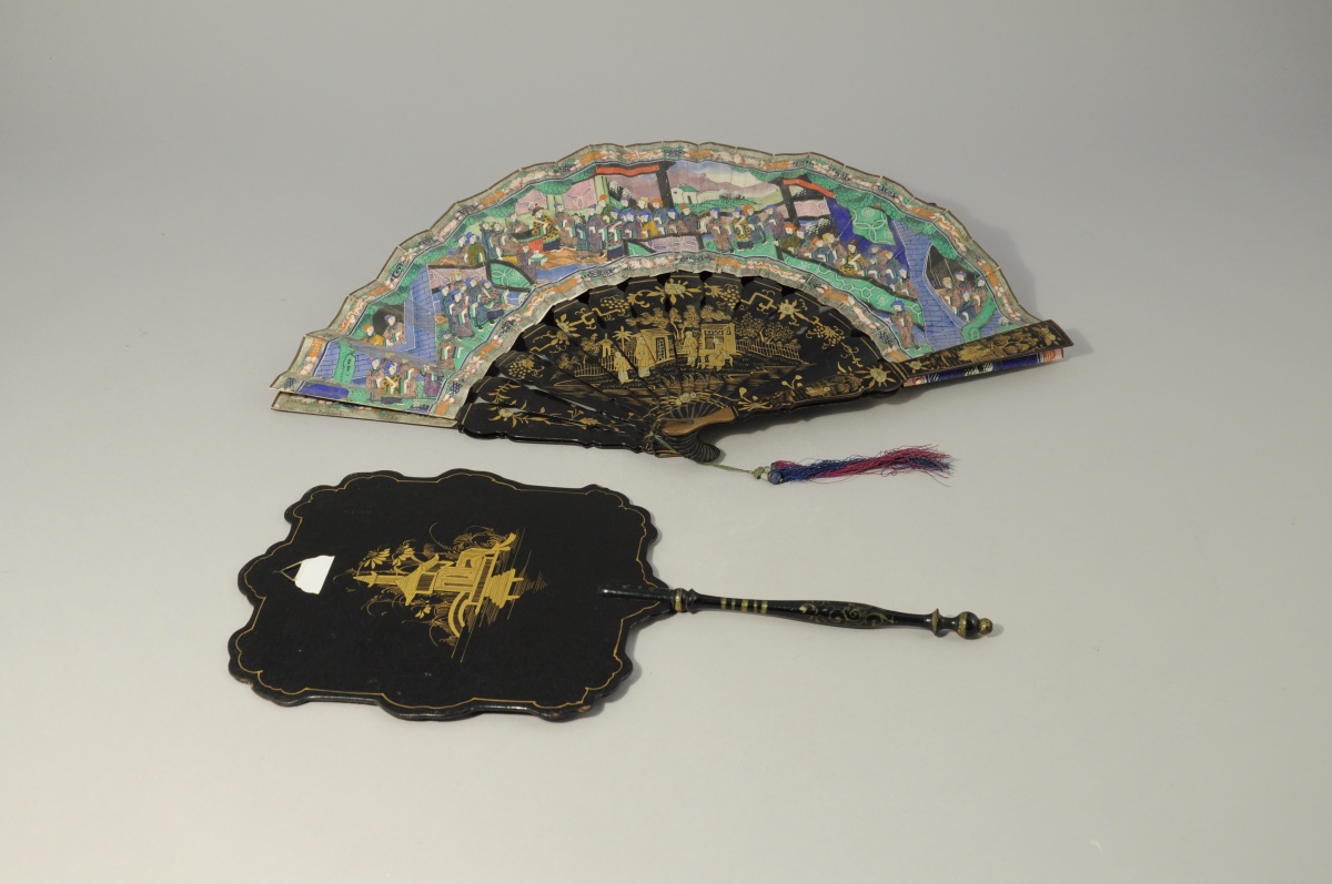 JOINT : CHASSE-MOUCHES de forme mouvementée en bois laqué noir a décors de personnages devisant dans une barque. Extrême Orient, XIX-XXe. Haut. 41 cm.