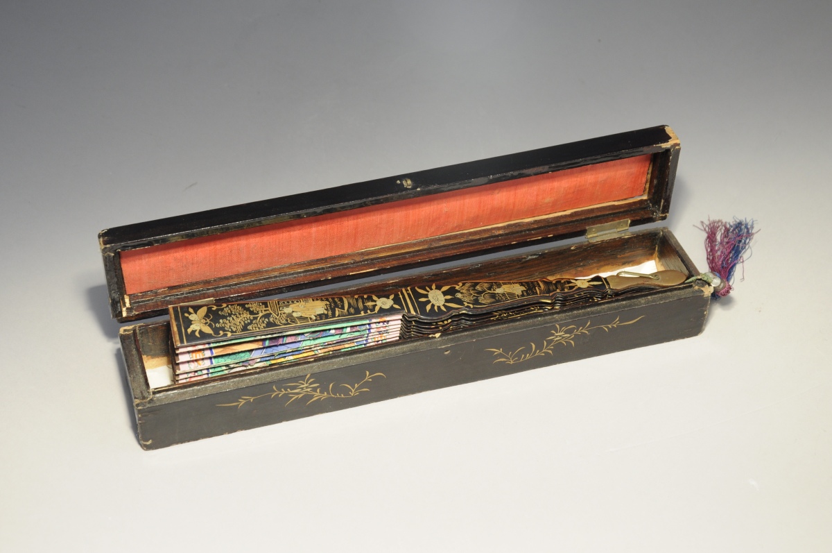 CHINE. ÉVENTAIL à 16 feuilles en bois laqué noir et or de scènes de jardins, figurant au recto et au verso une cérémonie à la Cour de l'Empereur avec une centaine de personnage aux visages rehaussés d'une petite plaque de nacre peinte.
