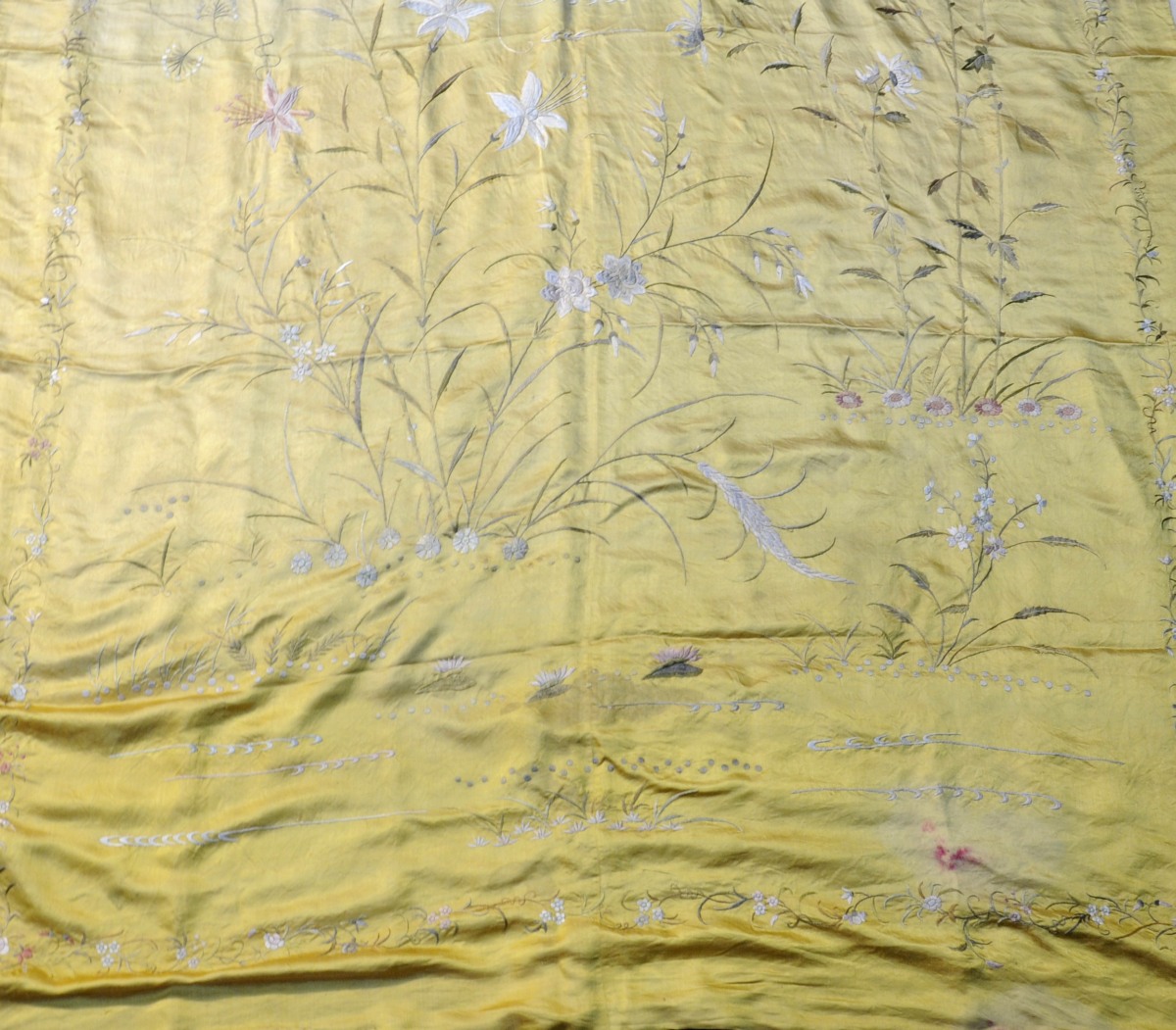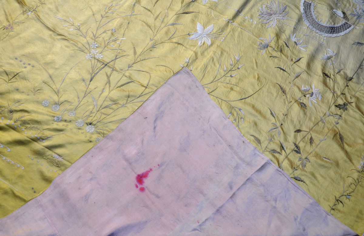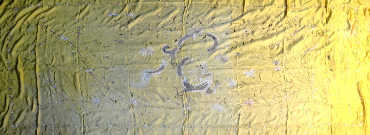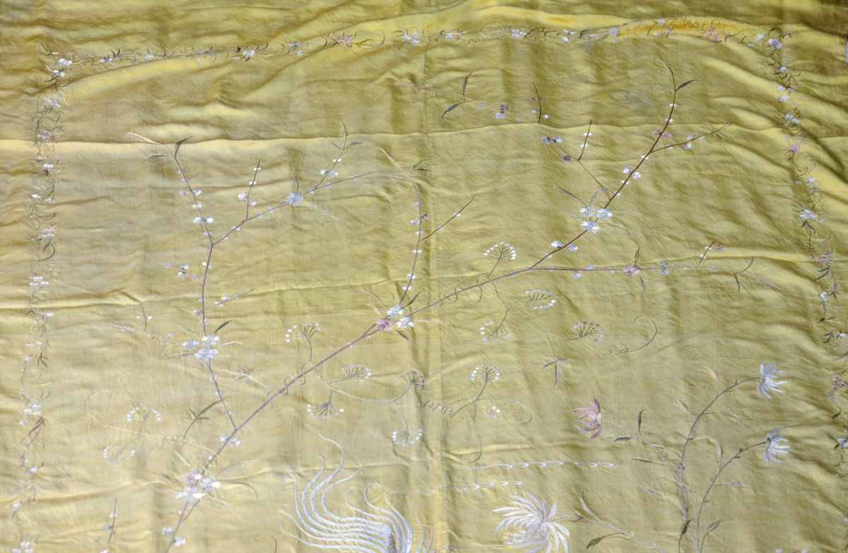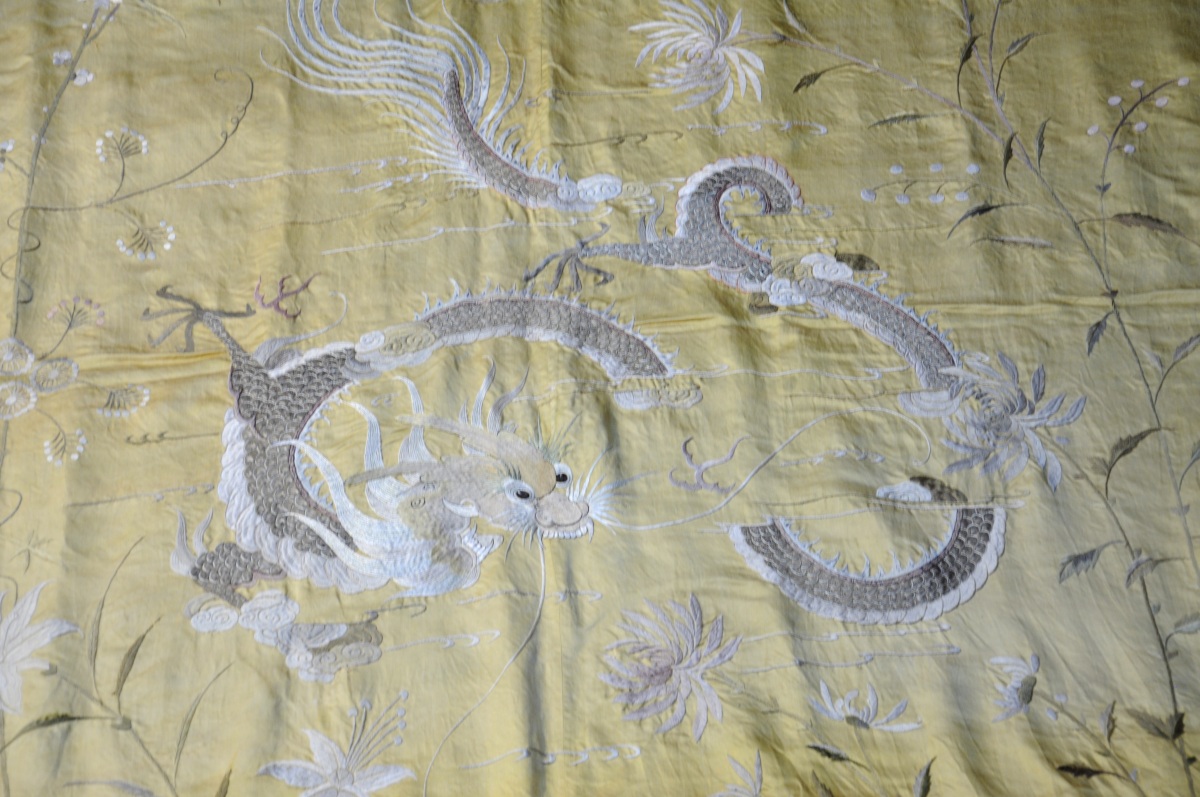 CHINE. Grande BRODERIE en soie jaune ornée d'un dragon à cinq griffes.