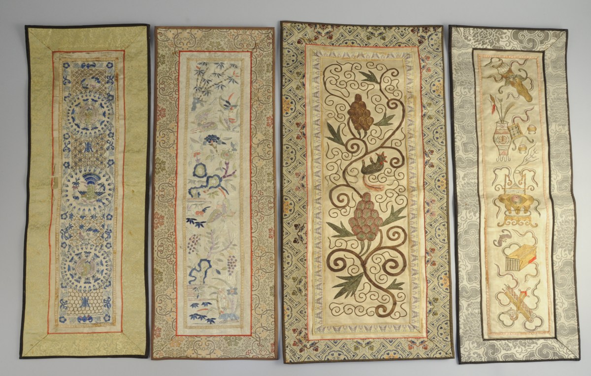 - 4 BANDES DE MANCHES avec phénix, papillons, fruits, mangouste et décor à l'échantillon, et un - CARRÉ DE SOIE à scène de palais.