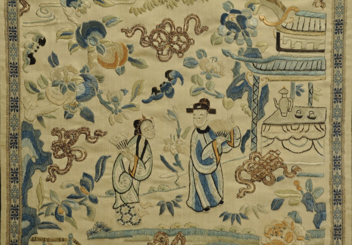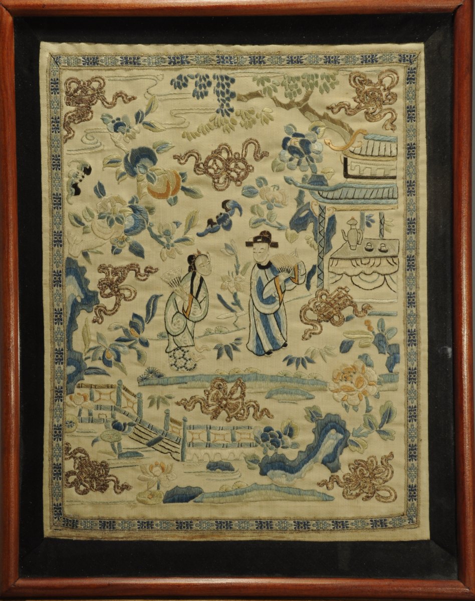 CHINE. 5 BRODERIES, soie et fils précieux :