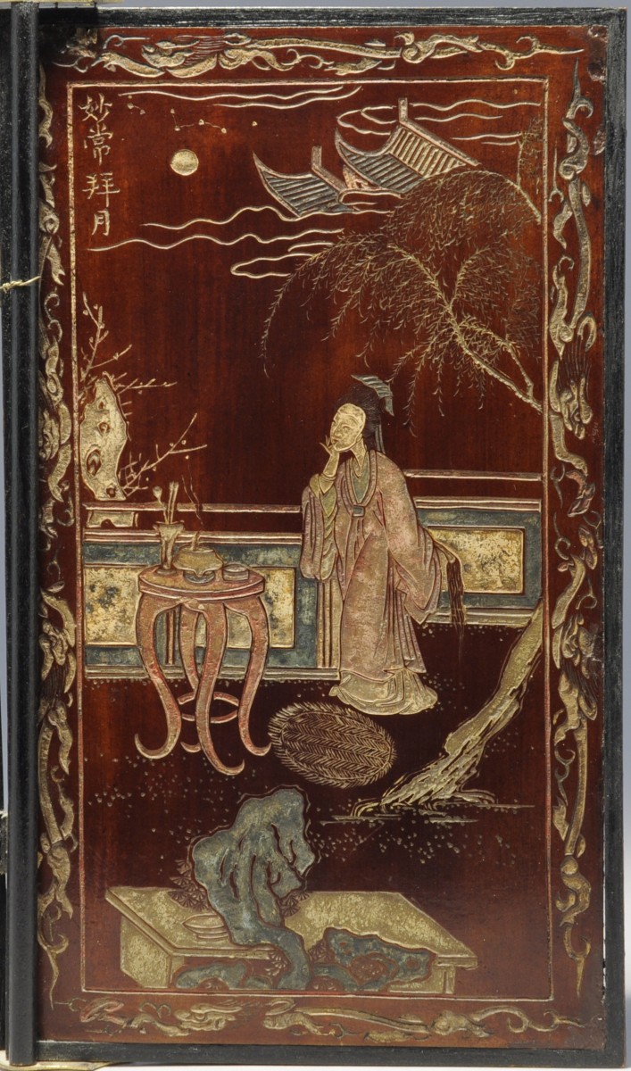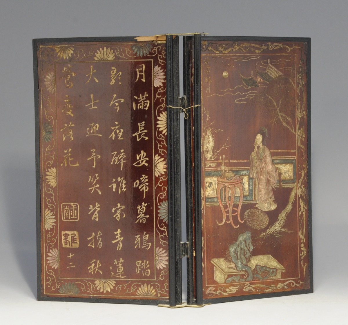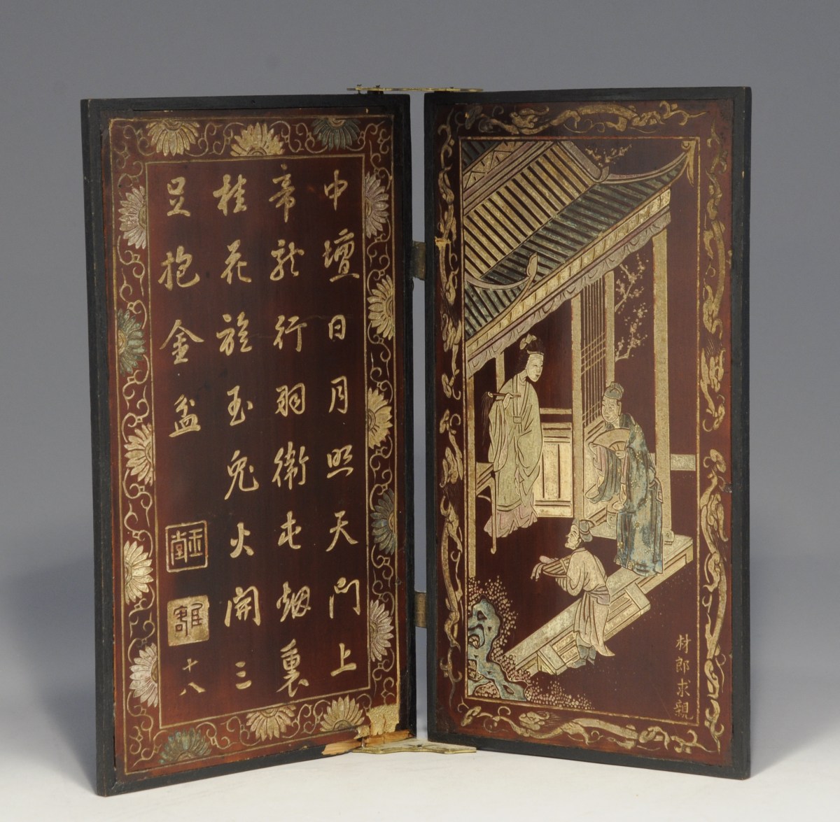 CHINE. Deux ÉCRANS orné de poèmes et de scènes de palais polychromes. Articulation en bois noirci et laiton.