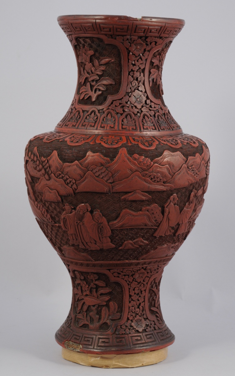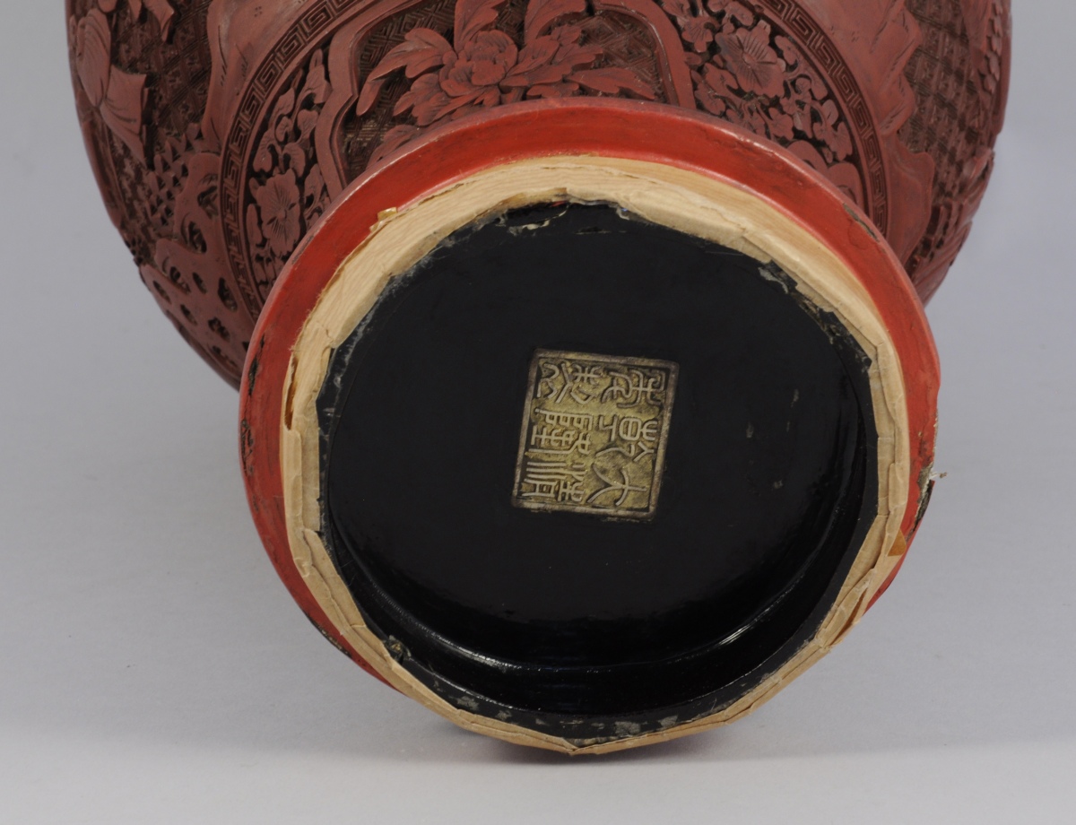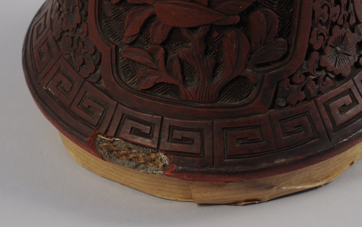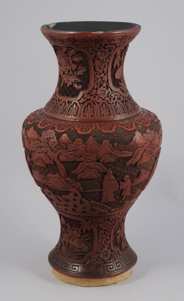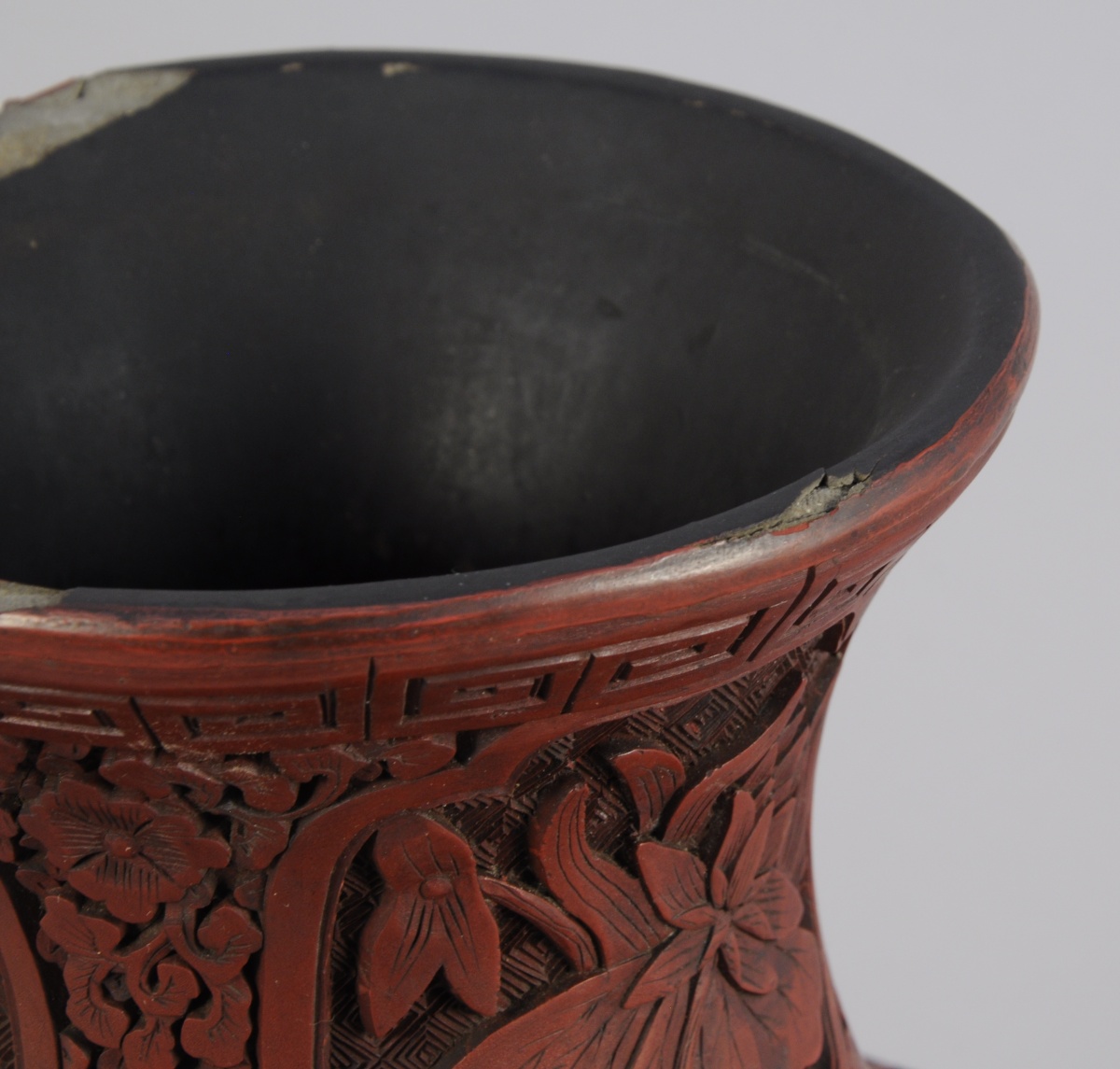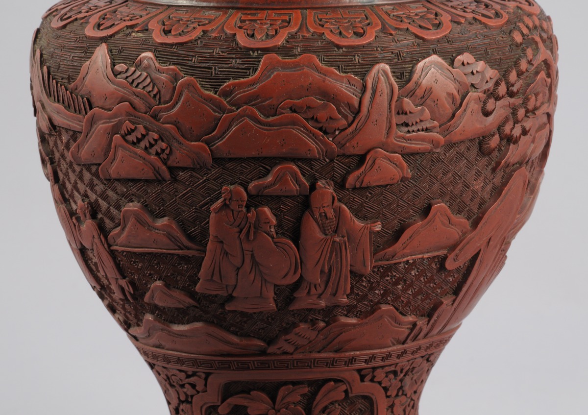 CHINE. VASE en laque rouge sculpté et monté en lampe. Fin XIXe.