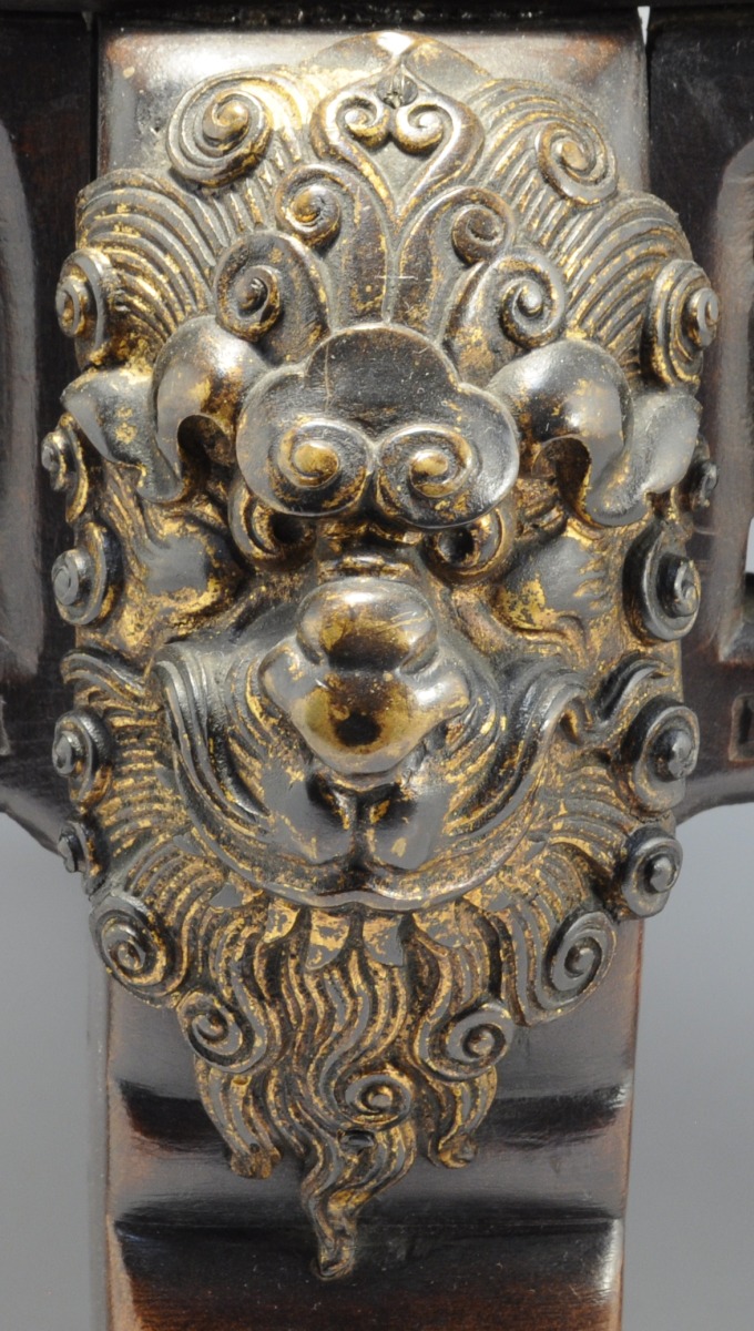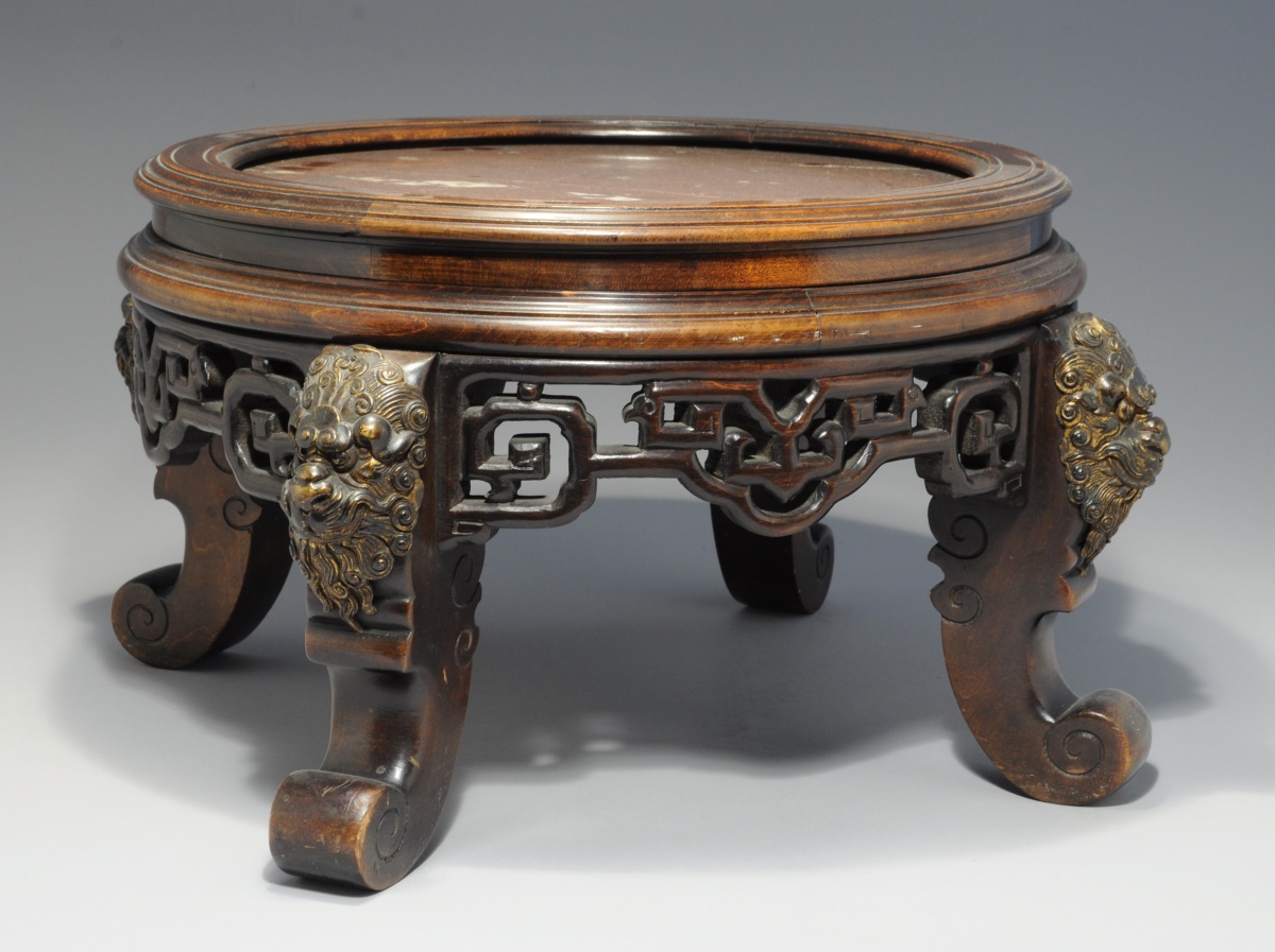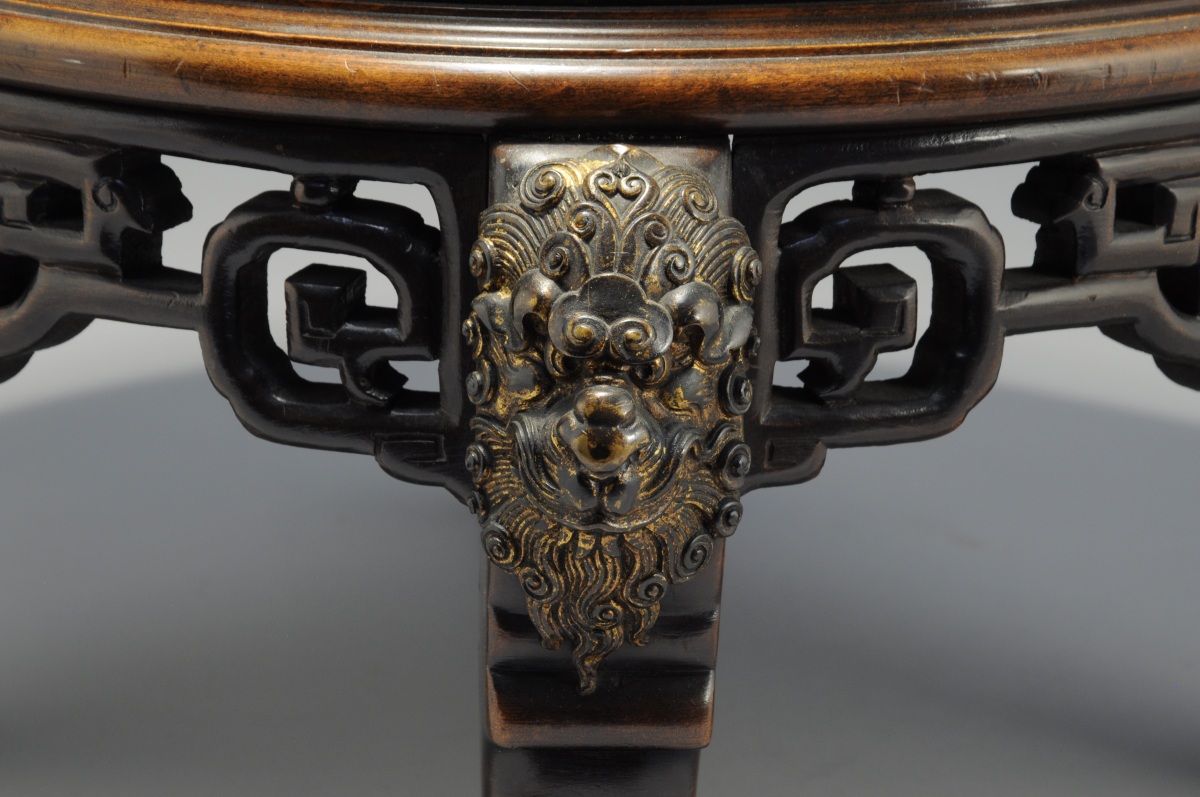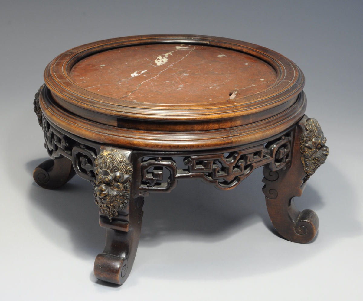 CHINE. SELLETTE basse de forme ronde en bois sculpté et ajouré d'enroulements. Elle repose sur quatre pieds galbés agrémenté de chutes en bronze figurant un mufle de lion. Dessus de marbre rouge.