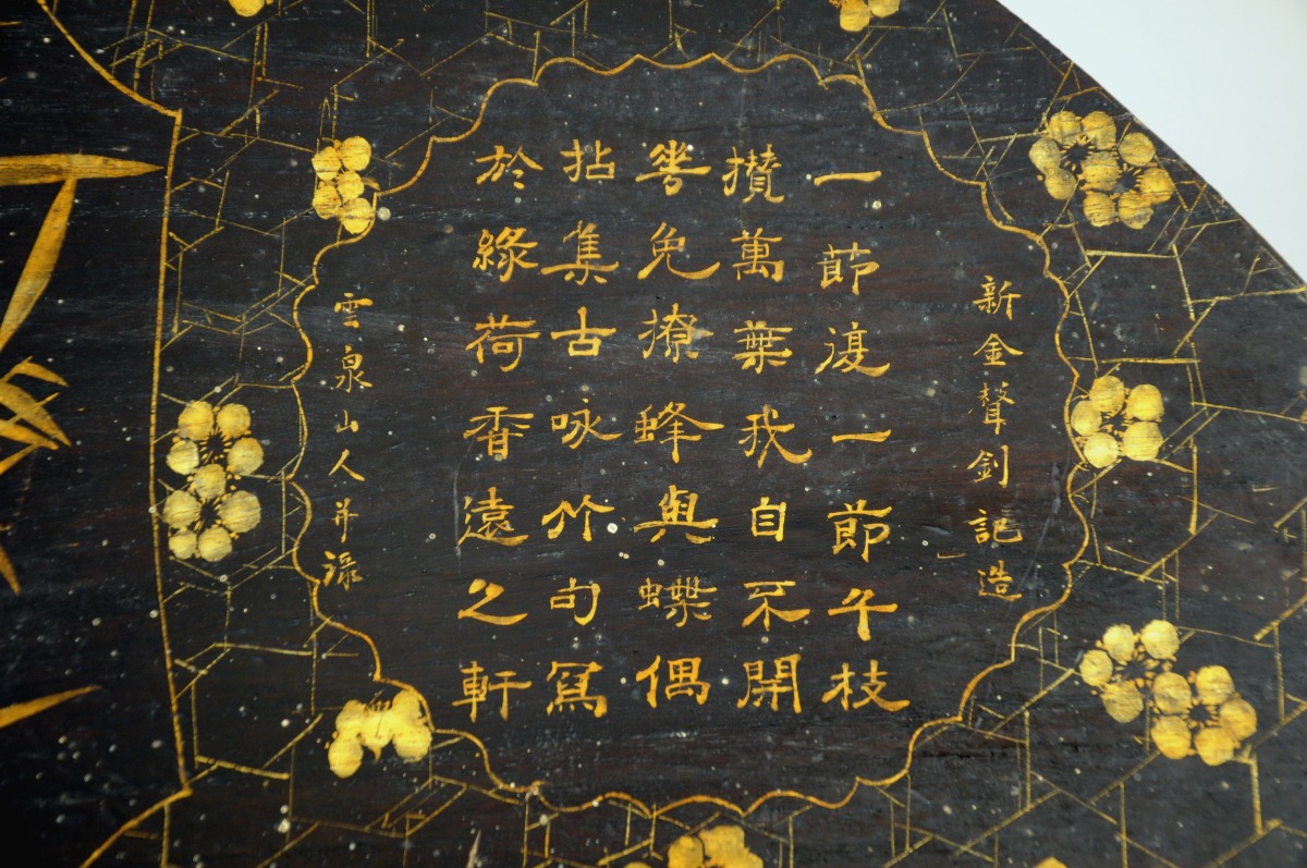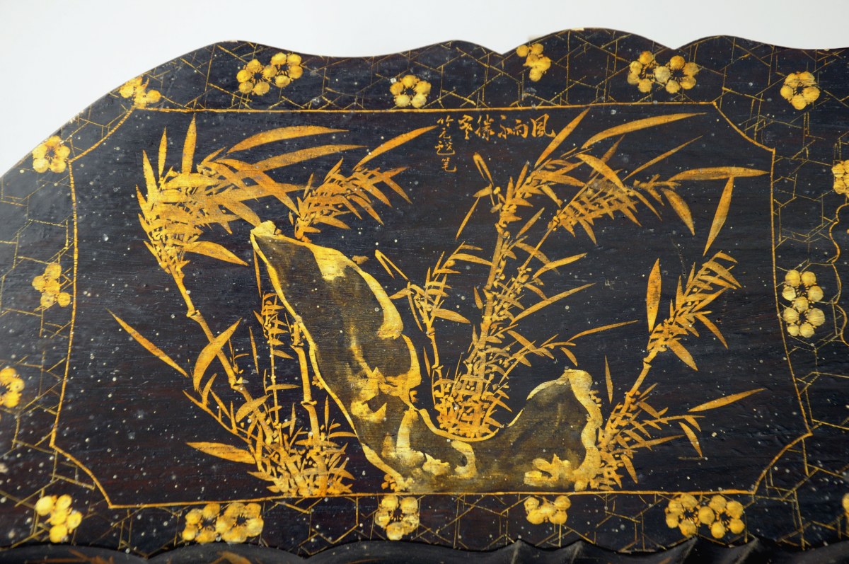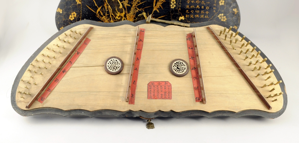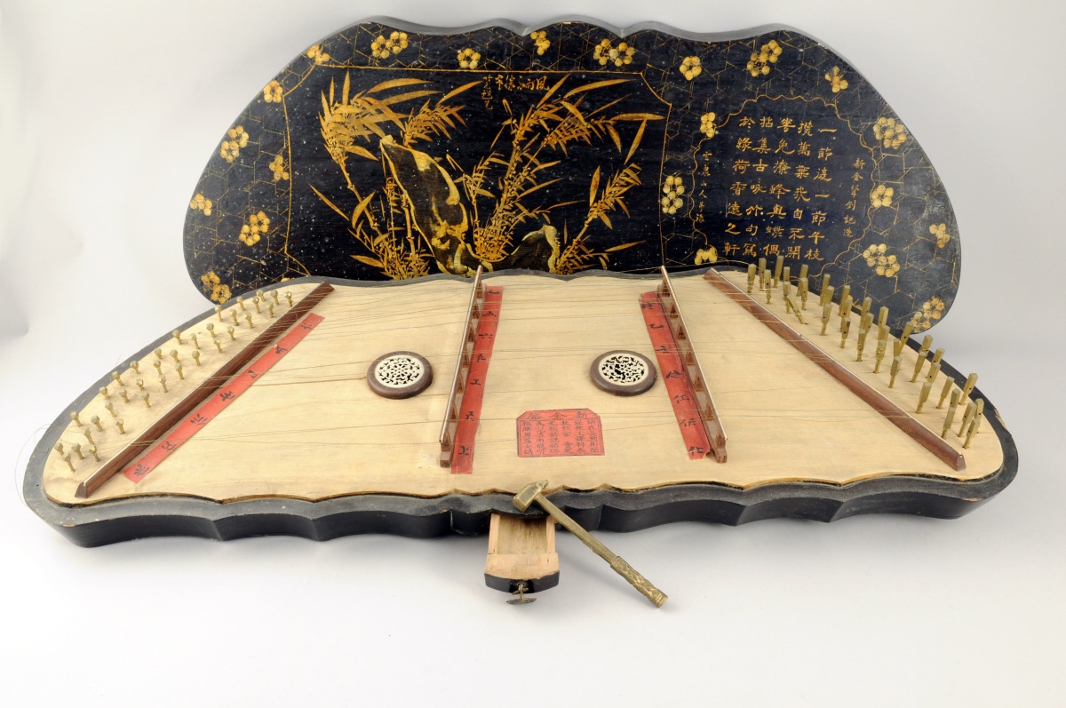 CHINE. INSTRUMENT DE MUSIQUE à cordes. Caisse oblongue de forme chantournée ouvrant en façade par un petit tiroir recelant un marteau de laiton. Le couvercle laqué or sur fond noir d'un texte et, dans une réserve, d'un rocher et de bambous sur fond quadrillé à fleurs.