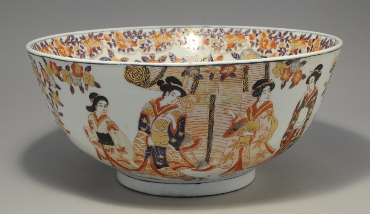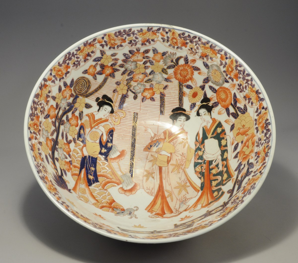 JAPON. Grande COUPE en porcelaine polychrome et or, à décor de femmes à l'éventail.