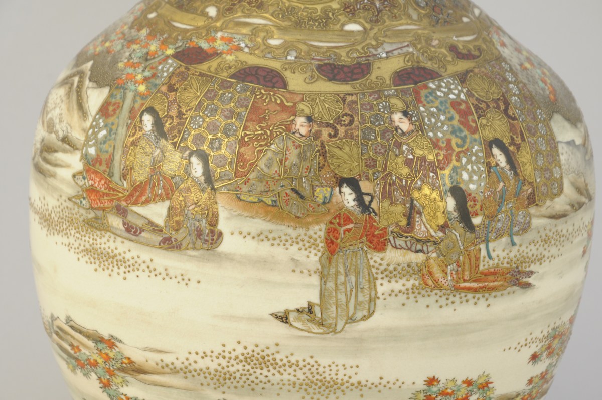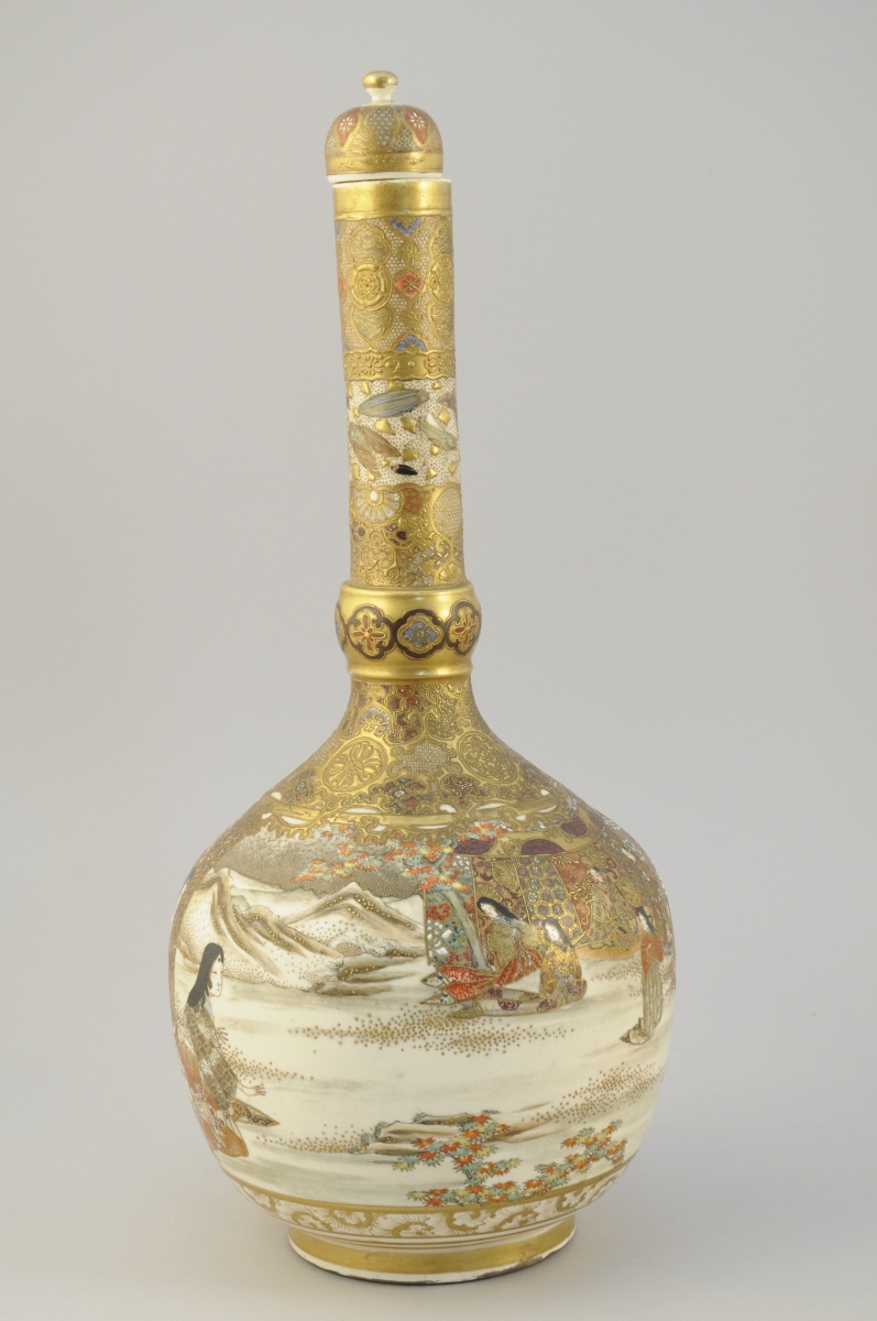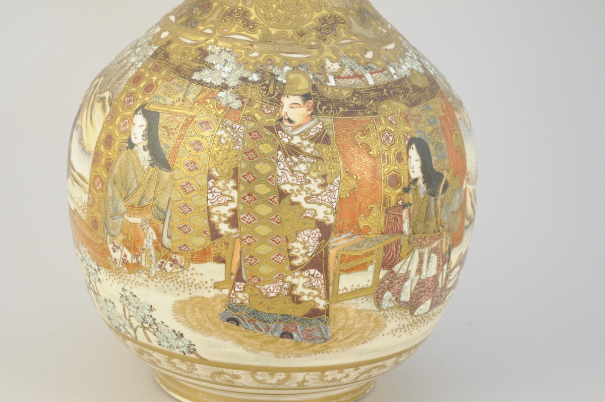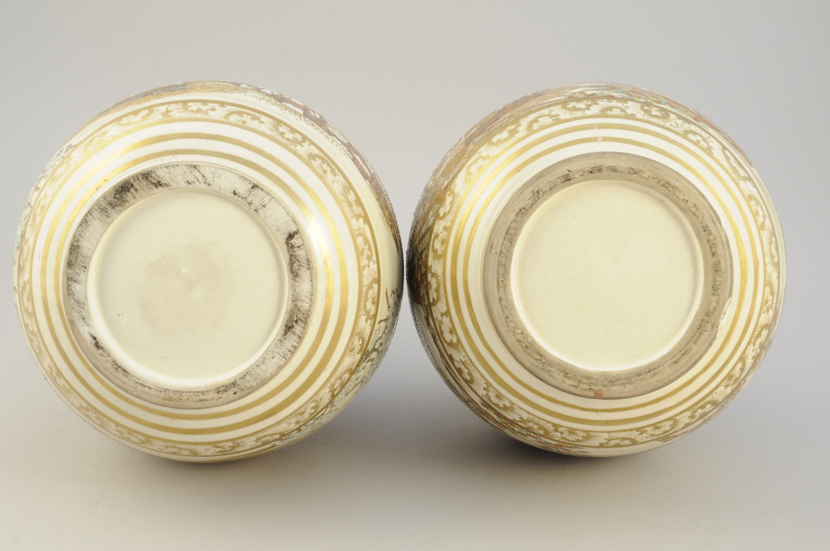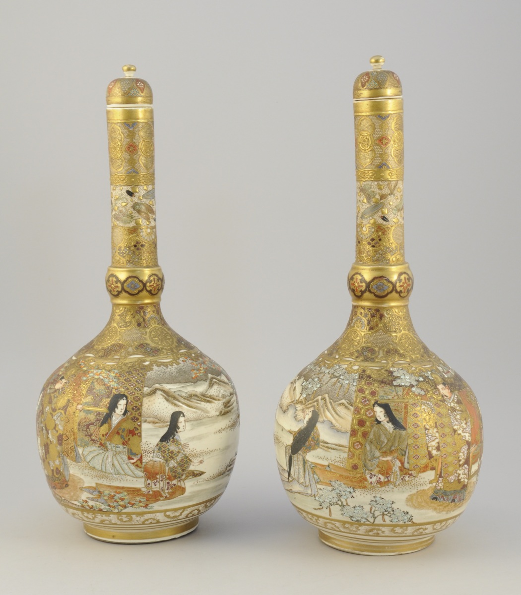 JAPON. Paire de VASES à haut col et panse basse en porcelaine à riche décor polychrome et or de scènes de palais sur fond paysagé.