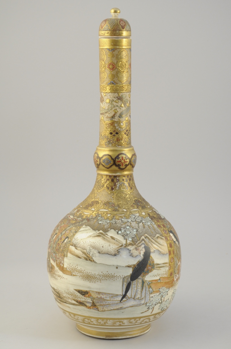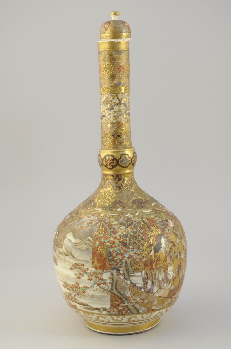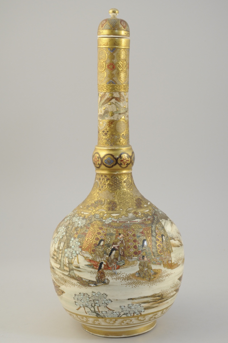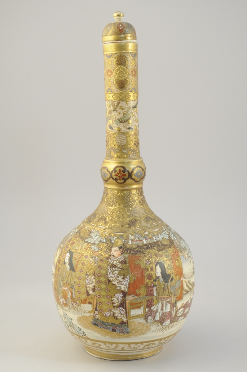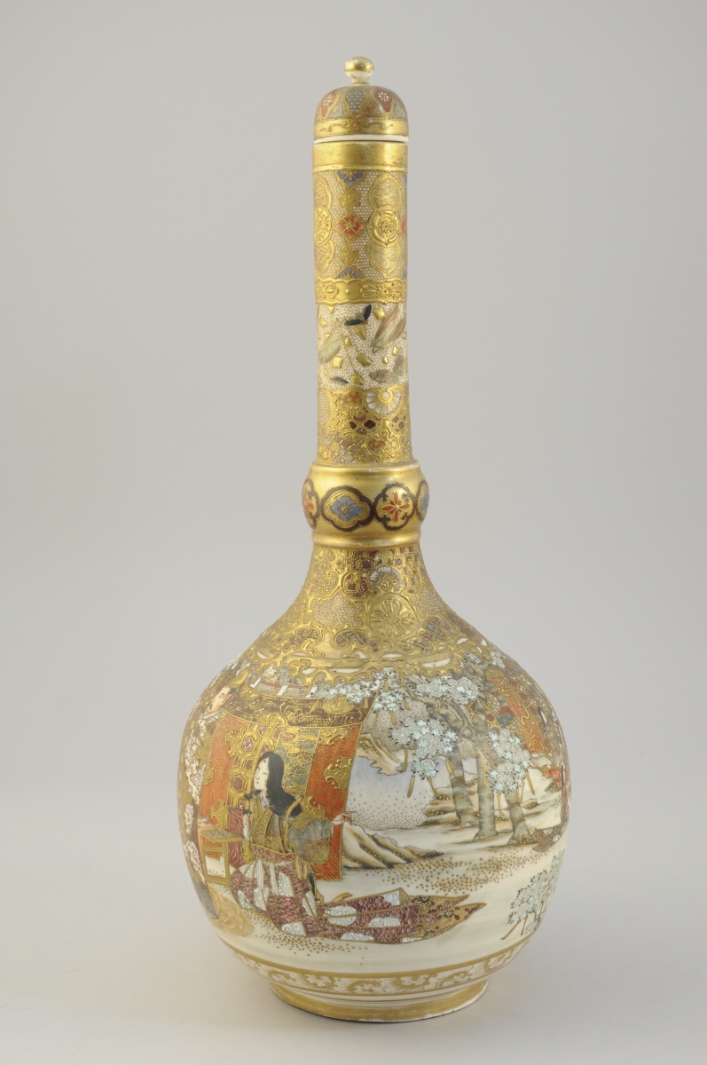 JAPON. Paire de VASES à haut col et panse basse en porcelaine à riche décor polychrome et or de scènes de palais sur fond paysagé.