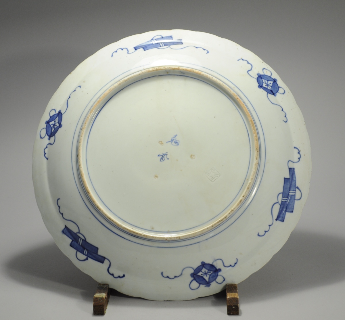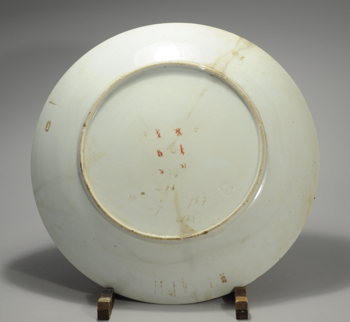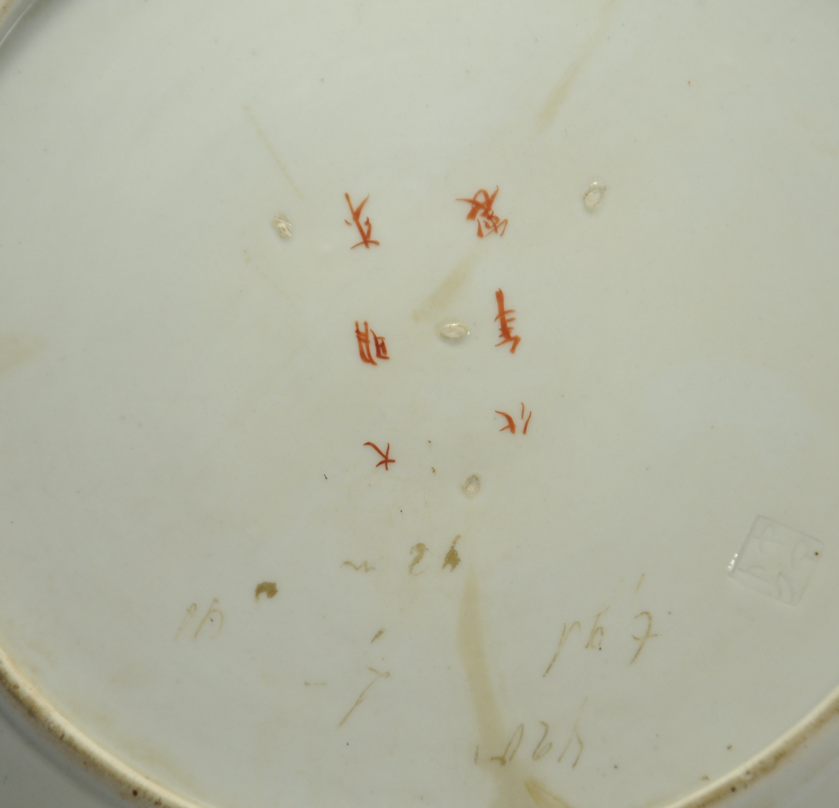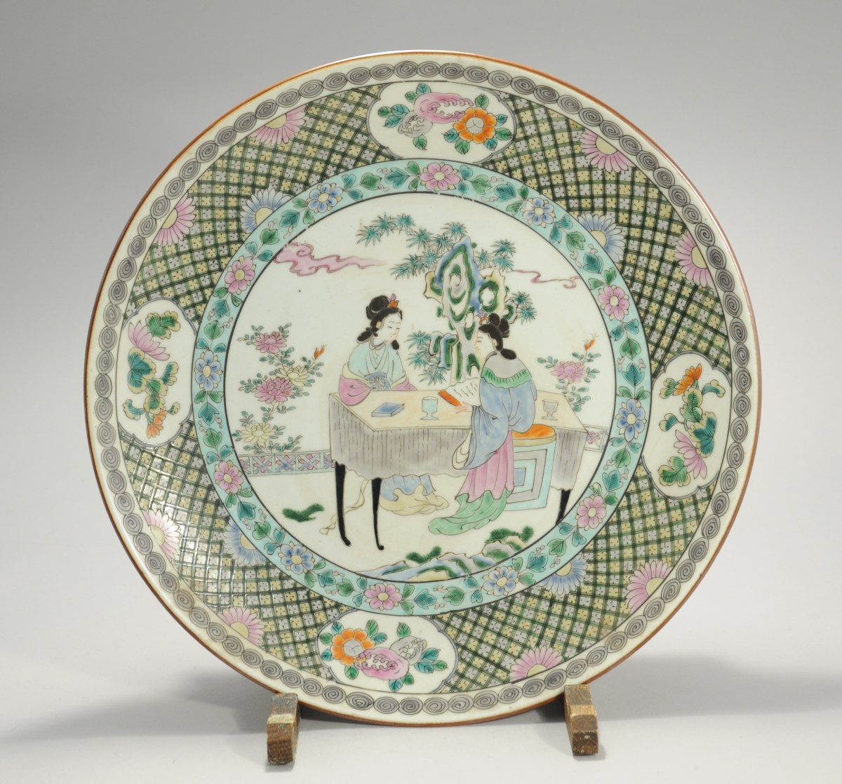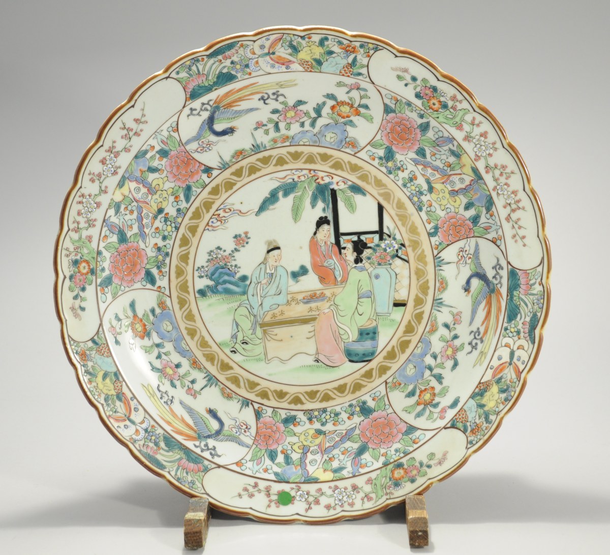JOINT : JAPON. Grand PLAT de forme circulaire en porcelaine à décors émaillé de dames de cour prenant une collation dans un jardin, l'aile ornée d'un treillage et de quatre médaillons fleuris. Marques olographes et cachet creux au dos. XXe. Diam. 40 cm.