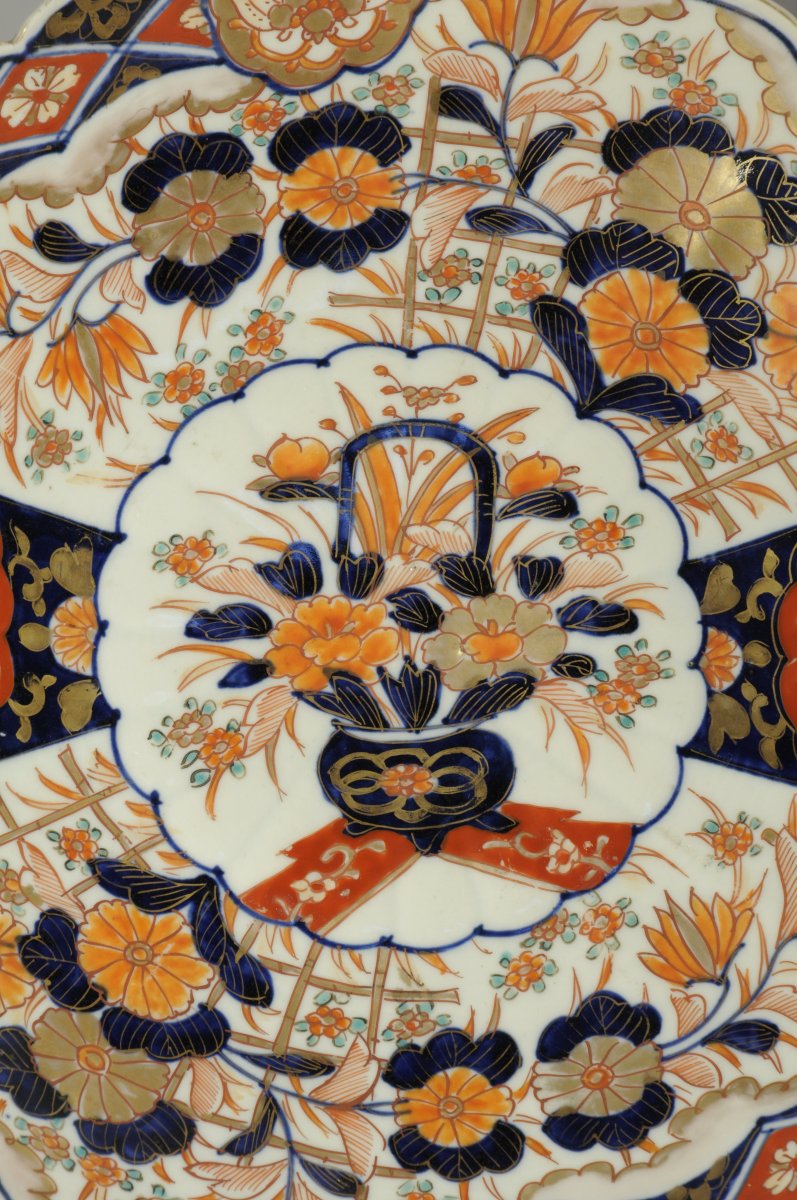 JAPON. PLAT de forme ronde à bords chantournés en porcelaine à décor imari de fleurs et feuillages stylisés polychromes.