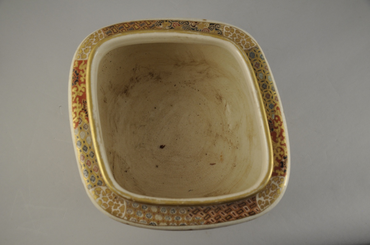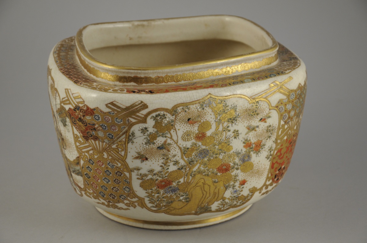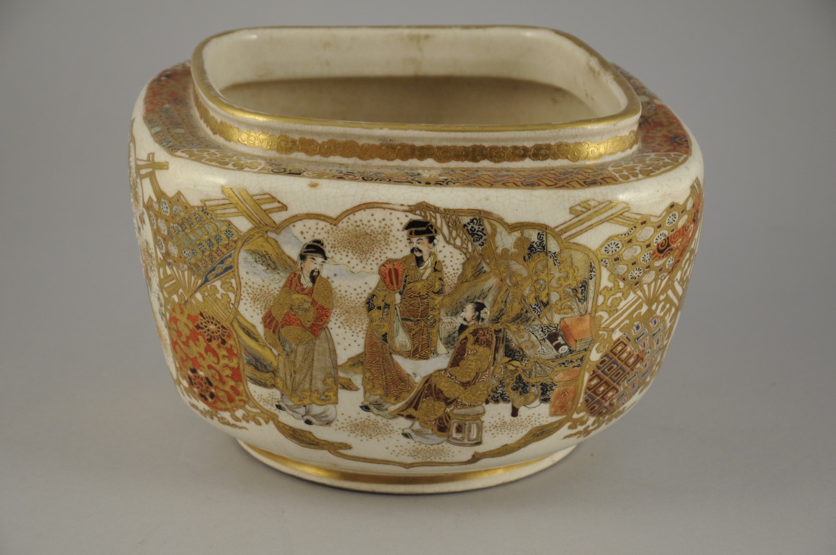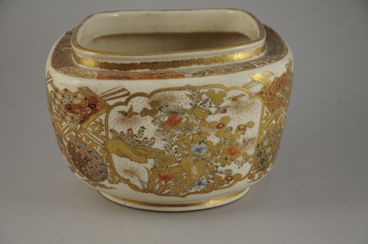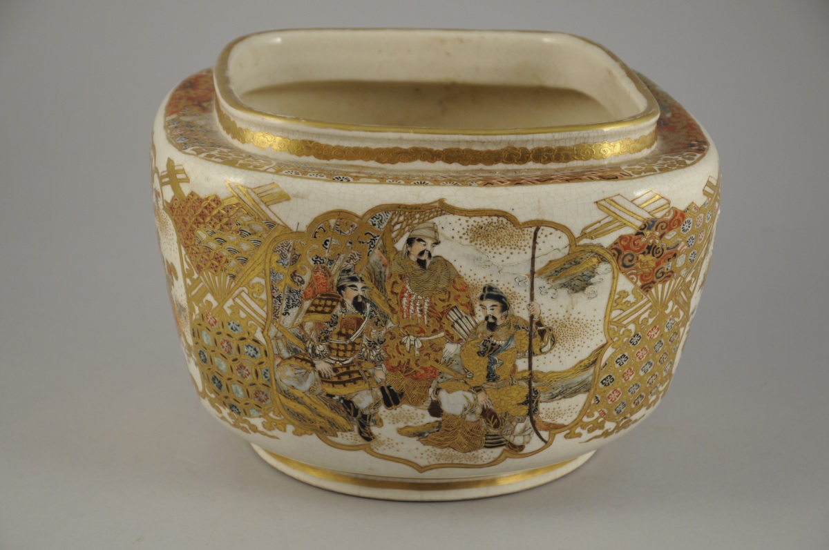 JAPON. CACHE-POT de forme losangique en porcelaine craquelée à décor polychrome et or de trois guerriers, trois lettrés et de buissons fleuris animés d'oiseaux. Cachet en creux.