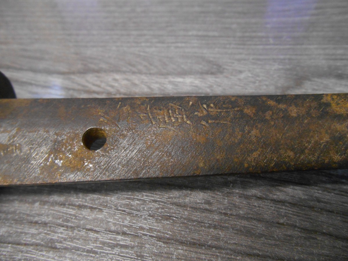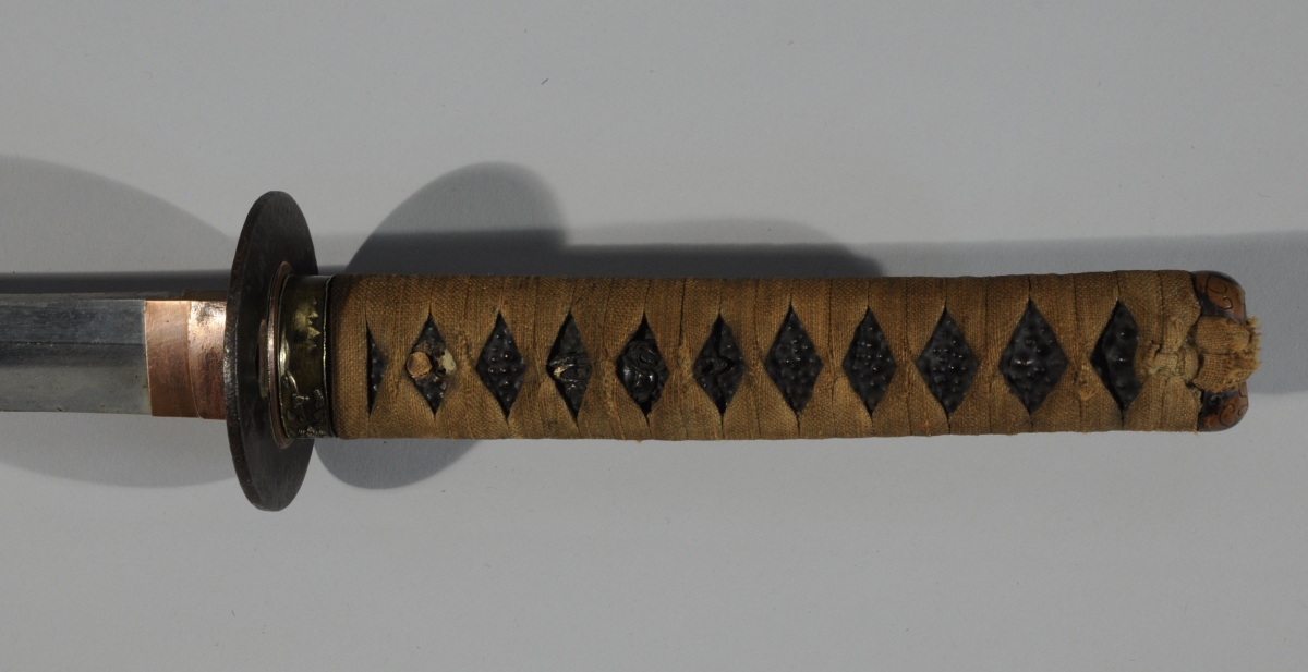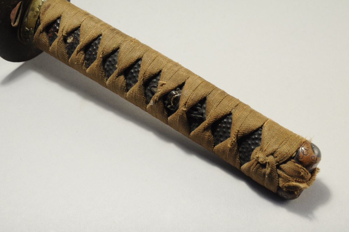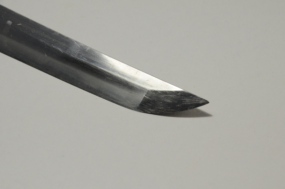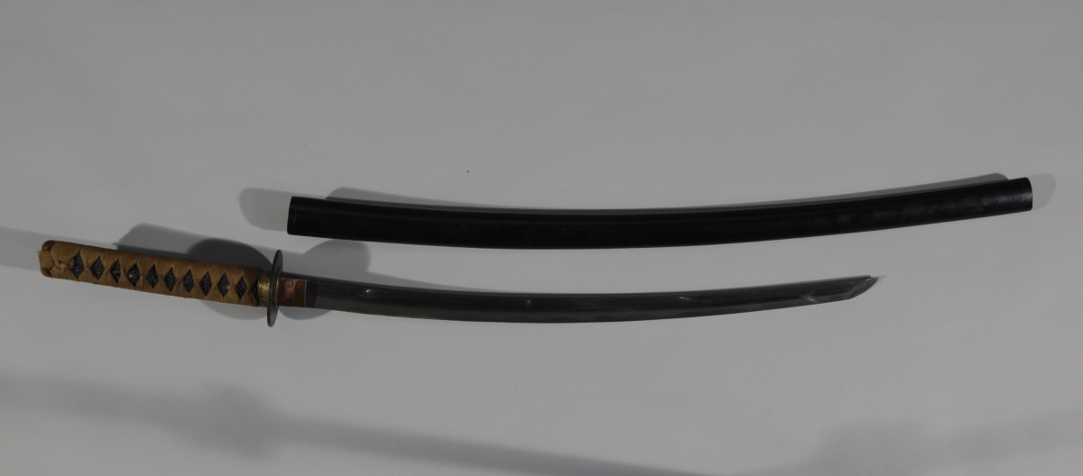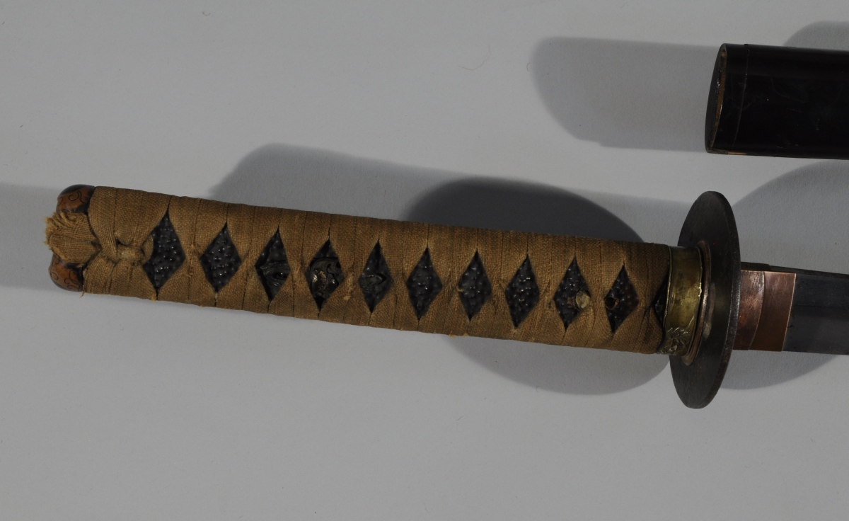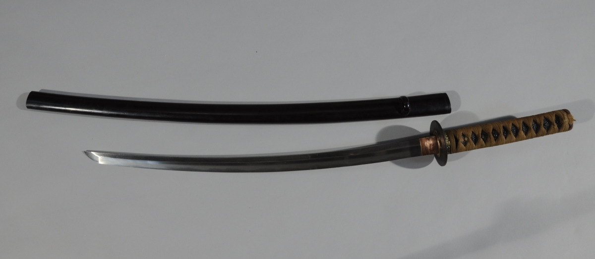JAPON. SHINTO wakizashi shinogi zukuri, hamon midare, fusée percée d'un mekugi ana, signée Fuyuhiro.