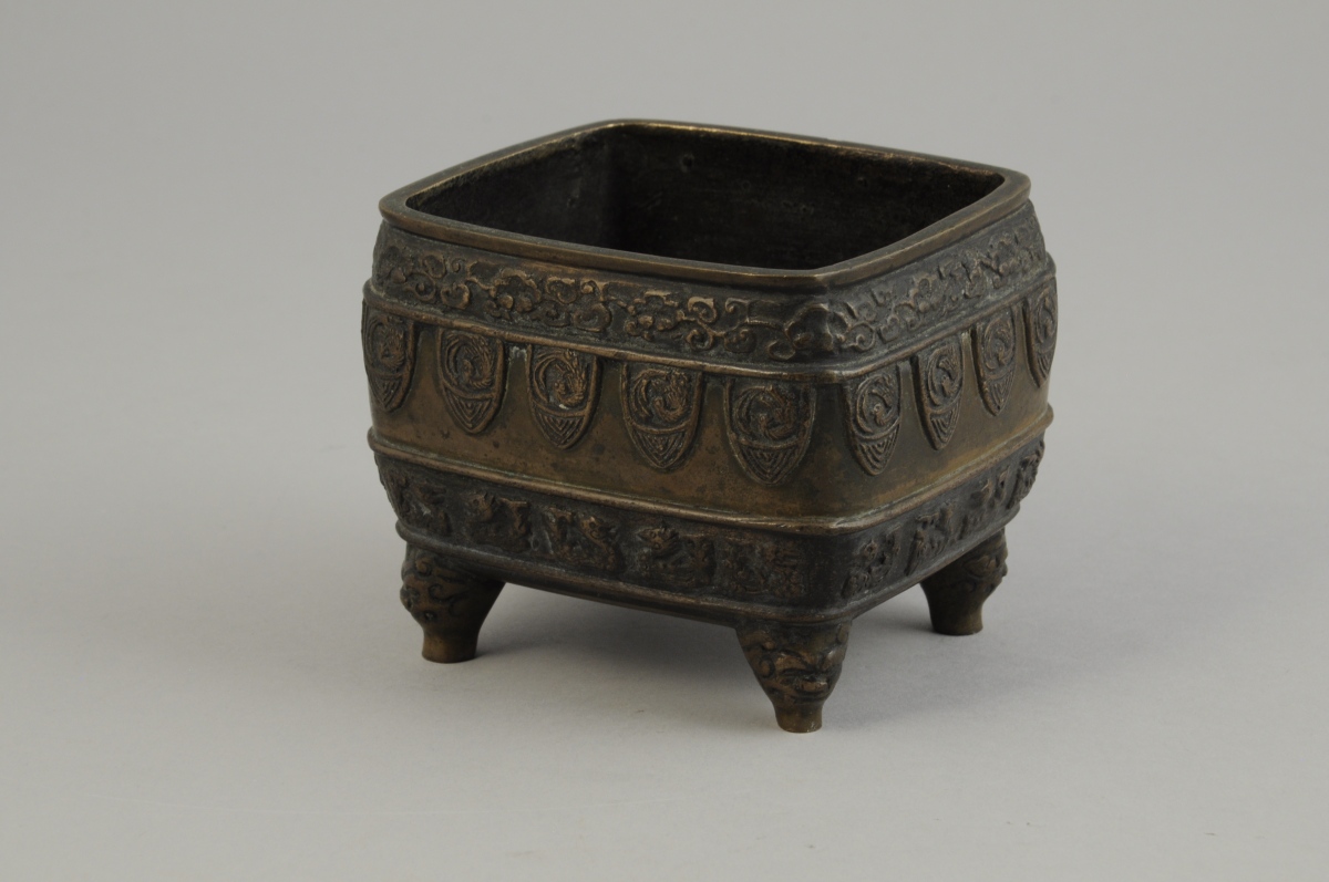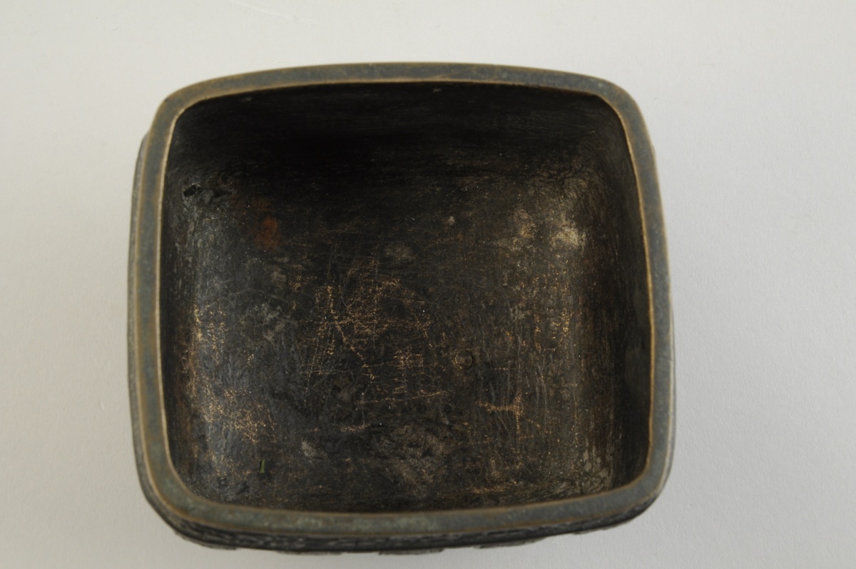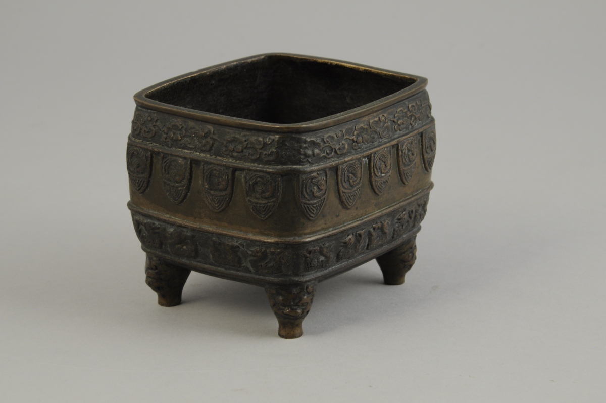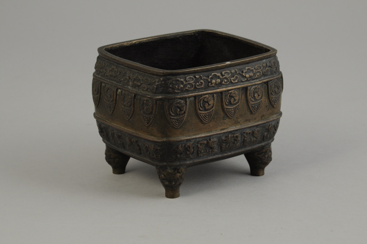 JAPON. BASSIN en bronze de forme rectangulaire décoré en bas-relief de frises de rinceaux et d'oiseaux inscrits dans des cartouches, reposant sur quatre pieds ornés de masques. Marqué à l'encre 414.