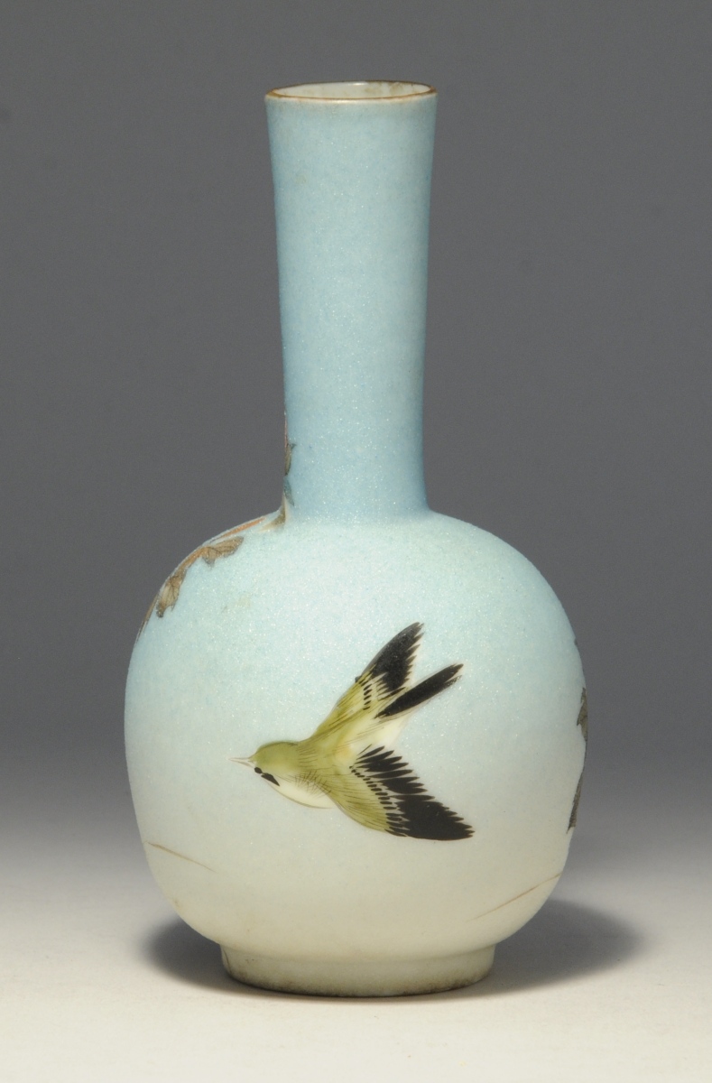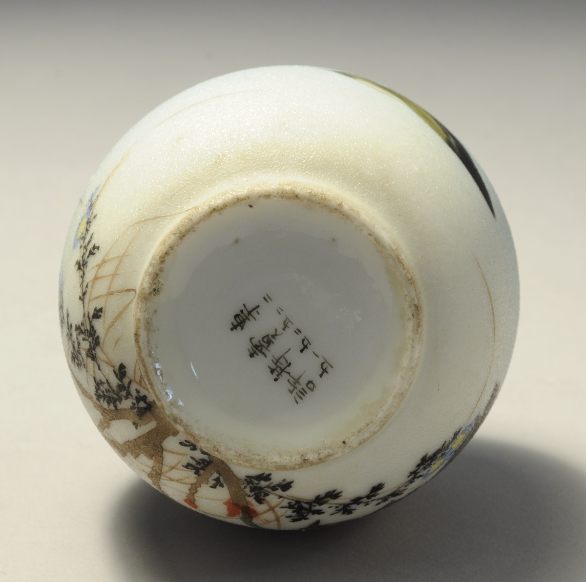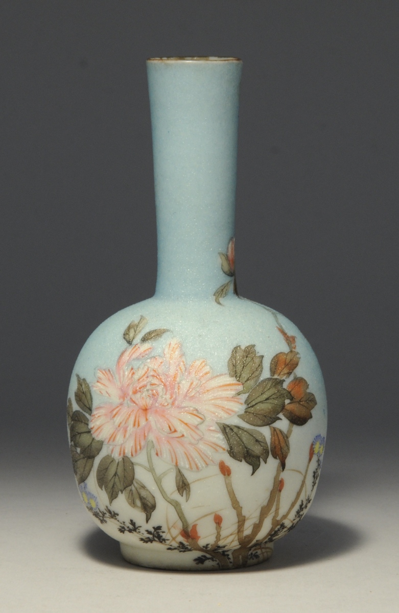 JAPON. VASE piriforme à large base, en porcelaine peinte d'une pivoine et d'un oiseau. Poème sous la base.