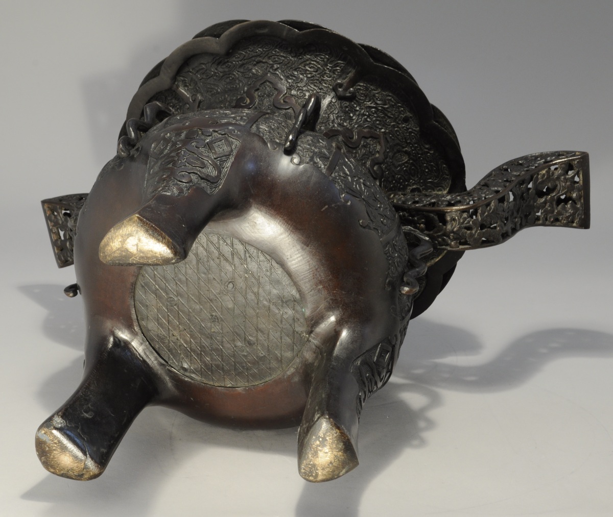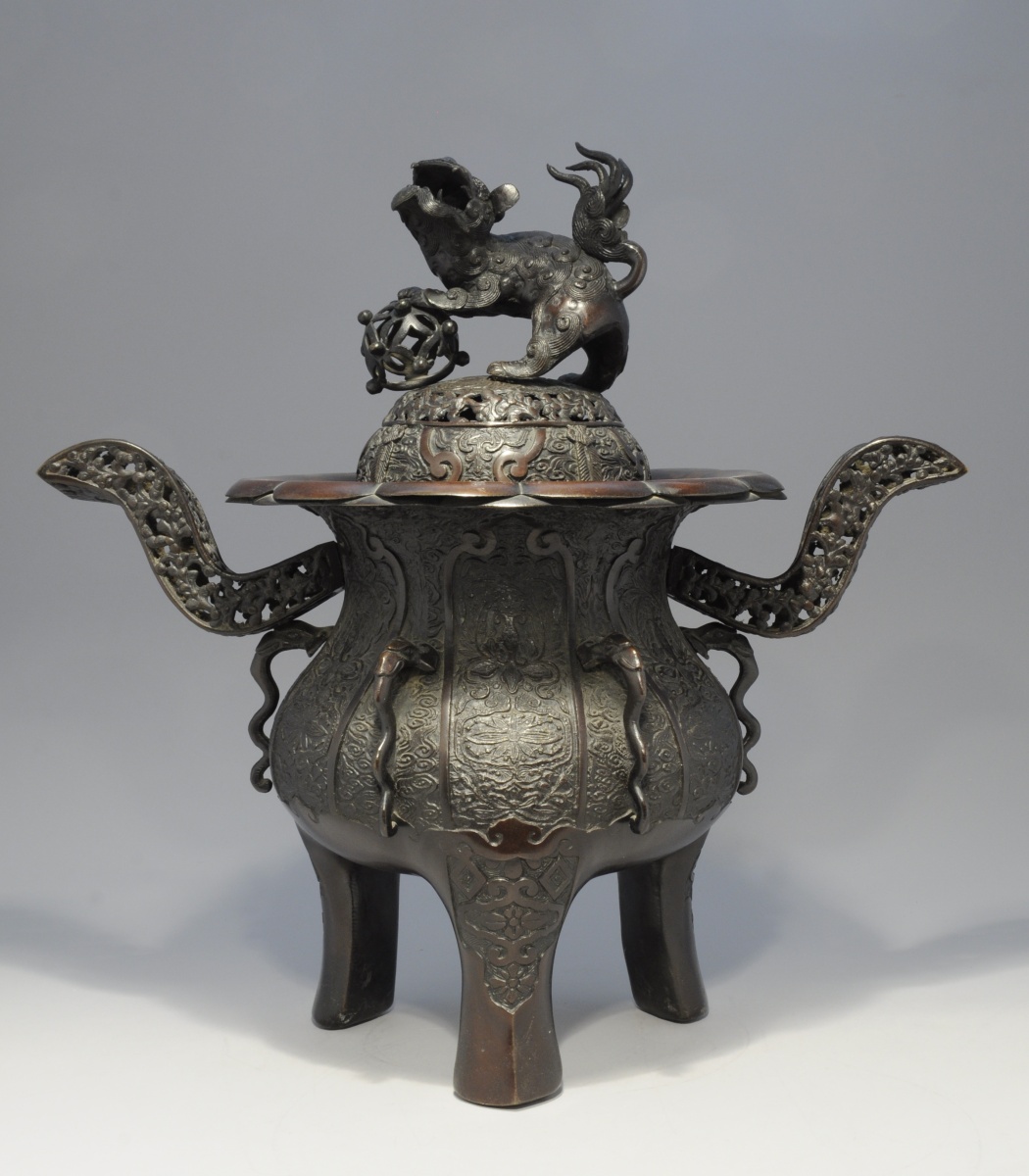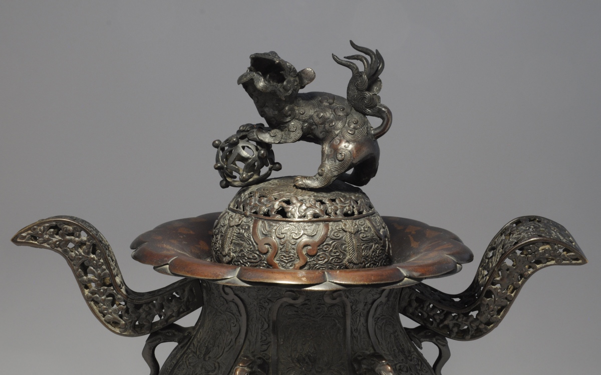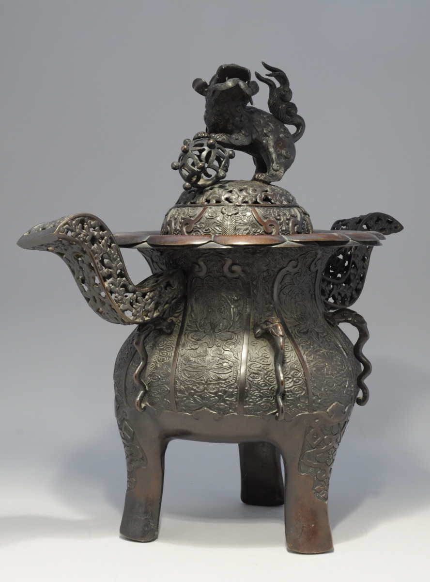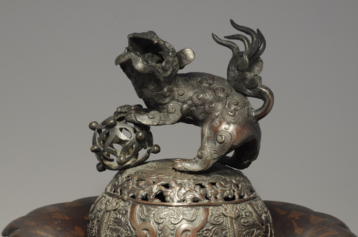 JAPON. Grand BRÛLE-PARFUM tripode en bronze patiné à décors laqué or surmonté d'un lion.