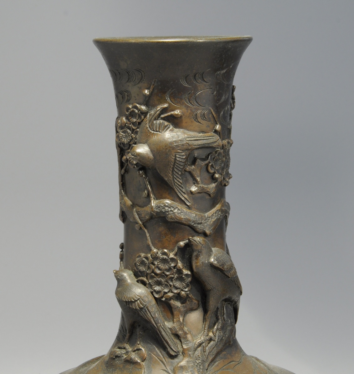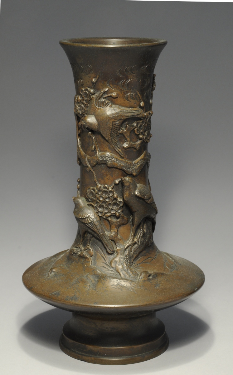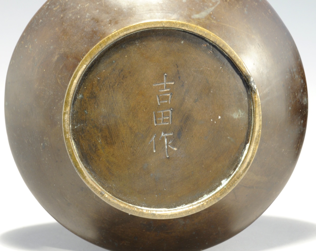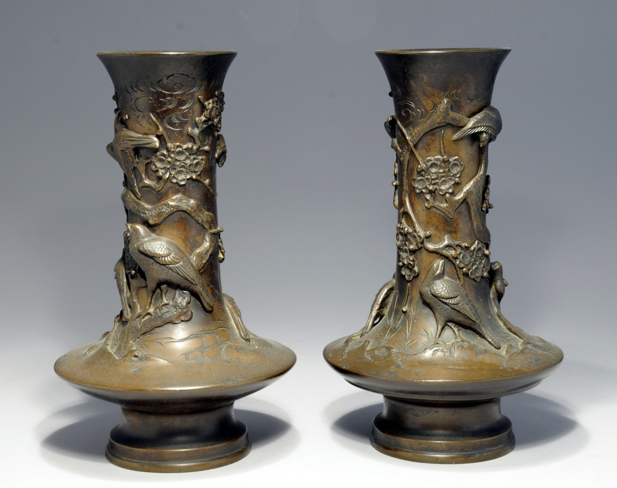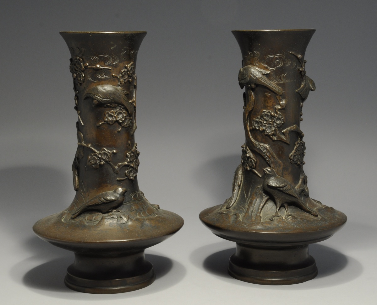 JAPON. Paire de VASES à panse basse en bronze patiné à décor en haut-relief d'oiseaux dans des branchages fleuris. Signés Yoshida.