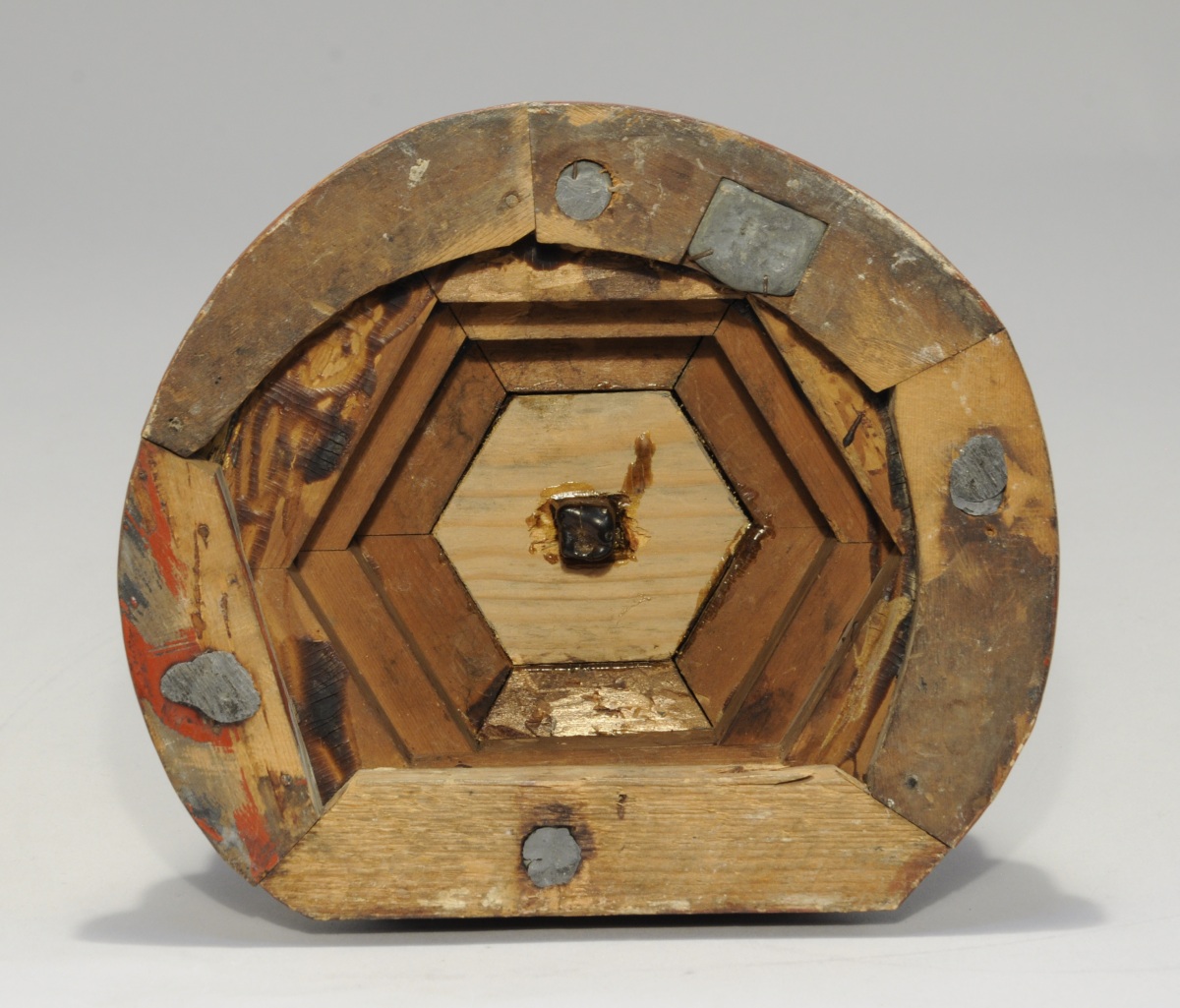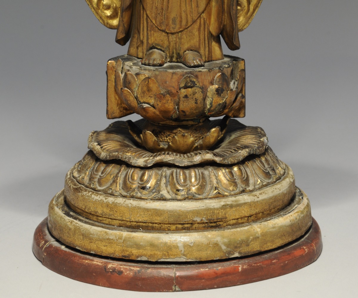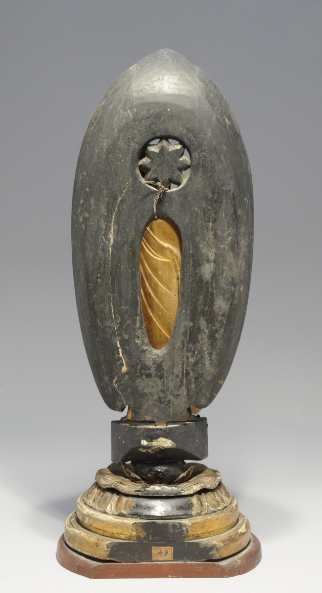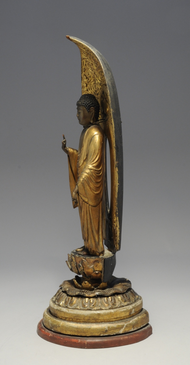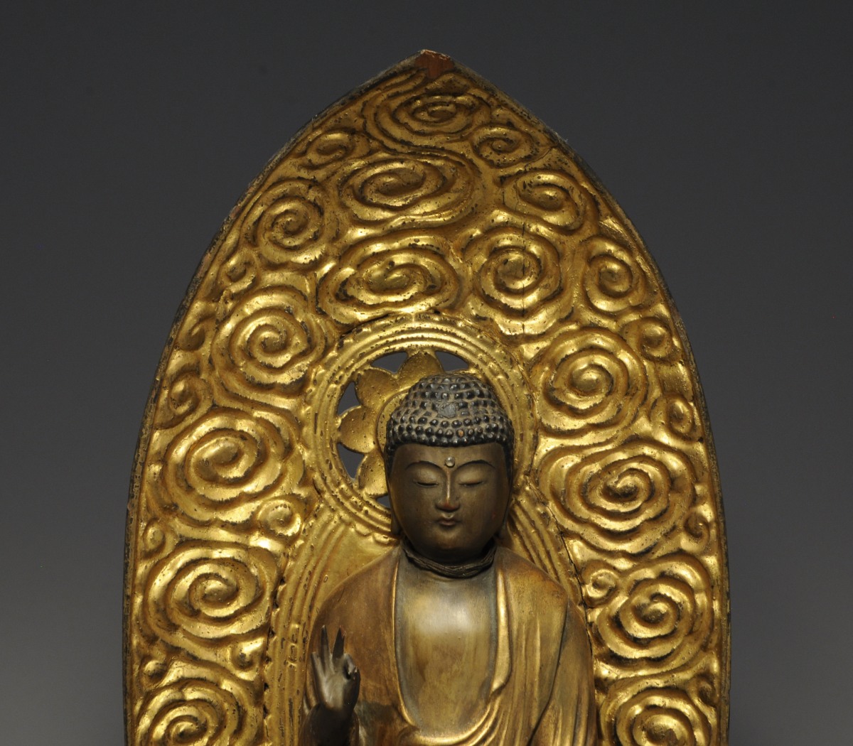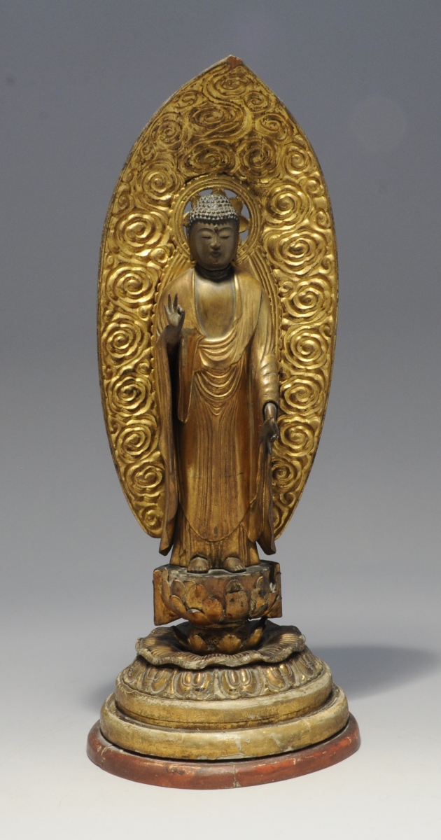 JAPON. BOUDDHA en bois laqué or, avec sa mandorle.