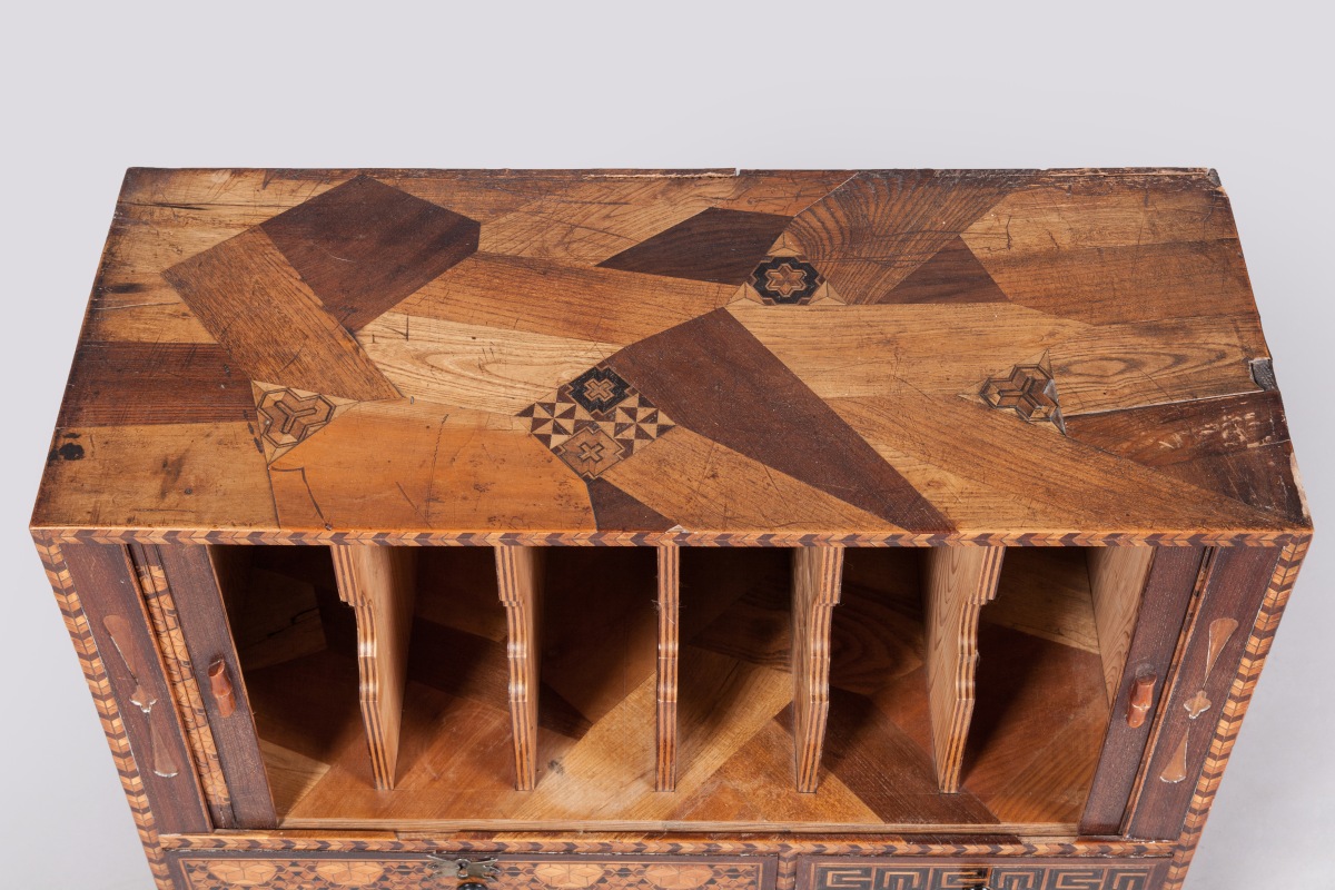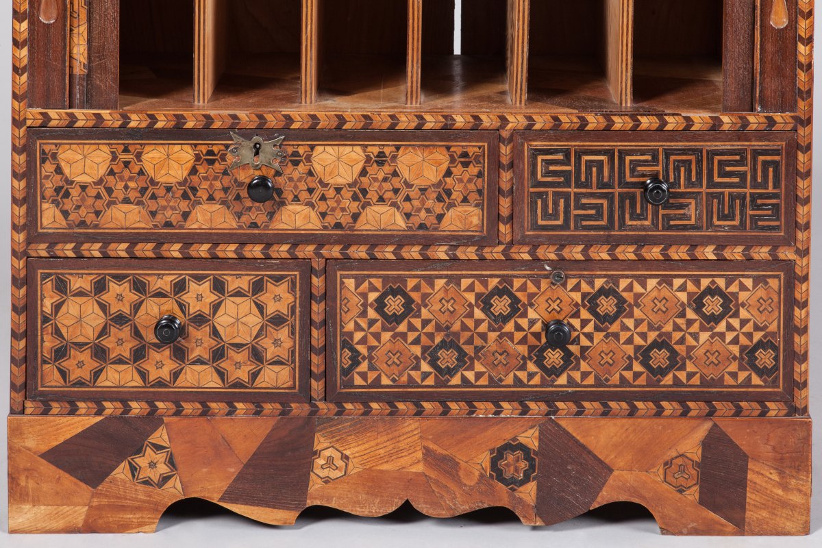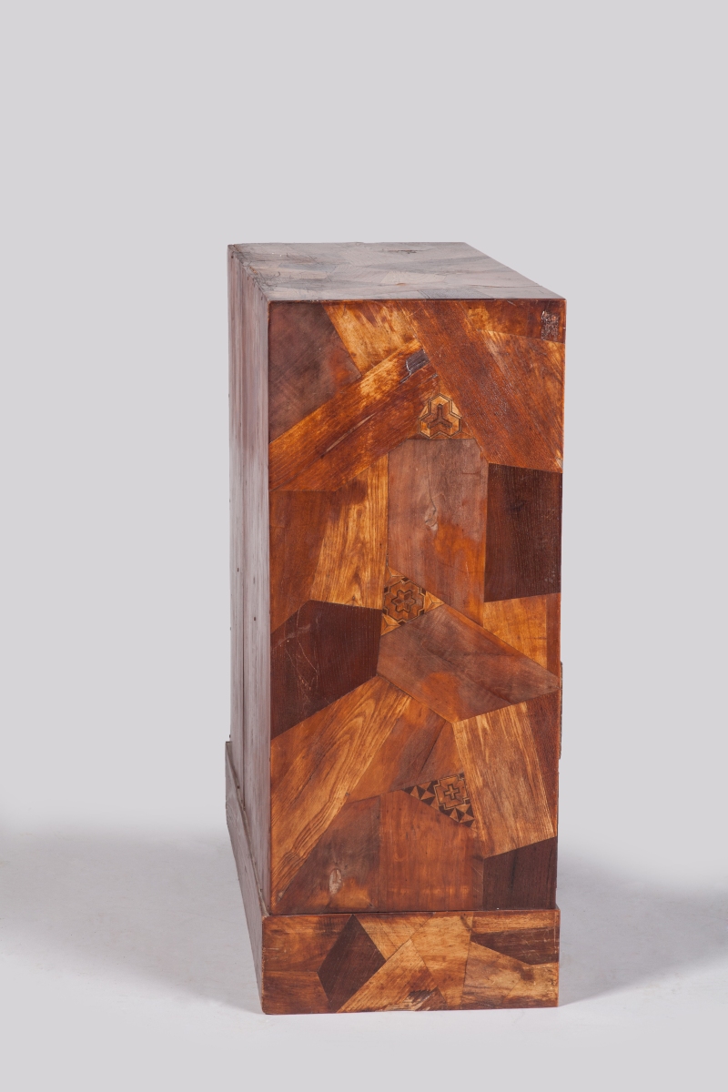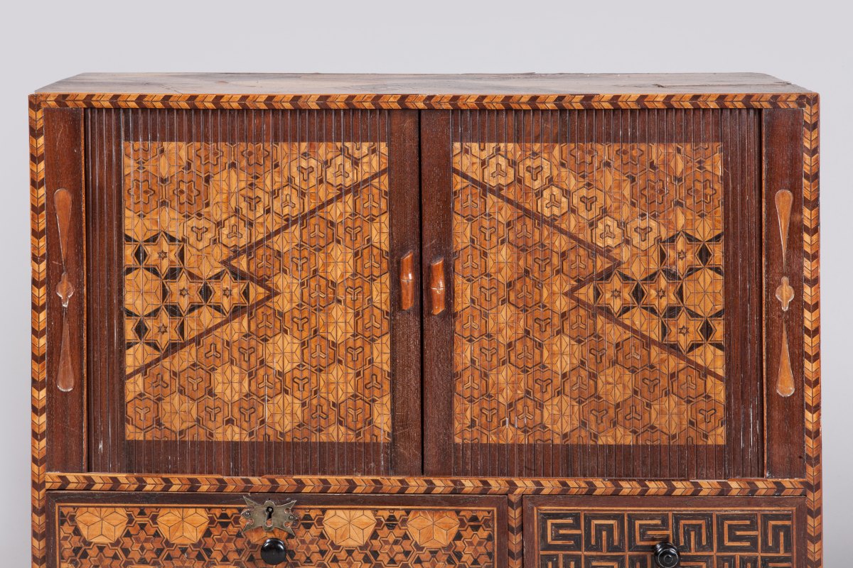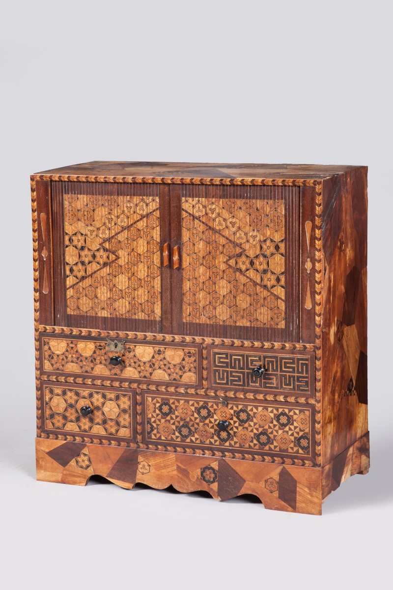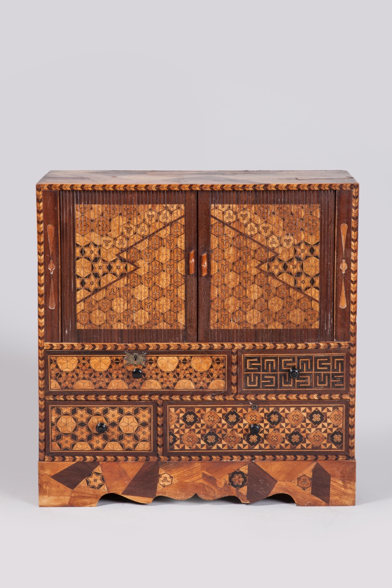 YOSEGI CABINET. Marquetry. Richly decorated with geometric figures and floral motifs. Japan, Meiji period, end the 19th - beginning of the 20th century. Provenance: collection of René Clément, moviemaker.