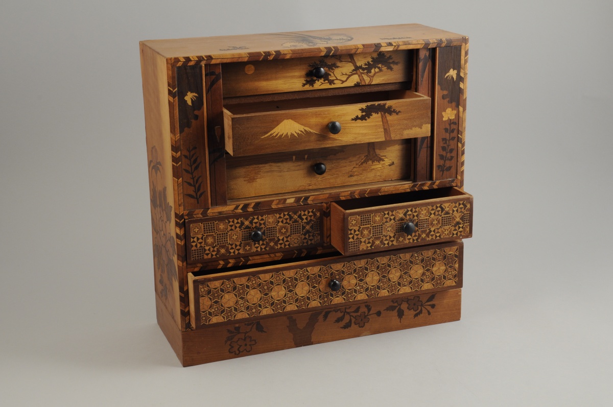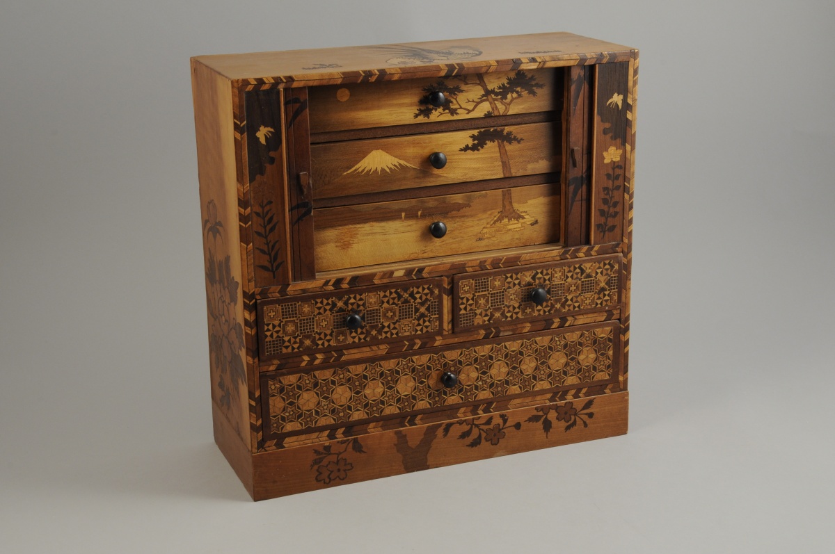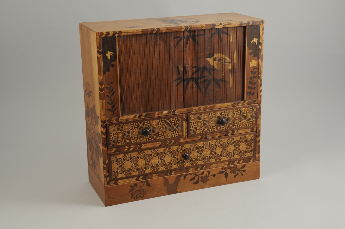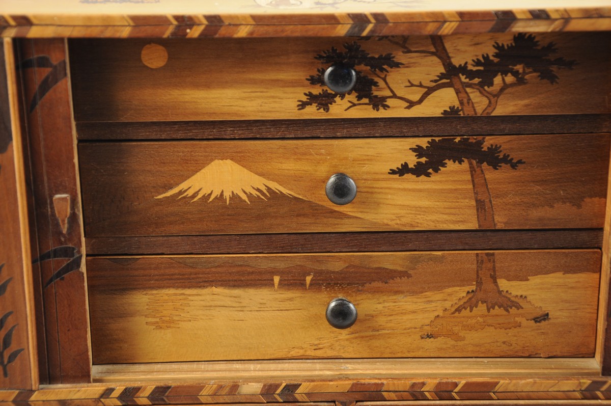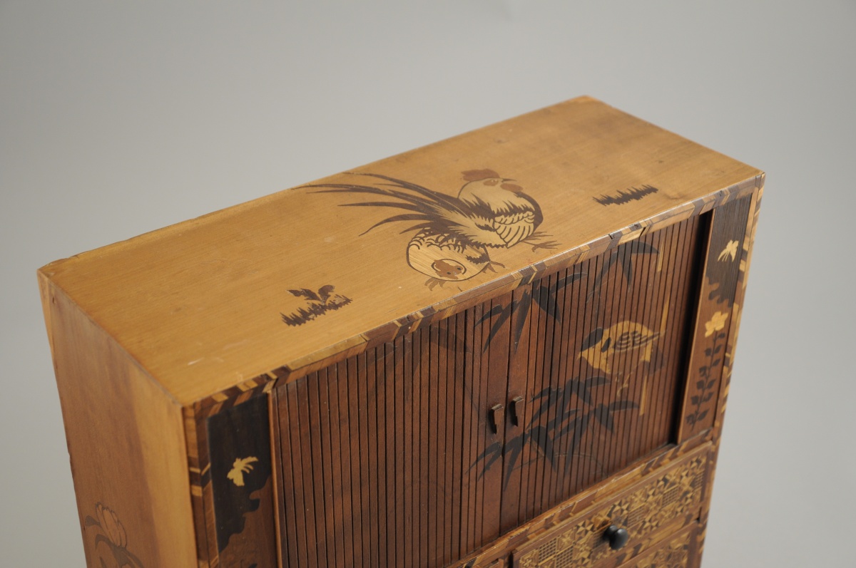 JAPON. CABINET MINIATURE, de forme rectangulaire, en marqueterie HAKONE, ouvrant, en partie basse, à trois tiroirs sur deux rangs marquettés de motifs géométriques, et, en partie haute, par deux rideaux marquetés d'un oiseau branché. Les rideaux dévoilent trois tiroirs marquetés d'un décor filant figurant le Mont Fuji. Le dessus à décors de coqs et les côtés de pivoines et de branches.