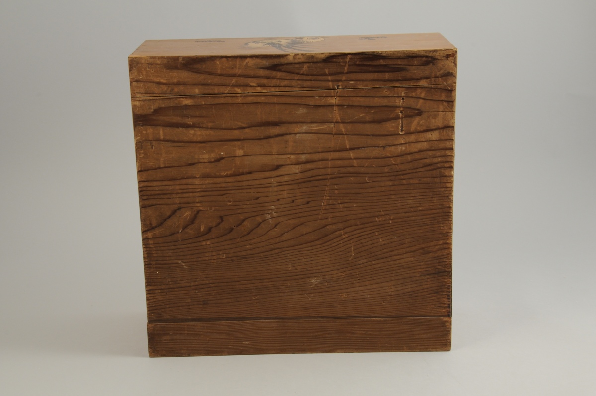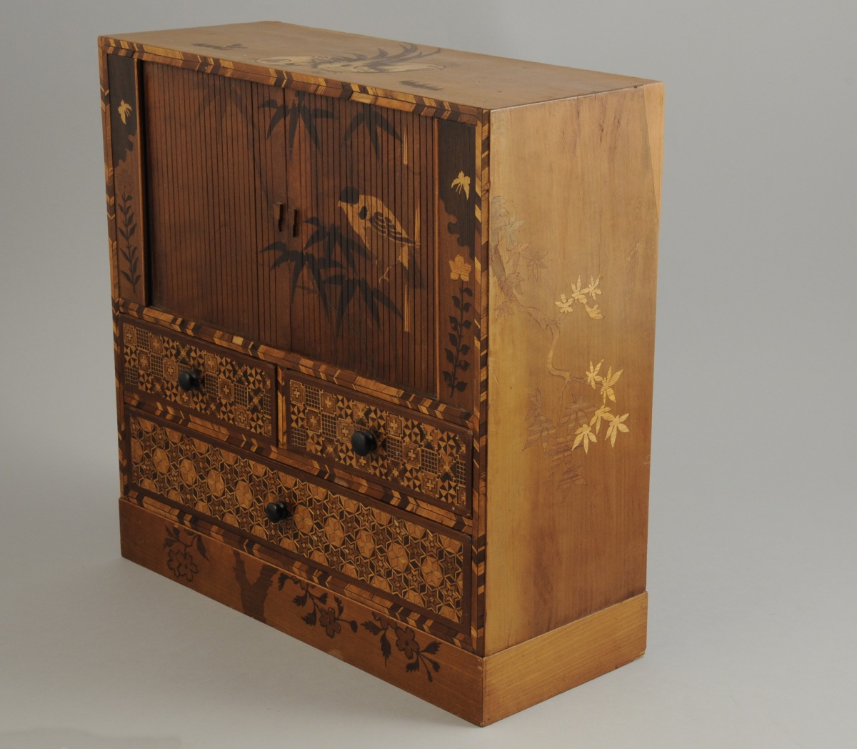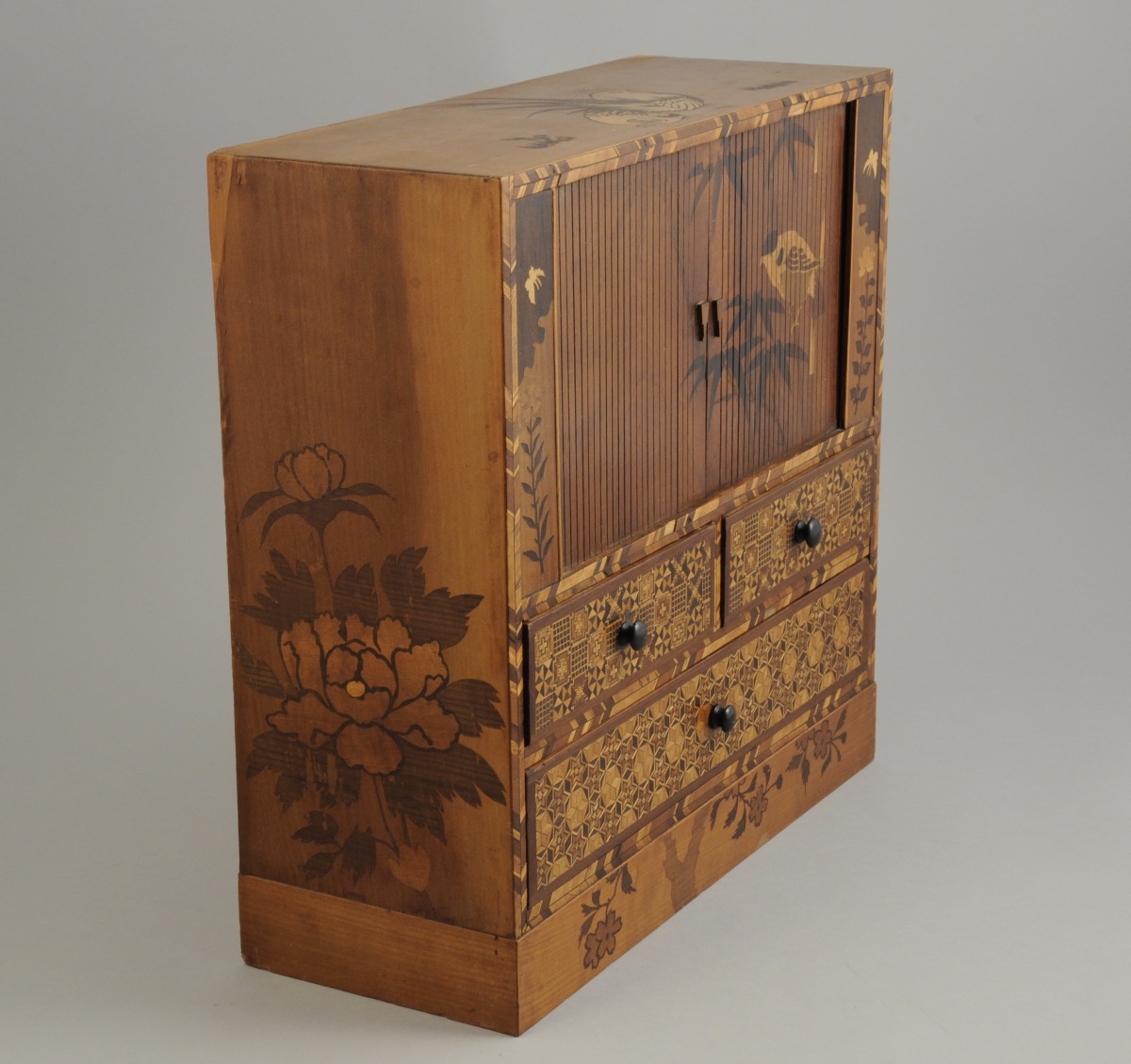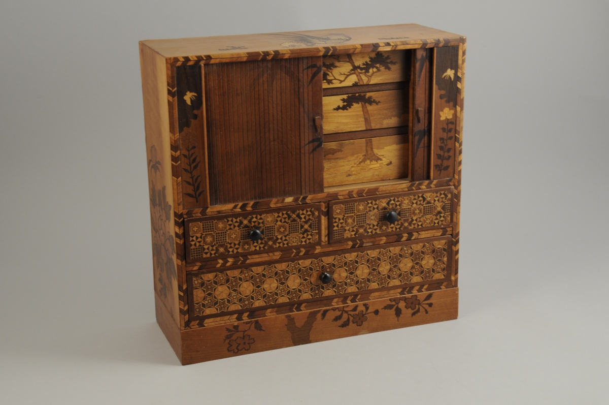JAPON. CABINET MINIATURE, de forme rectangulaire, en marqueterie HAKONE, ouvrant, en partie basse, à trois tiroirs sur deux rangs marquettés de motifs géométriques, et, en partie haute, par deux rideaux marquetés d'un oiseau branché. Les rideaux dévoilent trois tiroirs marquetés d'un décor filant figurant le Mont Fuji. Le dessus à décors de coqs et les côtés de pivoines et de branches.