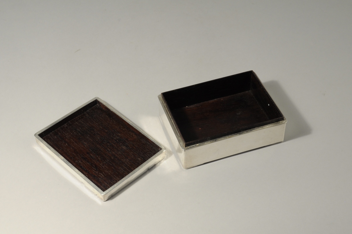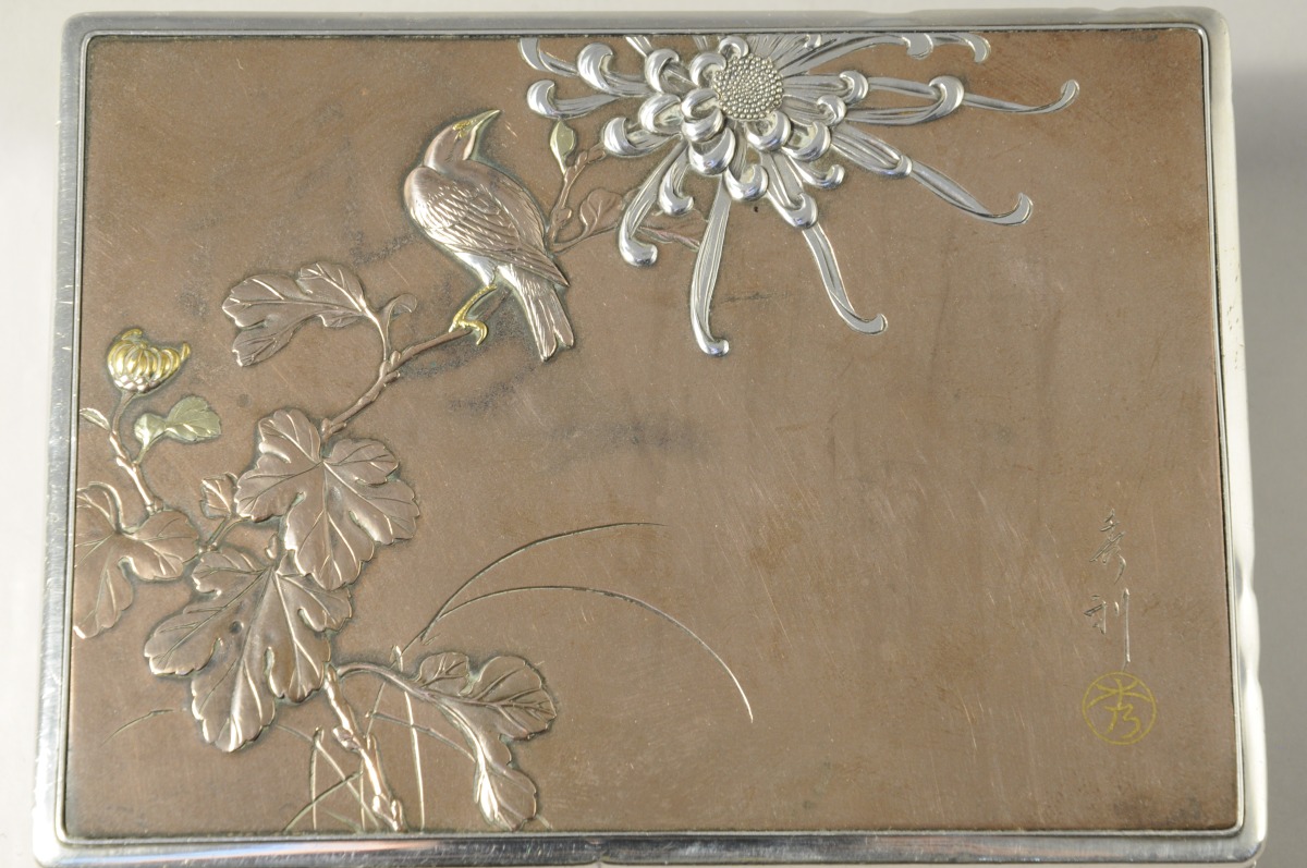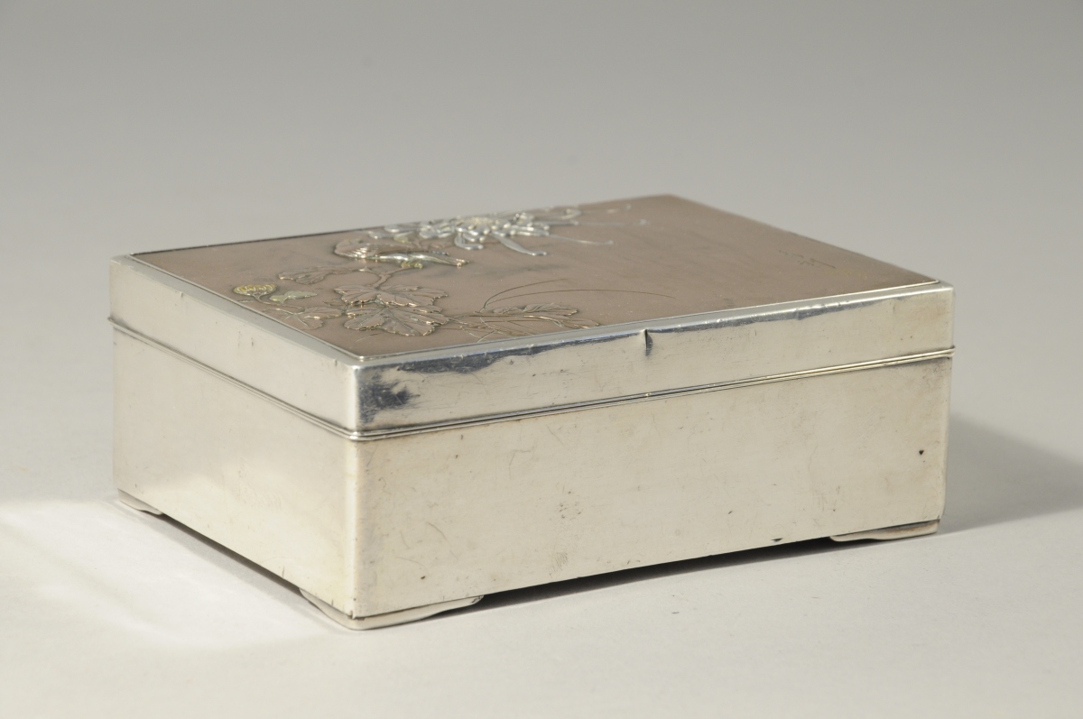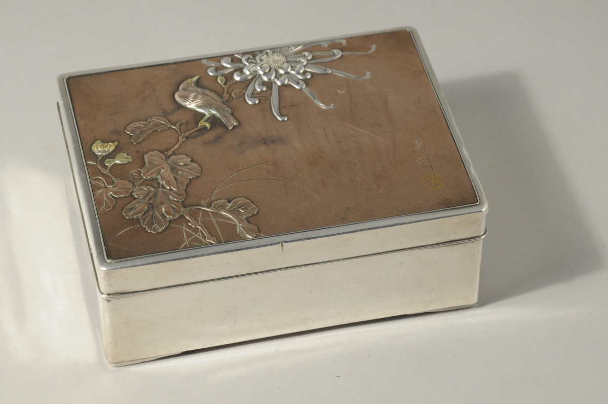 JAPON. COFFRET de forme rectangulaire en argent et bois, le couvercle cuivré sculpté d'un bas-relief figurant un oiseau sur une fleur de chrysanthème. Signé Hidetoshi.