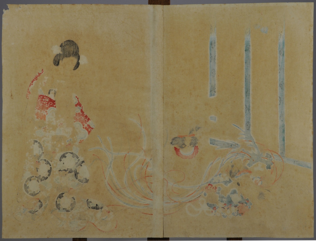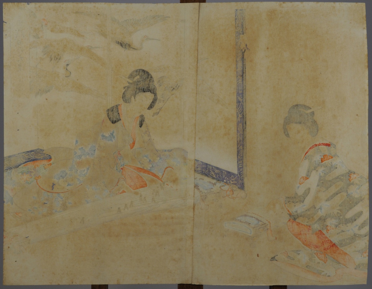 - 2 estampes : Femme aux pékinois - Femmes jouant du koto. Japon, XXe. 47,5 x 36 cm.