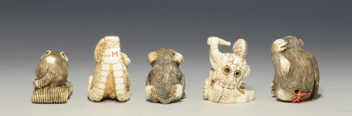 5 NETZUKE en ivoire de mammouth sculpté : rat (Long. 4 cm.), deux singes (Haut. 4 et 3,5 cm), chien (Haut. 3 cm) et buveur de saké (Haut. 3,5 cm, fente).