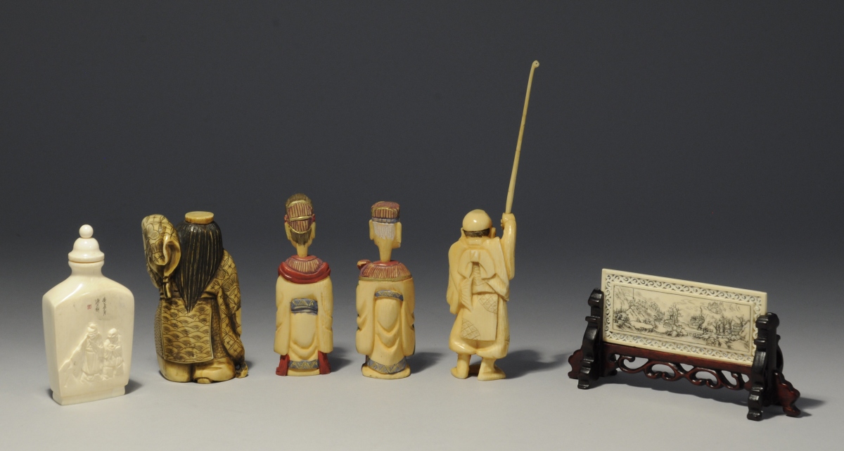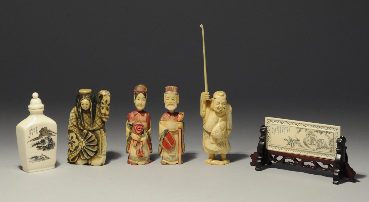 - 3 FLACONS TABATIÈRES en ivoire sculpté dont une paire anthropomorphe polychrome. Haut. 8 cm;