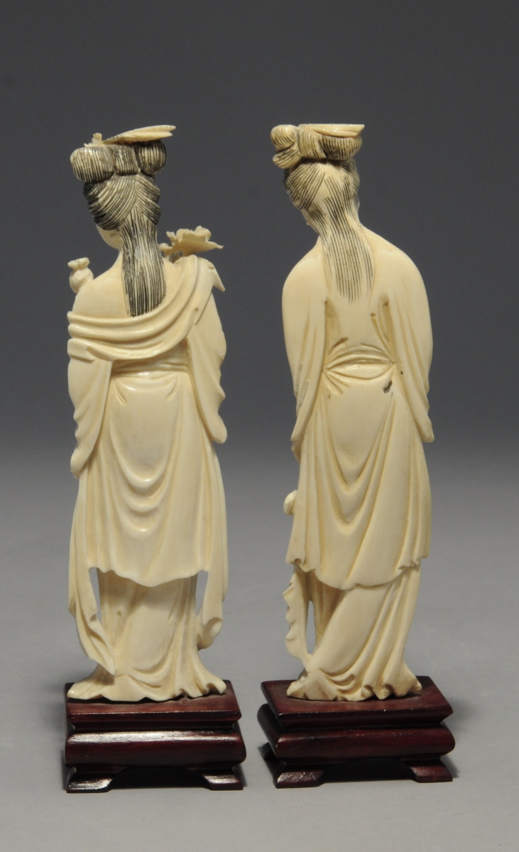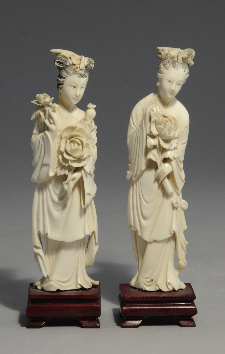 Deux STATUETTES en ivoire sculpté représentant une femme portant des roses. Socle en bois.