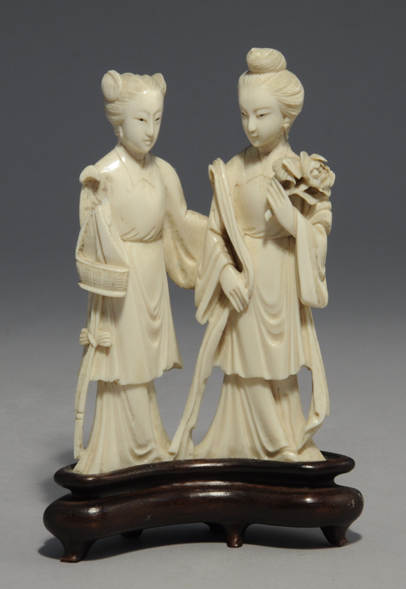 STATUETTE en ivoire sculpté représentant deux femmes, l'une tenant un panier, l'autre une fleur. Socle en bois.