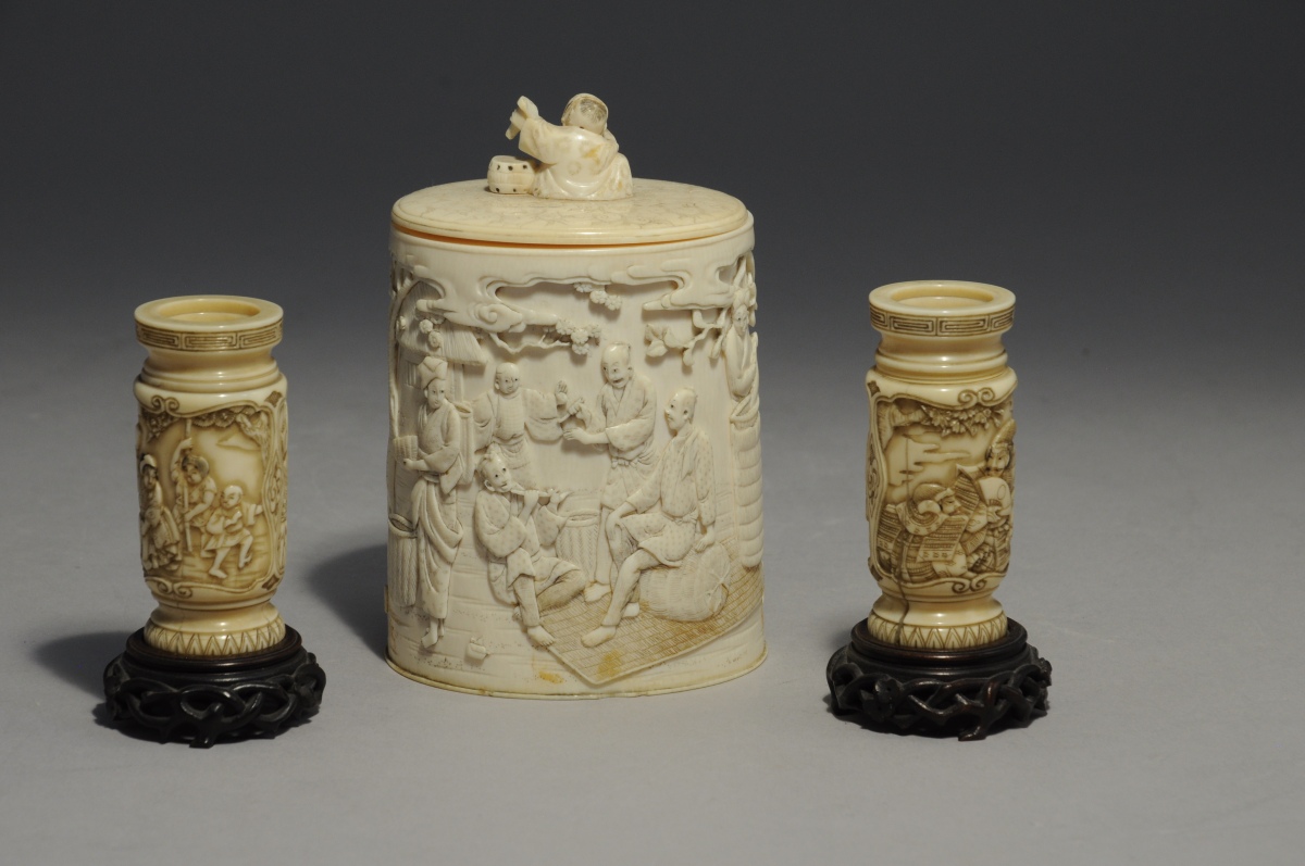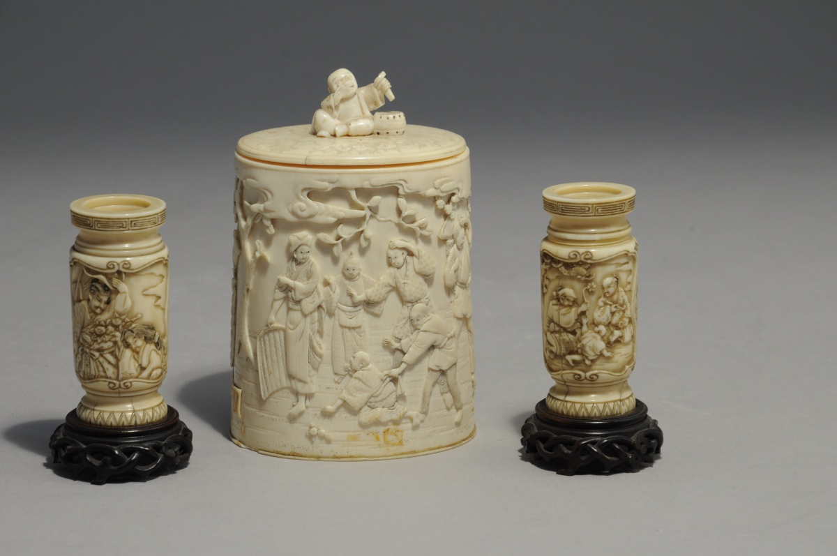 JOINT : Deux petits VASES en ivoire sculpté représentant des scènes de la vie quotidienne. Socle en bois. Première moitié du XXe. Haut. sans le socle 6cm, avec le socle 8cm (fentes).
