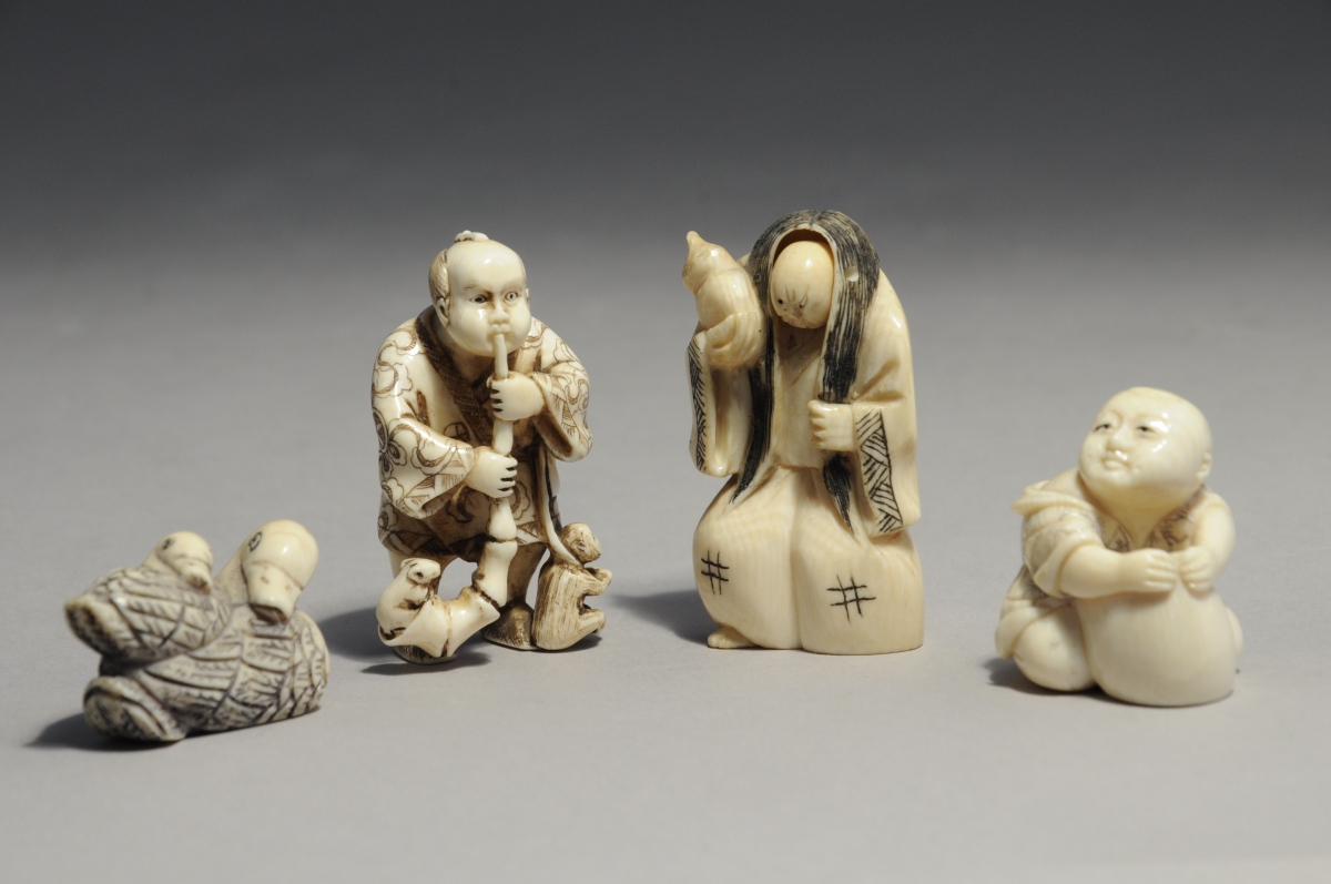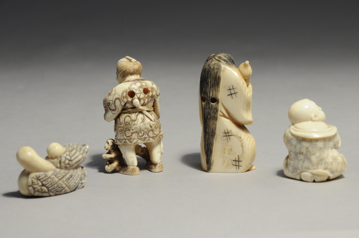 Quatre NETSUKES en ivoire sculpté : canne et caneton; un personnage aux cheveux longs et visage articulé; un joueur de trompe et un personnage enserrant un pot.
