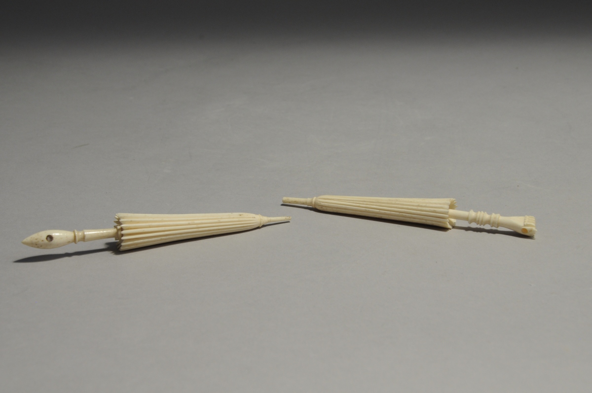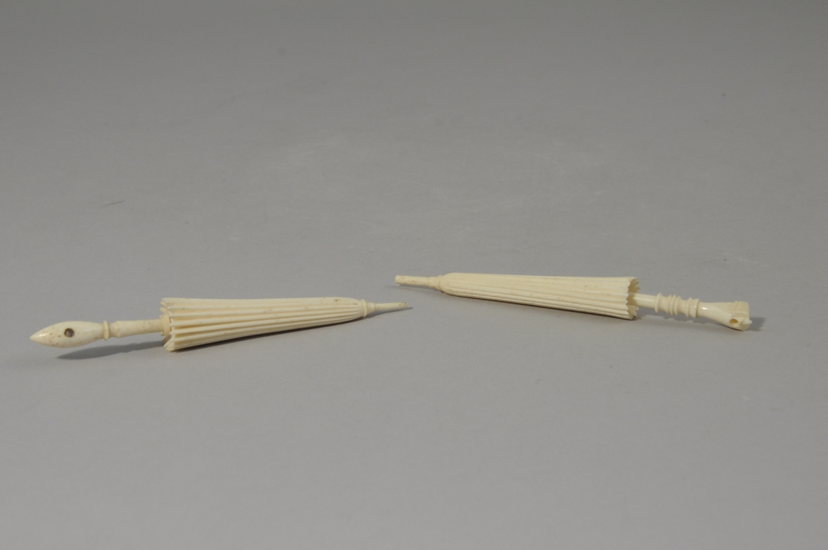 Deux OMBRELLES en os sculpté. L'une a poignée en forme de main.