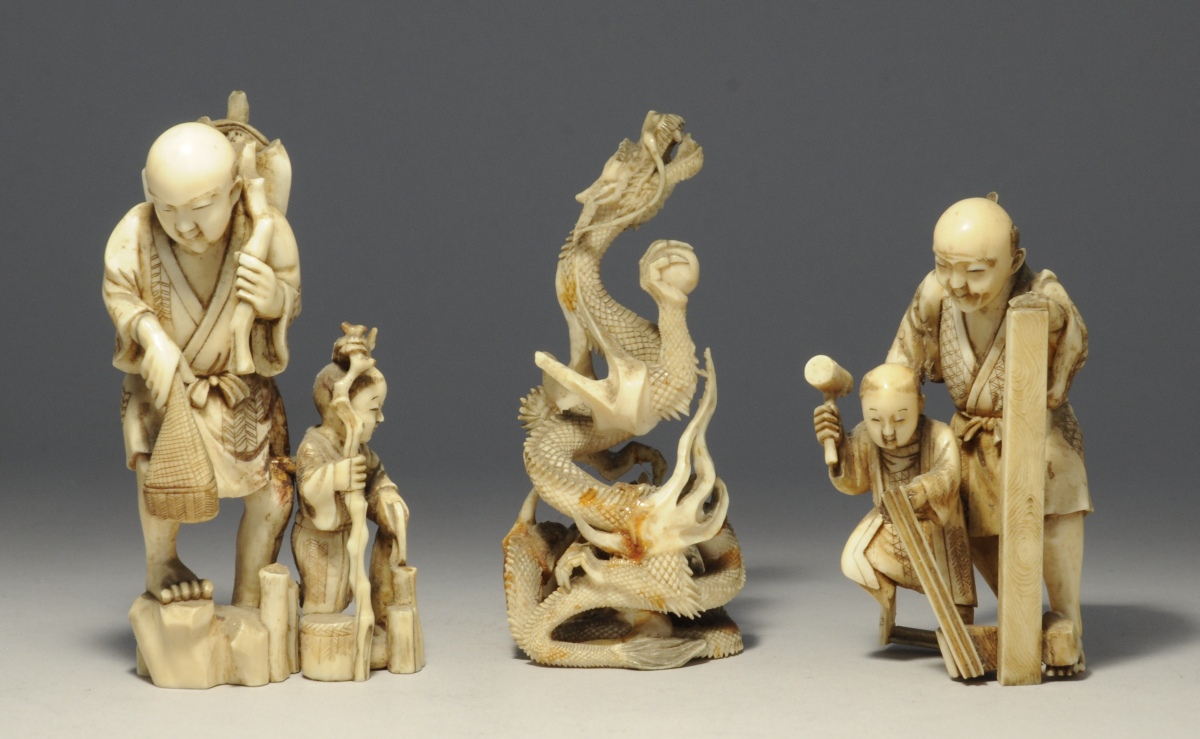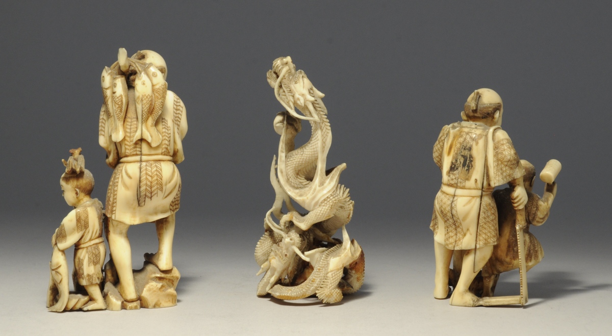 3 OKIMONOS en ivoire sculpté figurant deux dragons chassant la perle sacrée (Haut. 10,5 cm), un pêcheur et son fils (Haut. 11 cm), un charpentier et son apprenti (Haut. 9 cm).