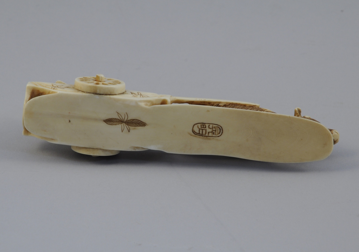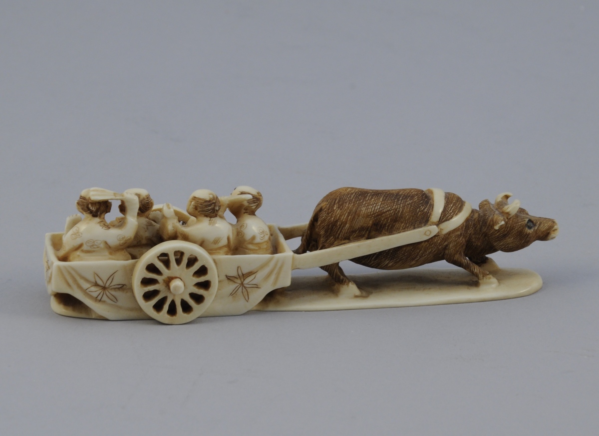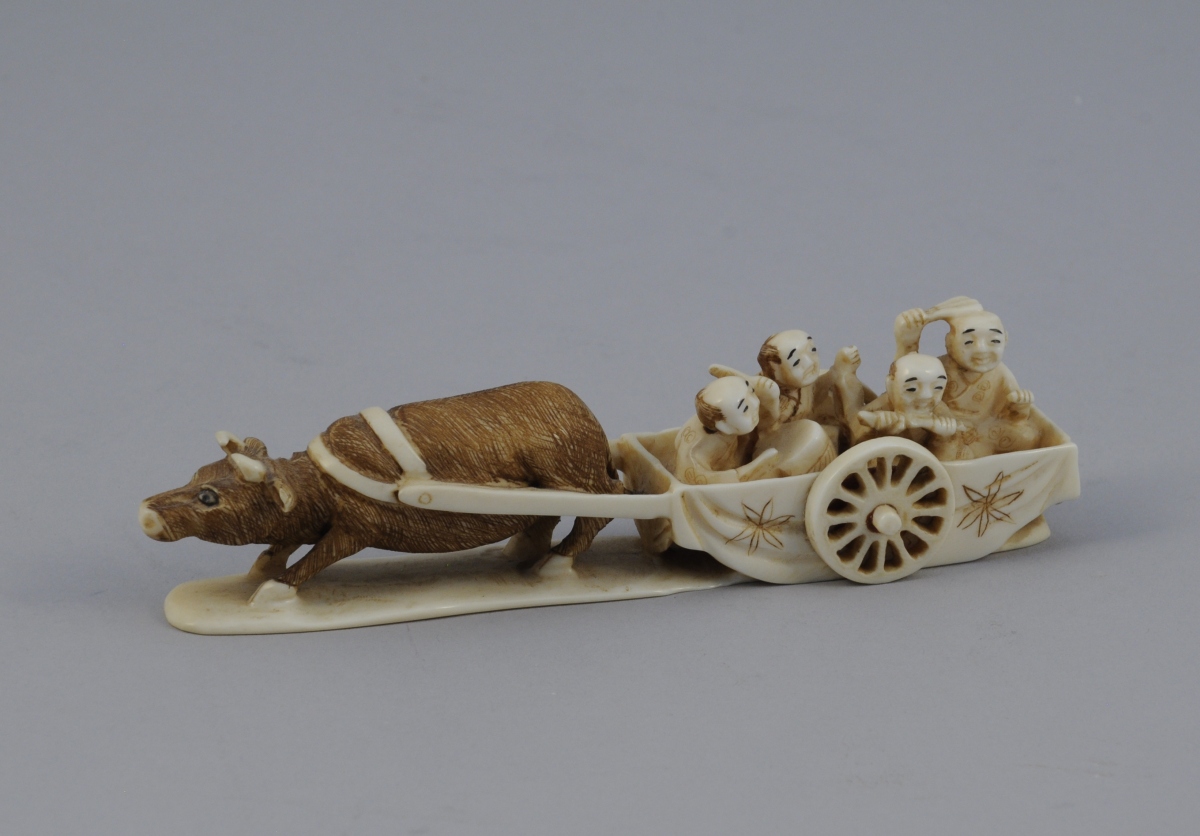 GROUPE en ivoire sculpté figurant quatre musiciens dans un char à bufle. Signé.