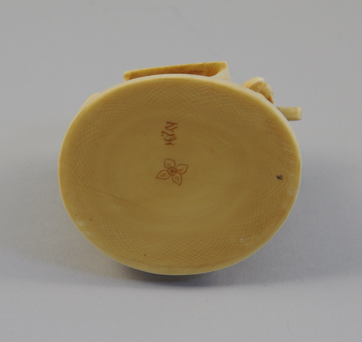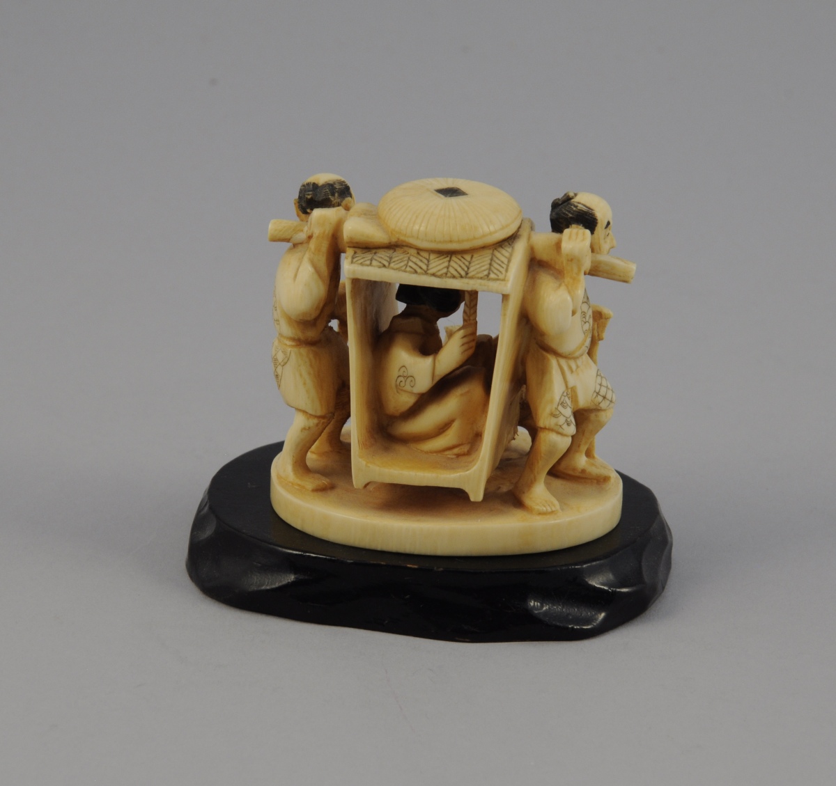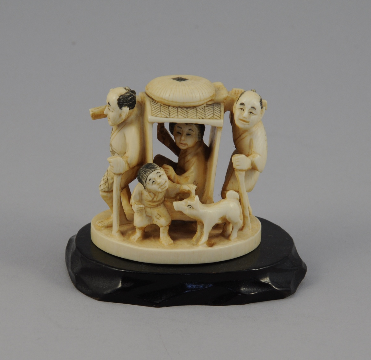 GROUPE en ivoire sculpté figurant une femme dans une chaise à porteurs avec un enfant caressant un chien. Signé.