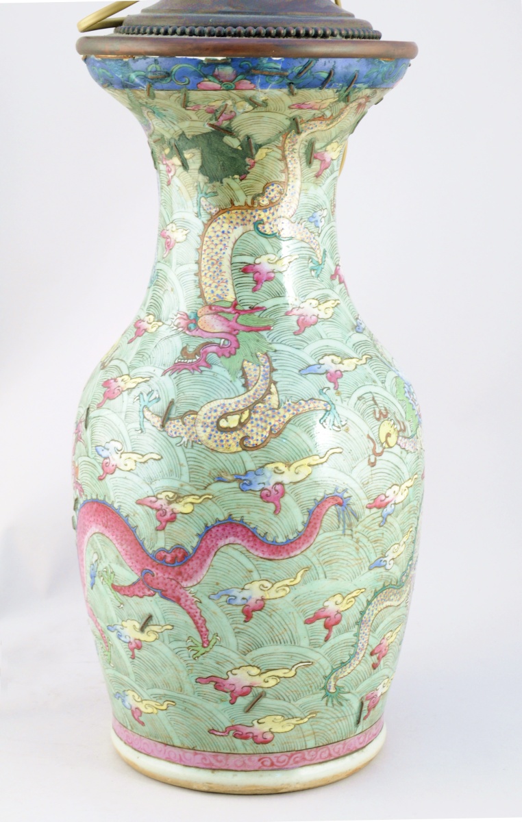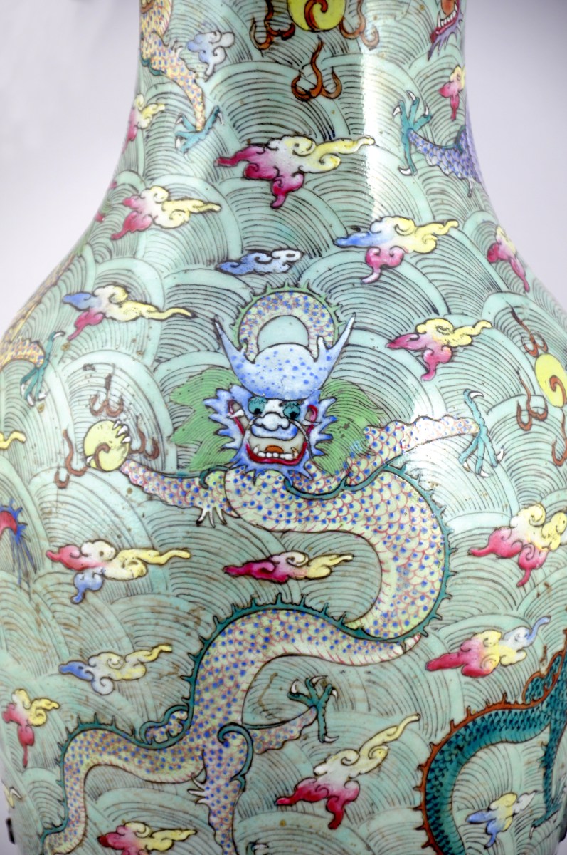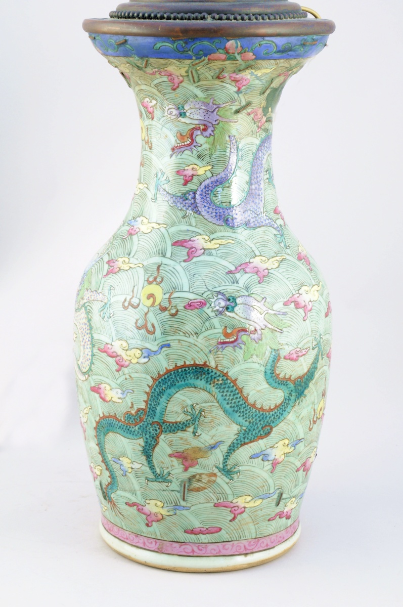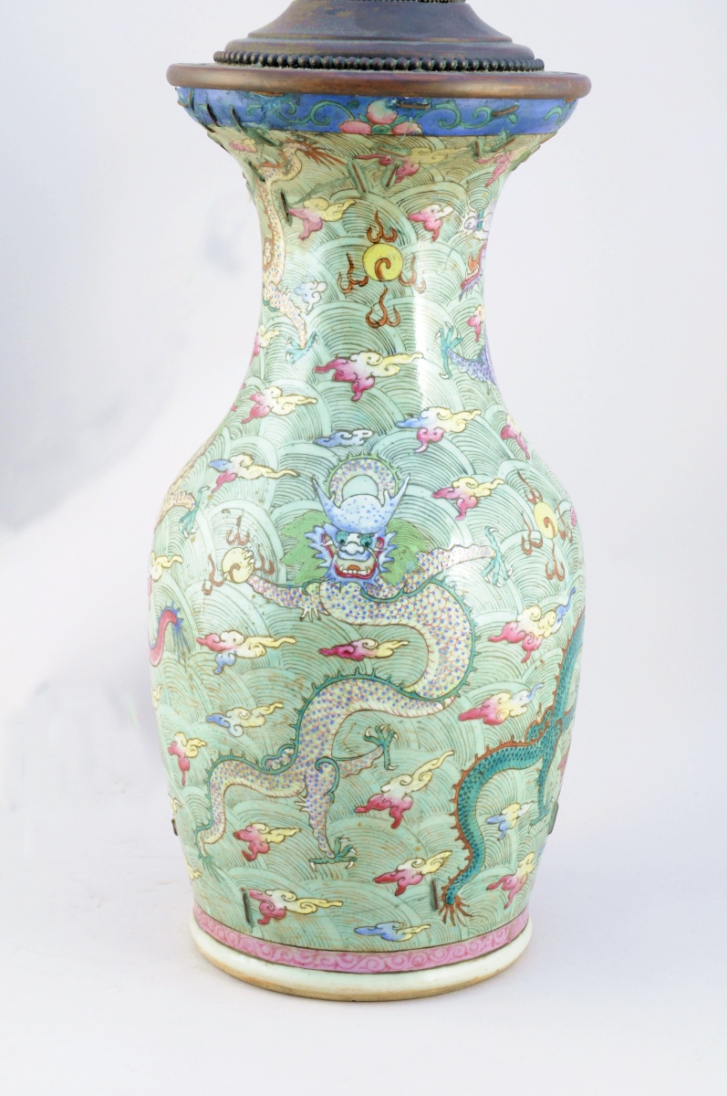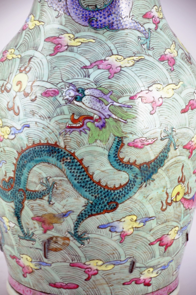 CHINE. VASE balustre en porcelaine à décor polychrome de dragons pourchassant la perle sacrée dans des nuées.