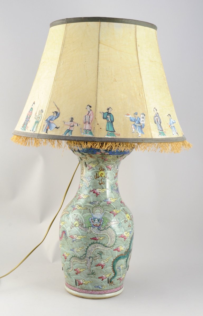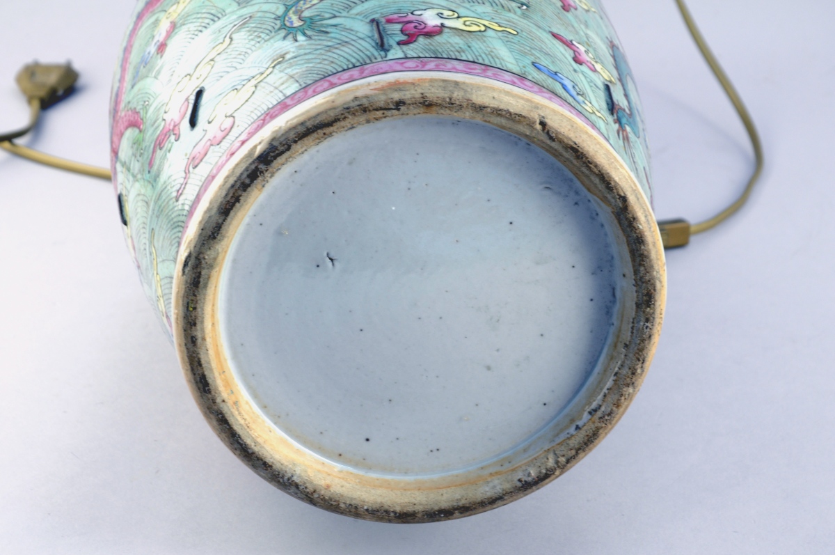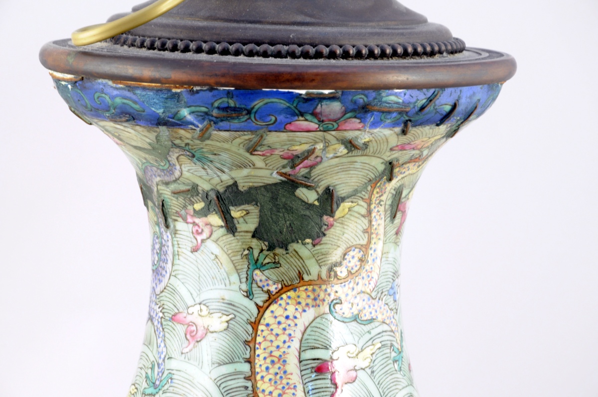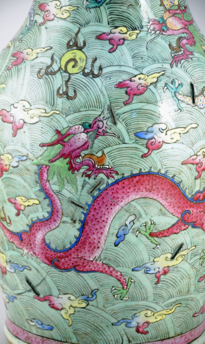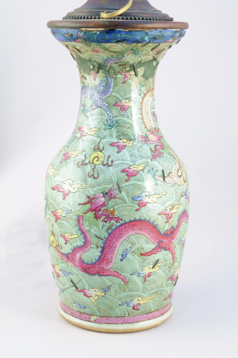 CHINE. VASE balustre en porcelaine à décor polychrome de dragons pourchassant la perle sacrée dans des nuées.