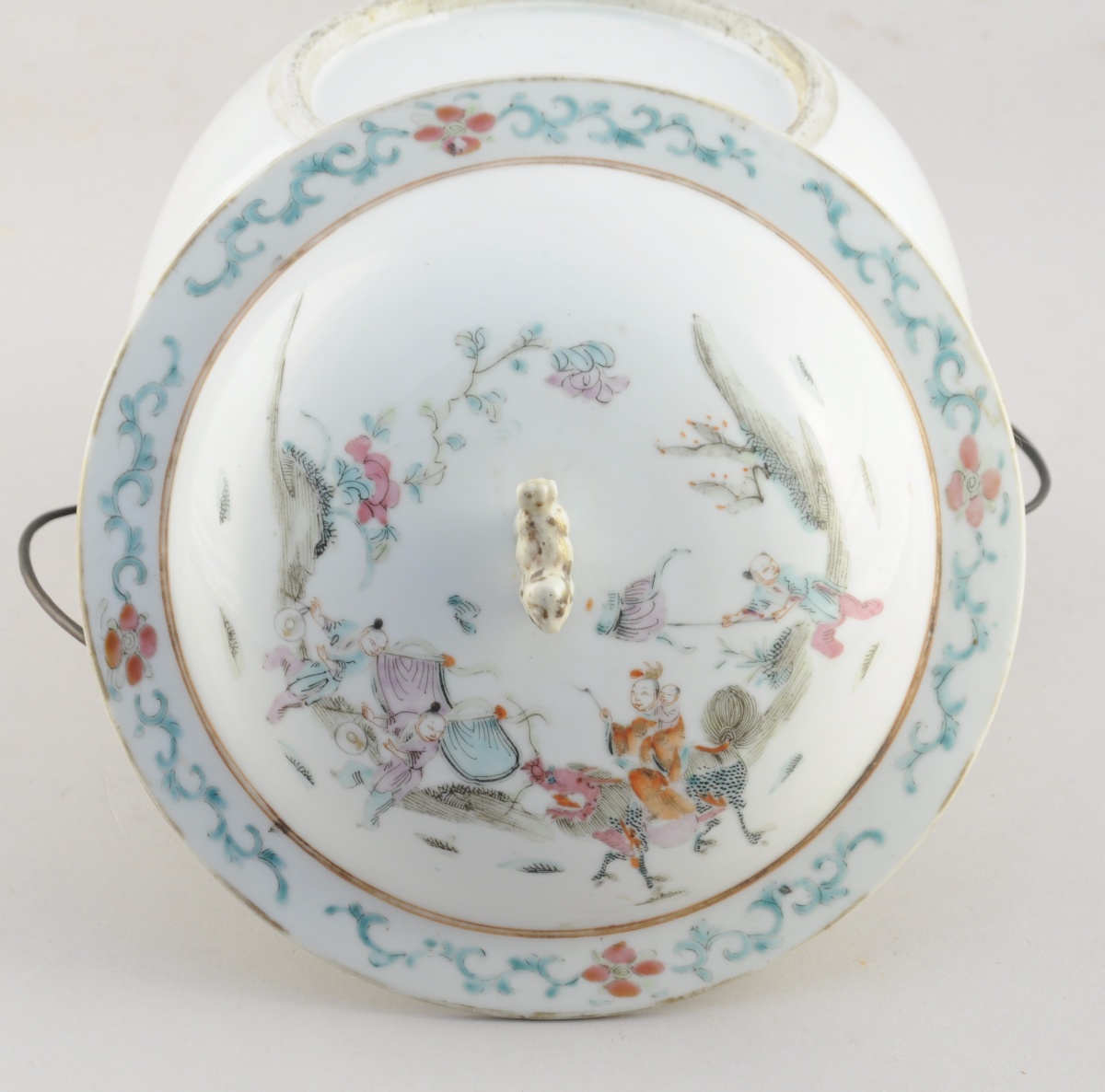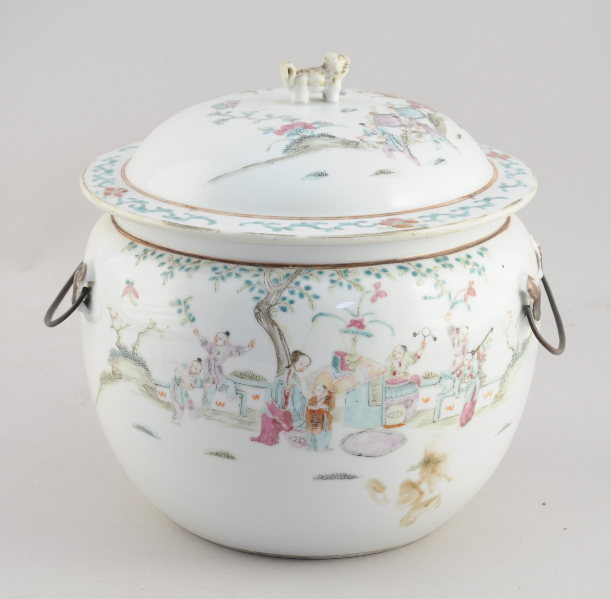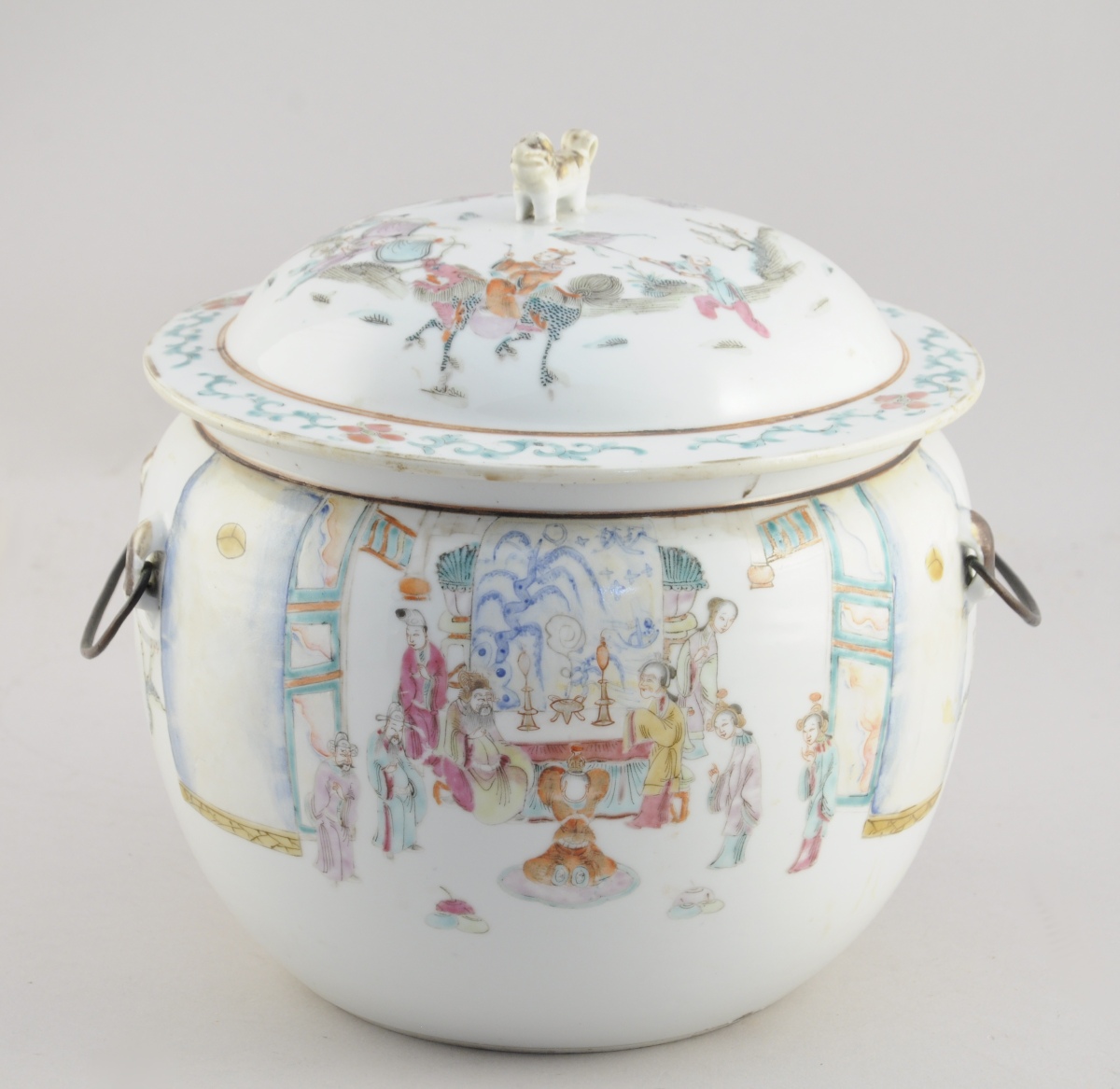 CHINE. POT COUVERT de forme circulaire en porcelaine décoré d'amux à motifs de scènes de palais et de concerts dans des jardins. Prise en chien de Fô. Anses métalliques. Marque rouge.