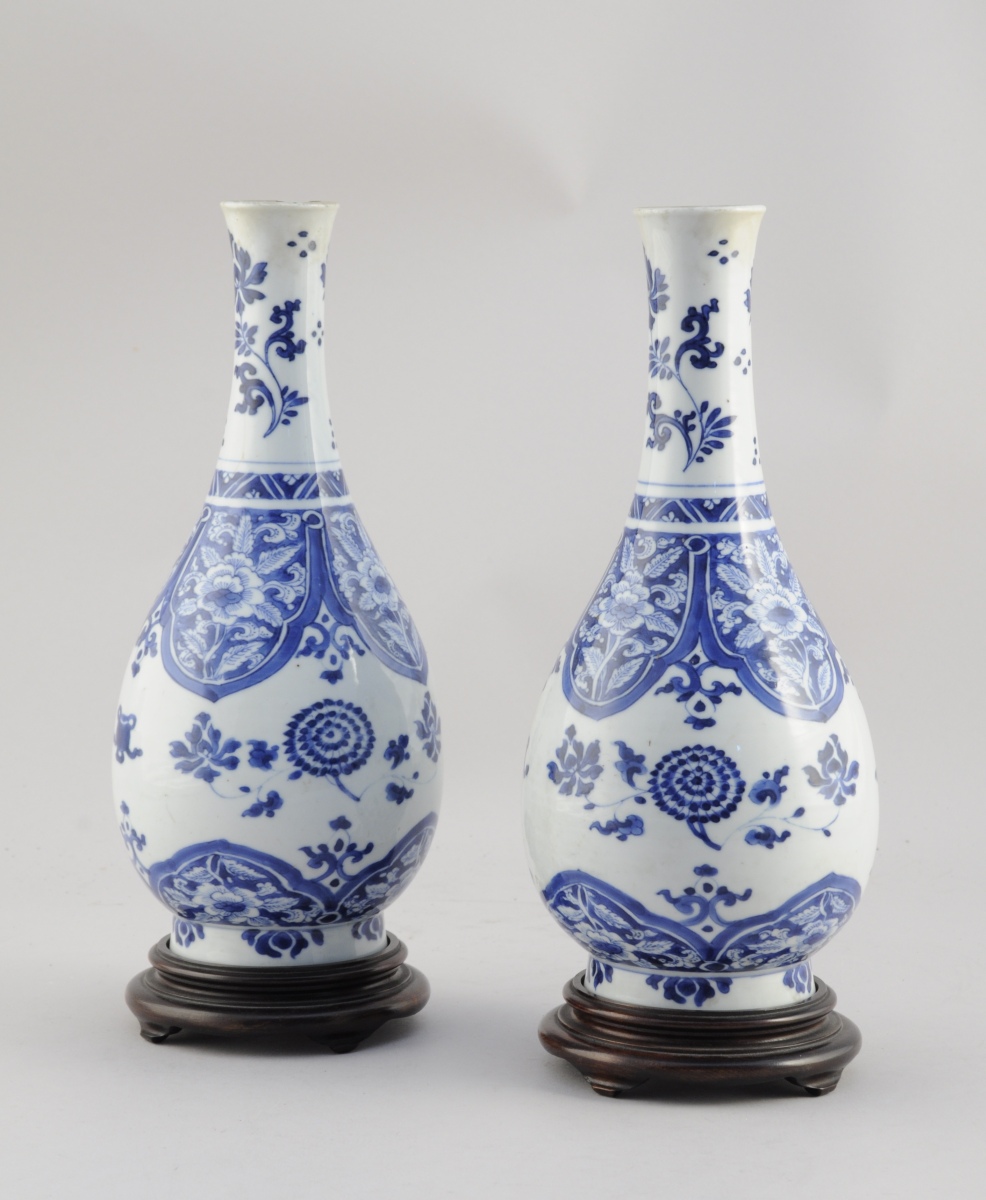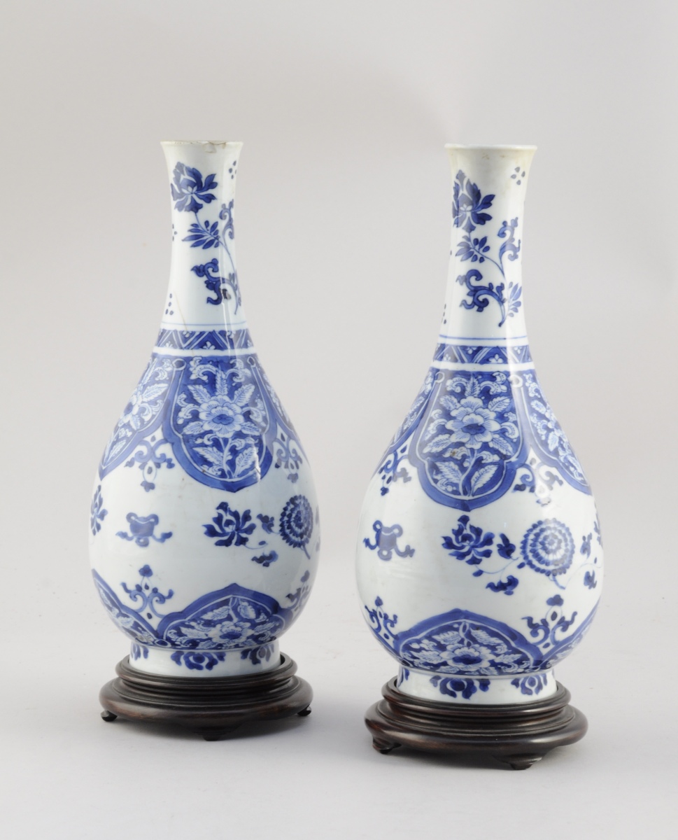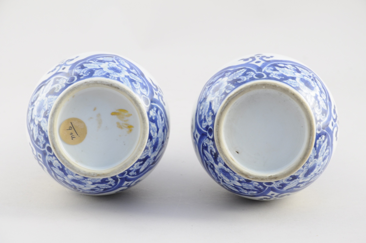 CHINE. Paire de VASES en porcelaine bleue et blanche à décor de chrysanthèmes et de joyaux bouddhiques, ainsi que d'une frise de fleurs s'inscrivant dans des pétales.